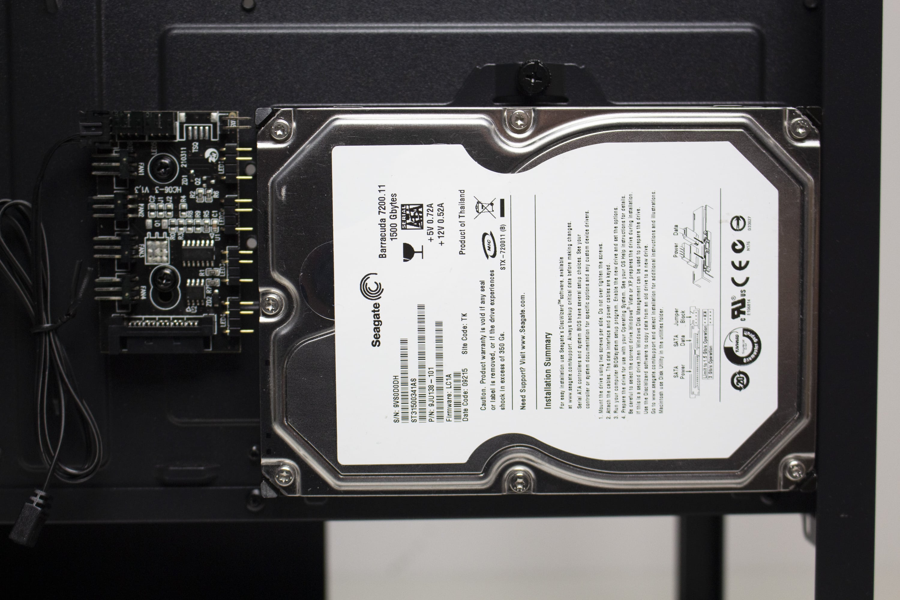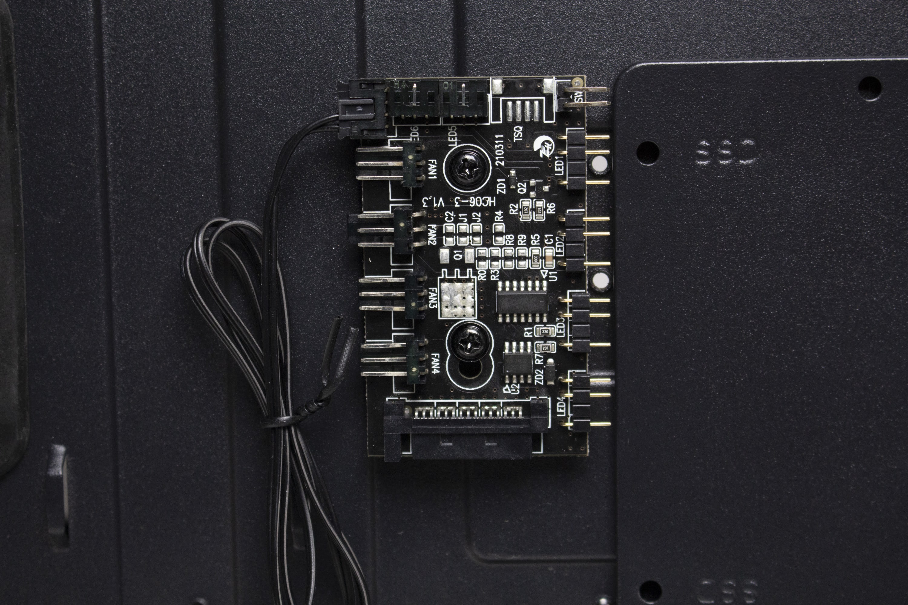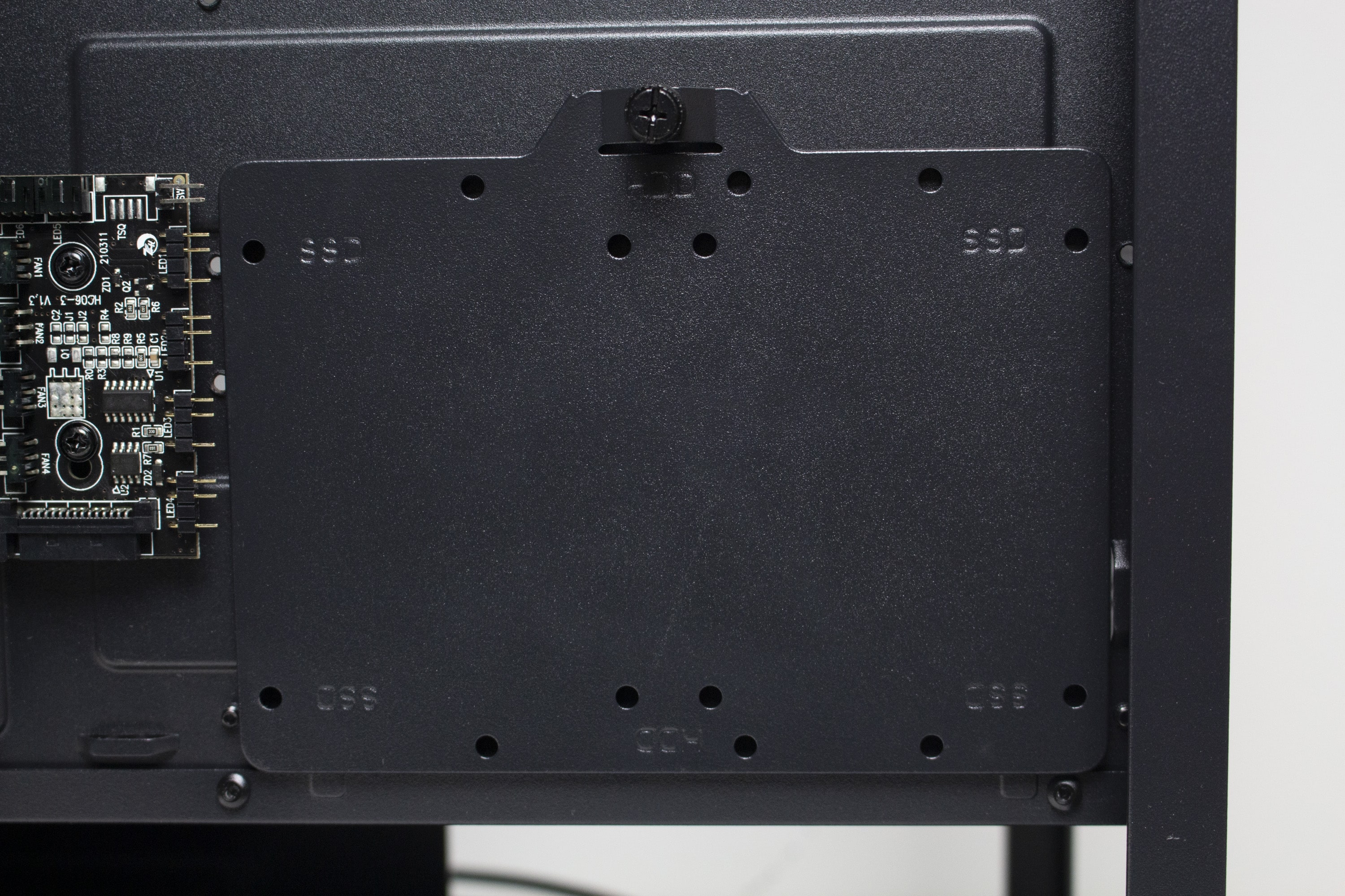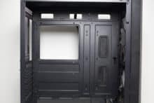 Die Rückseite des Mainboard-Trays bietet vor allem viel Platz für Kabel und zahlreiche Ösen für Kabelbinder. Durch die bis zu 28 Millimeter Raum sollte sich das Verlegen der Netzteilkabel sehr einfach gestalten. Ansonsten finden sich an der Rückseite noch die Steuerplatine für die Lüfter sowie weitere Montagemöglichkeiten für Festplatten.