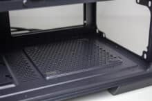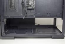 Ein Blick in die Netzteilkammer zeigt die Montageposition für das Netzteil, welche über vier dünne Gummielemente verfügt, die zur Entkopplung dienen sollen. Davor platziert der Hersteller einen modularen Rahmen aus Stahl, in dem Festplatten befestigt werden können. Je nach Länge des Netzteils kann der HDD-Käfig verschoben oder komplett ausgebaut werden.