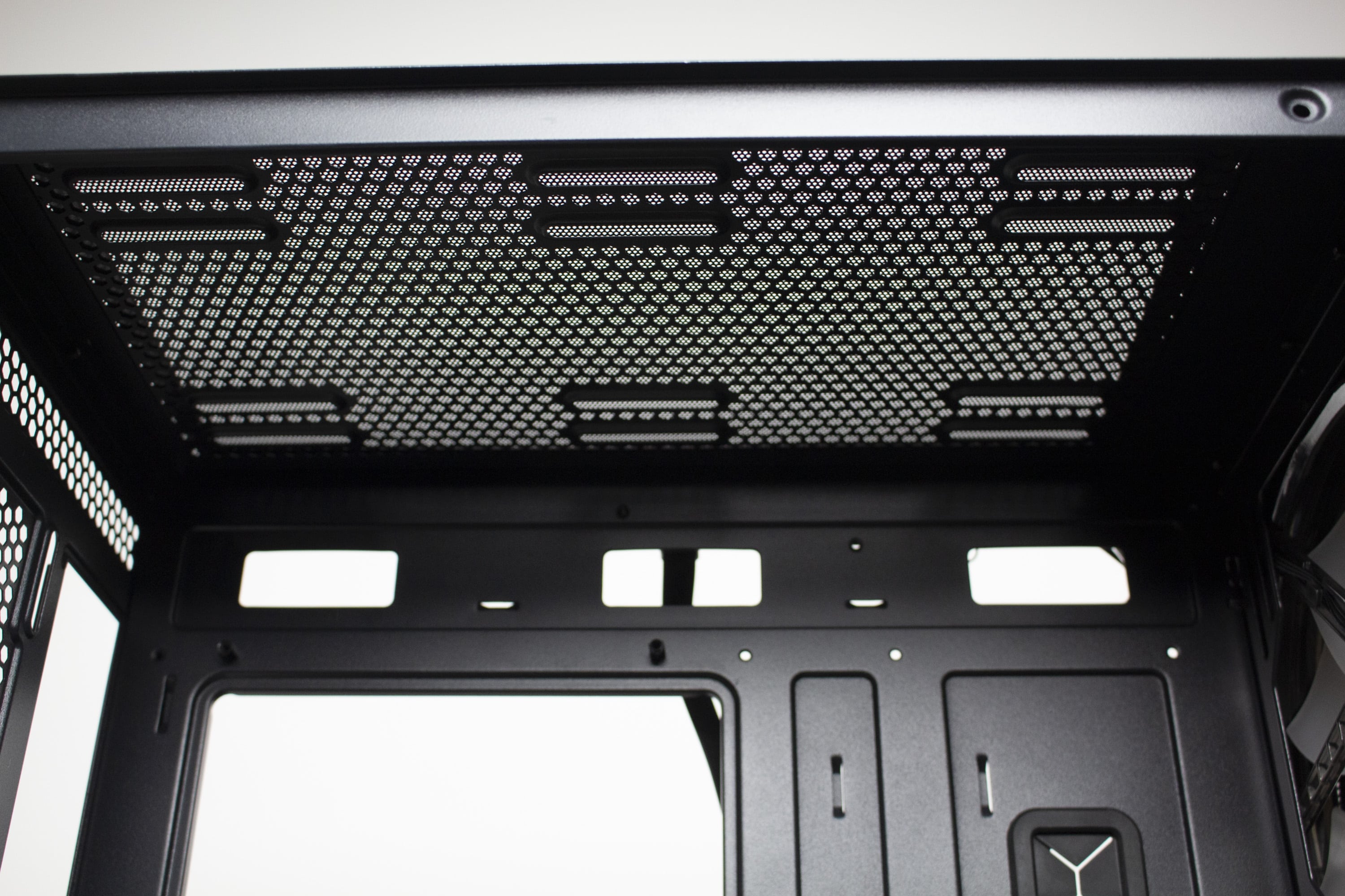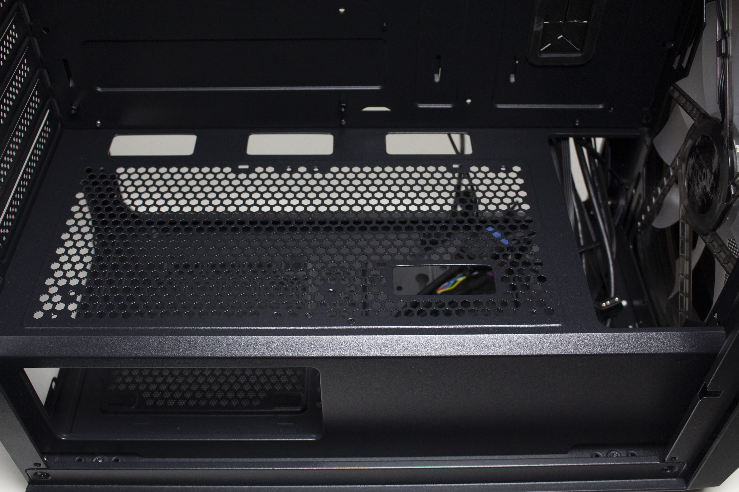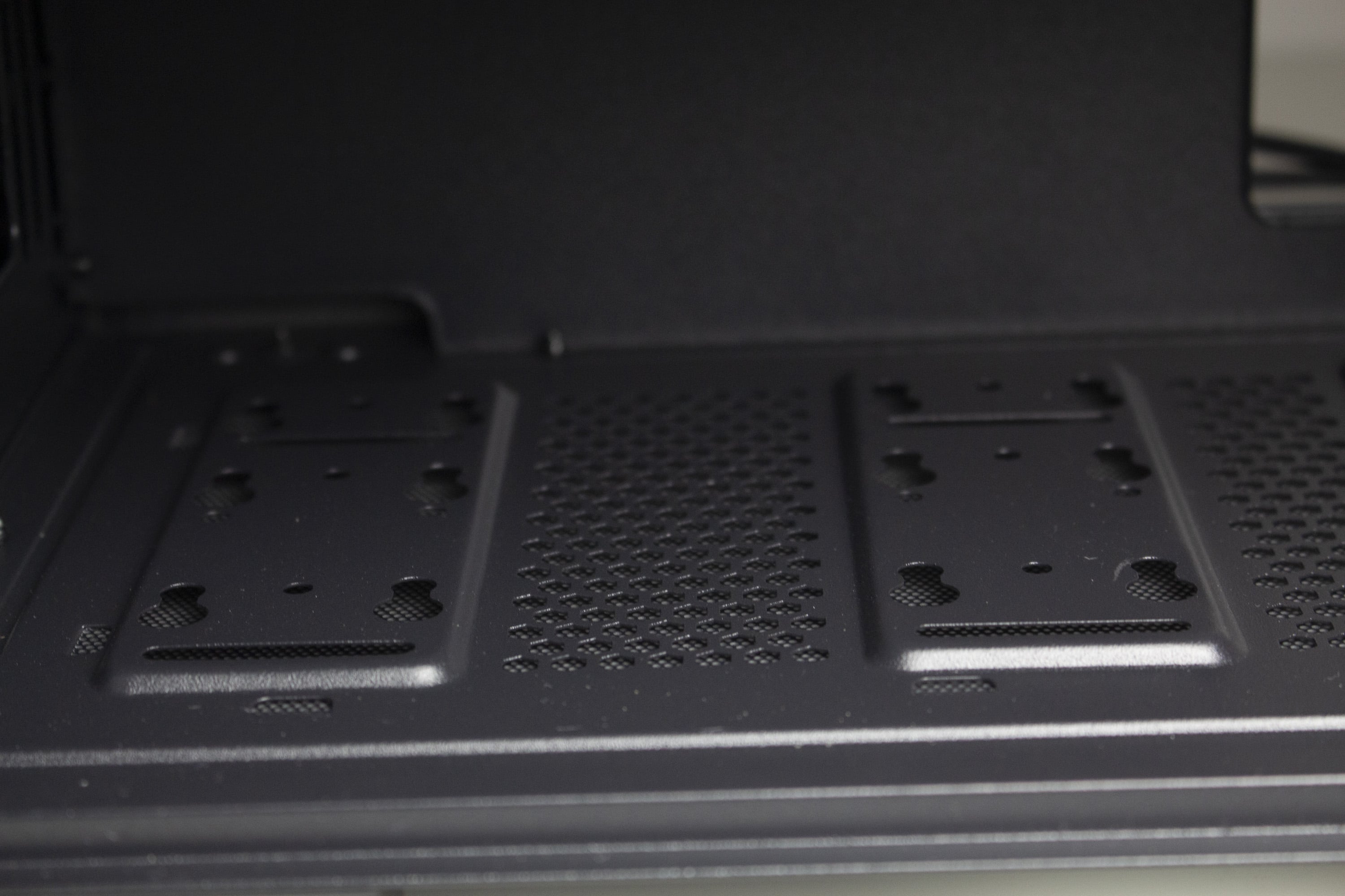 Senkt man den Blick, dürfte direkt die Netzteilabdeckung ins Auge fallen. Diese verfügt über zahlreiche Öffnungen für Kabel, diverse Belüftungslöcher sowie einen Ausschnitt für einen Frontradiator bzw. zur Betrachtung des Typenschilds vom Netzteil. Besonders das Loch für das Stromkabel zur Grafikkarte dürfte das fertige System deutlich aufgeräumter erscheinen lassen. Außerdem wurde die Abdeckung mit Montagepunkten für zwei 120-mm-Lüfter ausgestattet. Entsprechende Schrauben liegen dem Zubehör aber leider nicht bei.