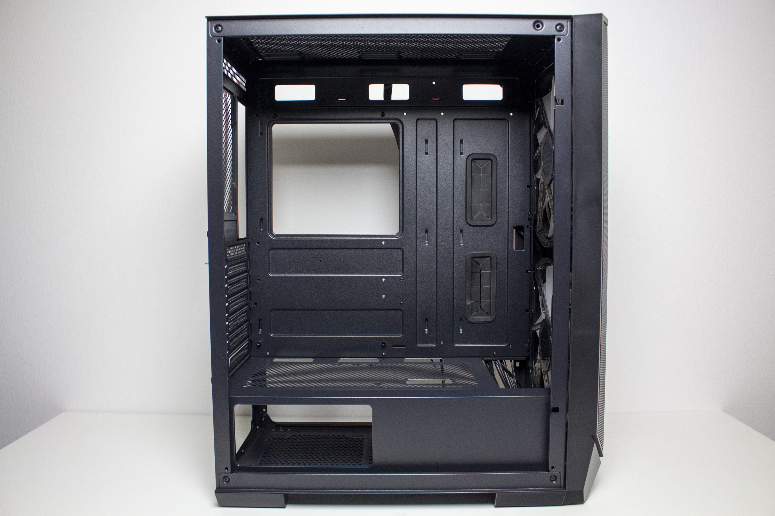 Der Innenraum des Inter-Tech IT-3503 AIRSTREAM zeigt sich in einem modernen Erscheinungsbild. Der Hersteller unterteilt den Innenraum in eine große Hauptkammer sowie eine separate Netzteilkammer. Die große Hauptkammer bietet Platz für ATX-Mainboards, lange Grafikkarten und große CPU-Kühler. Das Mainboard-Tray wurde plan gestaltet und verfügt über diverse, teilweise auch gummierte Öffnungen für das Kabelmanagement. Die zwei vorinstallierten Gehäuselüfter können aufgrund nicht vorhandener HDD-Käfige ungehindert frische Luft in den Innenraum befördern.