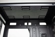 Die Gestaltung der Deckelpartie fällt ebenfalls luftig aus. So wird der Deckel von einem großen Lüftergitter dominiert, an welchem wahlweise zwei 120- oder zwei 140-mm-Lüfter bzw. entsprechende Radiatoren befestigt werden können. Durch das Schienensystem ist eine flexible Positionierung möglich. Zum Schutz vor Staub hat Inter-Tech der Oberseite zudem einen magnetischen Meshfilter spendiert. Ebenfalls im Deckel finden wir das I/O-Panel. Dieses verfügt über insgesamt vier USB-Ports (1x USB-C 3.1, 1x USB-A 3.0, 2x USB-A 2.0), zwei Buchsen für Kopfhörer bzw. Mikrofon sowie zwei Taster für Power bzw. Reset/LED. Weiterhin lassen sich zwei LEDs für Power (blau) und die HDD-Aktivität (rot) erkennen.