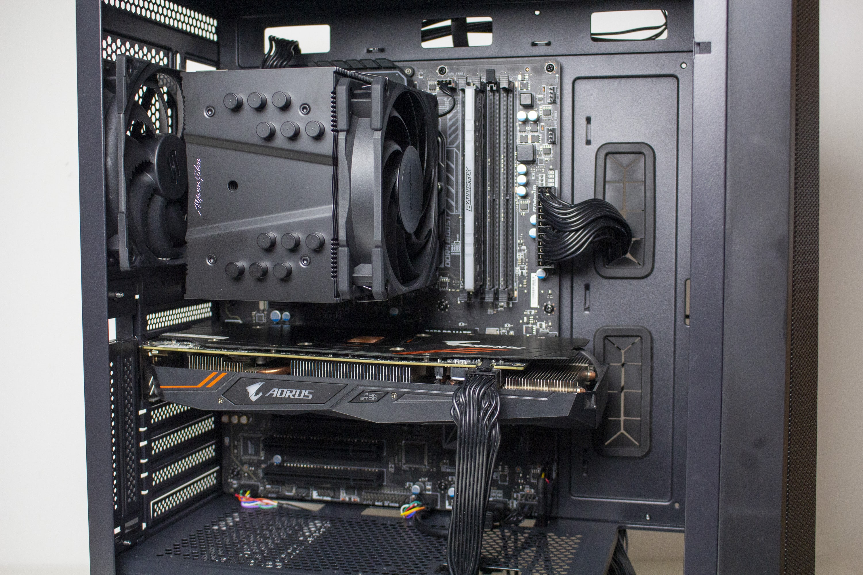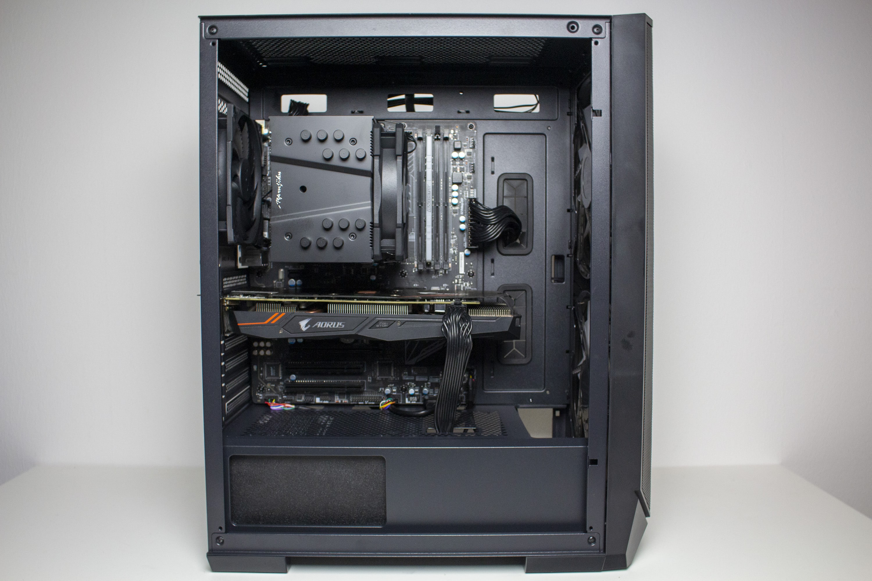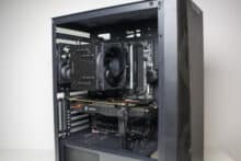 Nun kommen wir zum Systemeinbau beim Inter-Tech IT-3503 AIRSTREAM Test. Als Hardware verwenden wir einen AMD Ryzen 5 1400 auf einem MSI B350 PC Mate mit 16GB Crucial Ballistix Sport LT grau DDR4-2666. Der Ryzen wird von einem Alpenföhn Brocken 4* gekühlt und ist auf 3,8 GHz (1,25 V) übertaktet. Für die Bildausgabe ist eine GTX 1060 6GB von Gigabyte AORUS zuständig. Die Stromversorgung erledigt das vollmodulare LC-Power LC550 V2.31 Platinum mit einem Effizienzgrad von 80 Plus Platinum.