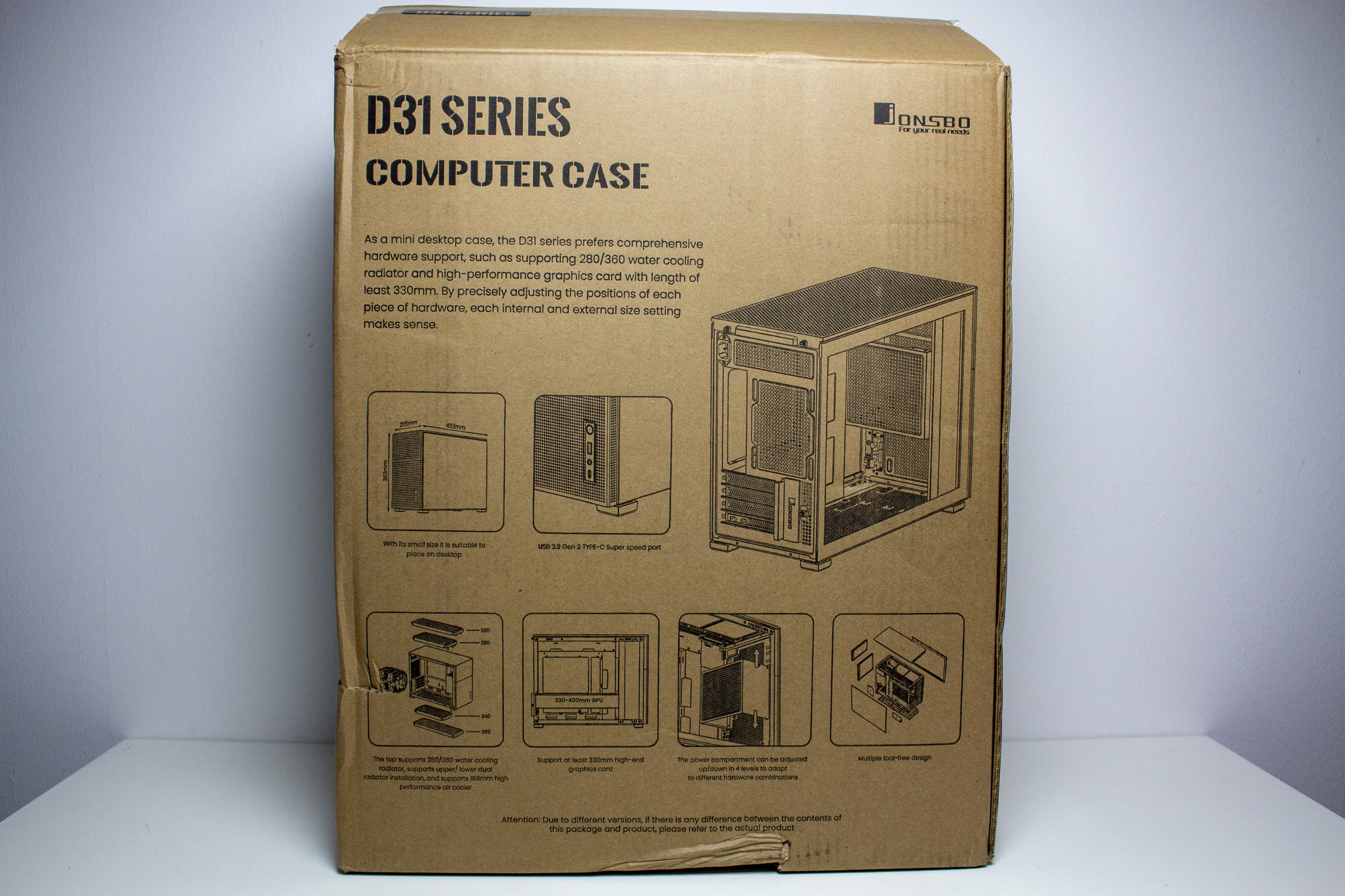 Jonsbo verpackt das D31 MESH Screen in einem schlichten Karton aus brauner Pappe. Neben dem Namen des Mini-Towers finden wird auch eine Schemazeichnung des D31 auf der Umverpackung sowie weitere Abbildungen, welche die grundlegenden Spezifikationen des Gehäuses bildlich aufzeigen. Zuletzt gibt es natürlich auch noch eine klassische Auflistung mit allen relevanten, technischen Daten. Alle Abbildungen und Wörter wurden mit schwarzer Farbe auf den Karton gedruckt.