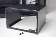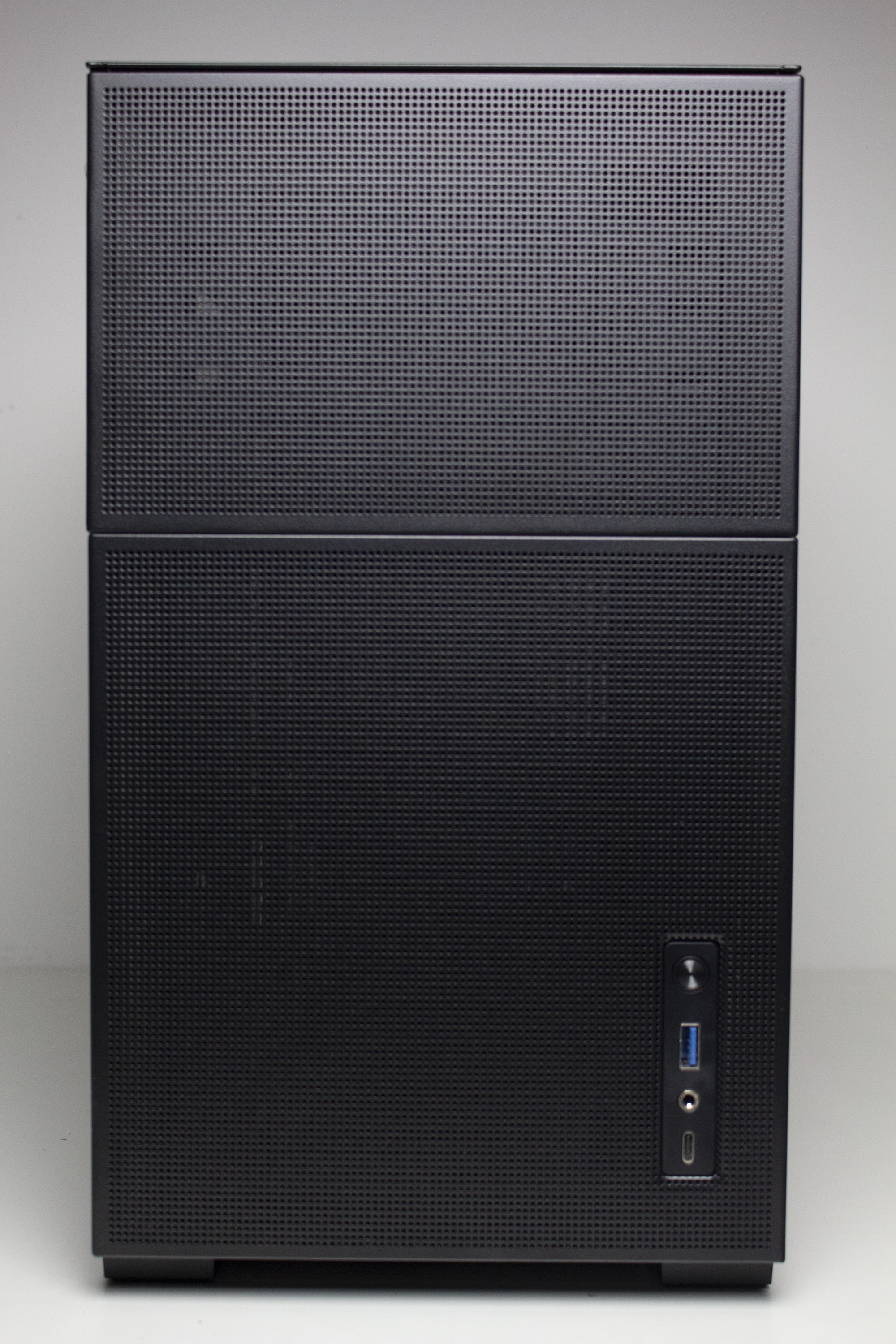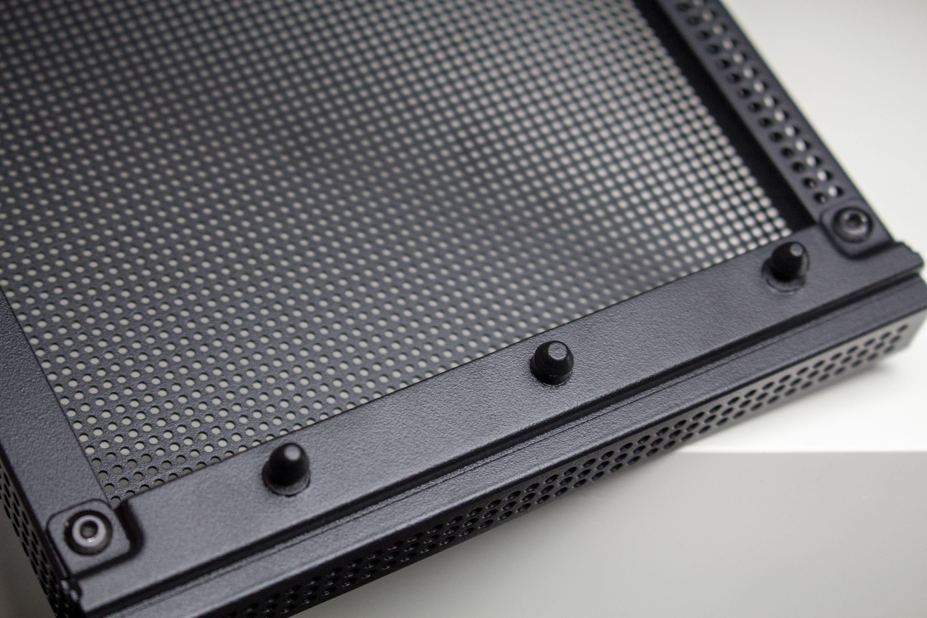 Jonsbo gestaltet das D31 MESH Screen grundsätzlich erstmal relativ zurückhaltend. So besteht das zweiteilige Frontpanel im unteren Bereich aus Stahl mit einem rechteckigem Mesh und im oberen Bereich verbaut der Hersteller das Displayelement mit einem eingebauten 8-Zoll Bildschirm. Sowohl das Mesh-Panel als auch das Display verfügen über Push-Pins und können deshalb ohne Werkzeug abgebaut werden. Hinter den Panels erkennen wir den perforierten Korpus, der über vier verschiedene Montagepositionen für den Netzteilrahmen sowie einen Montageplatz für einen 120-mm-Lüfter verfügt. Alternativ kann anstatt des Bildschirms auch das zweite Mesh-Panel montiert werden, welches dem Zubehör beiliegt. Einen Staubfilter gibt es an der Front nicht.