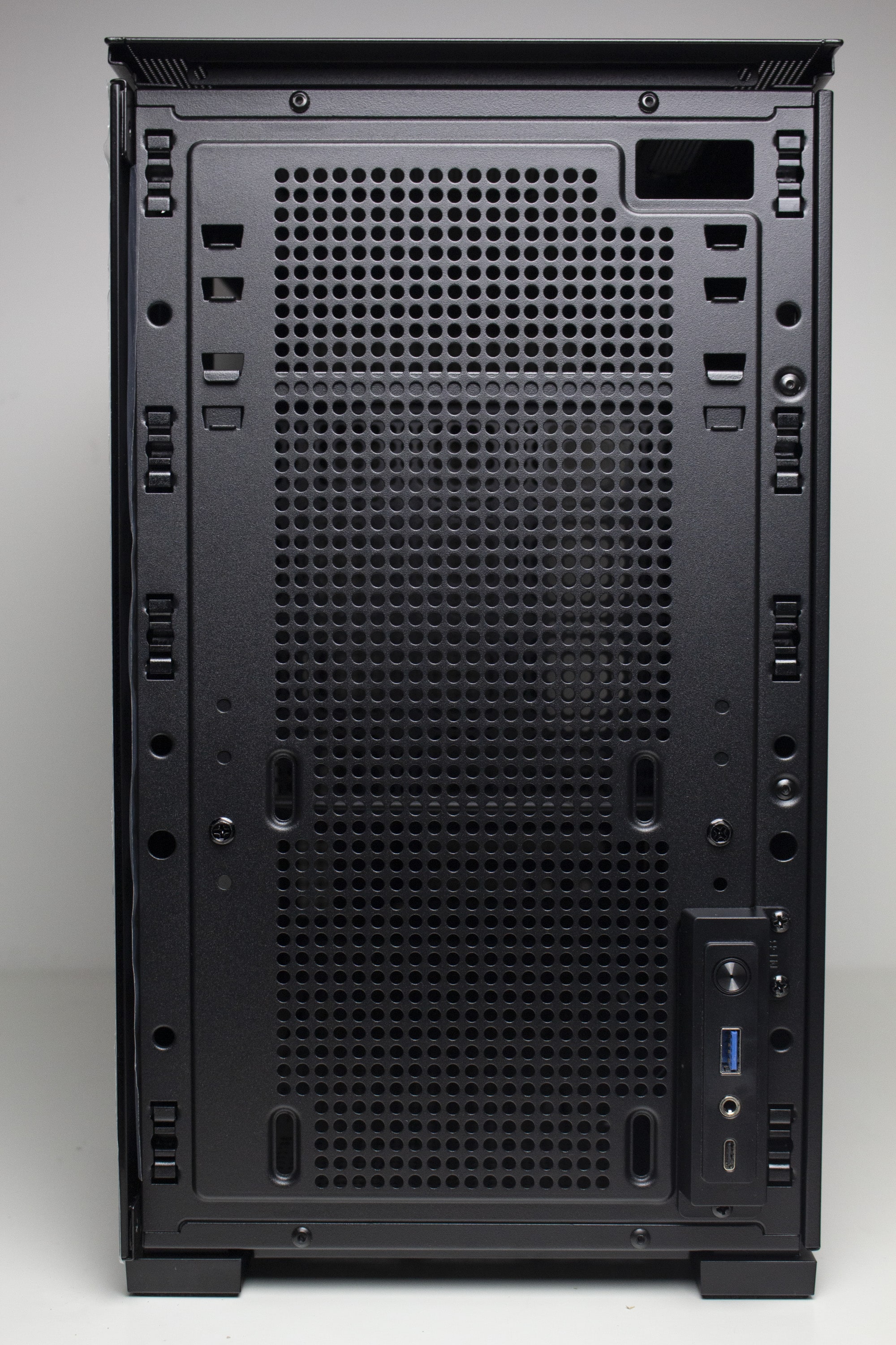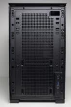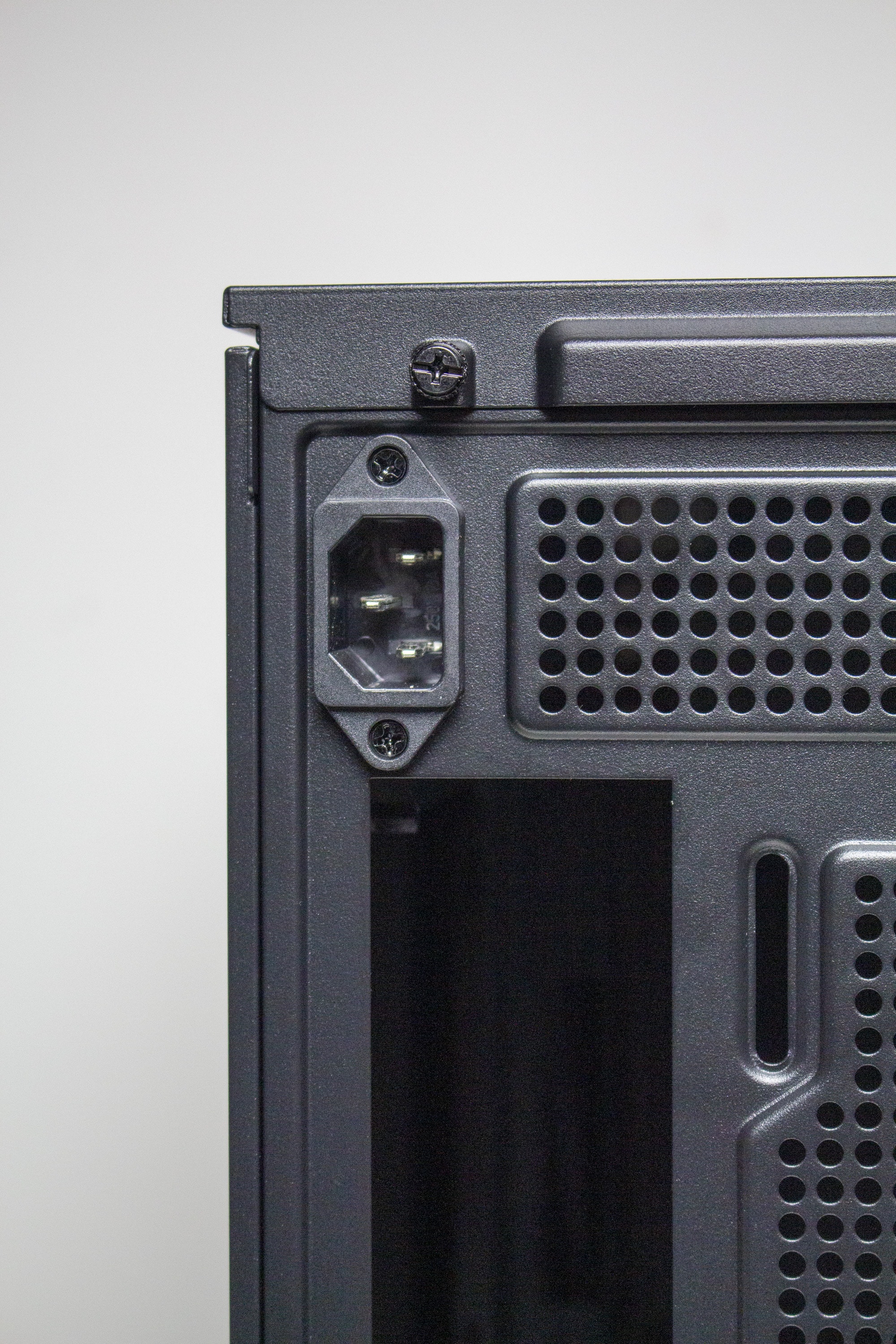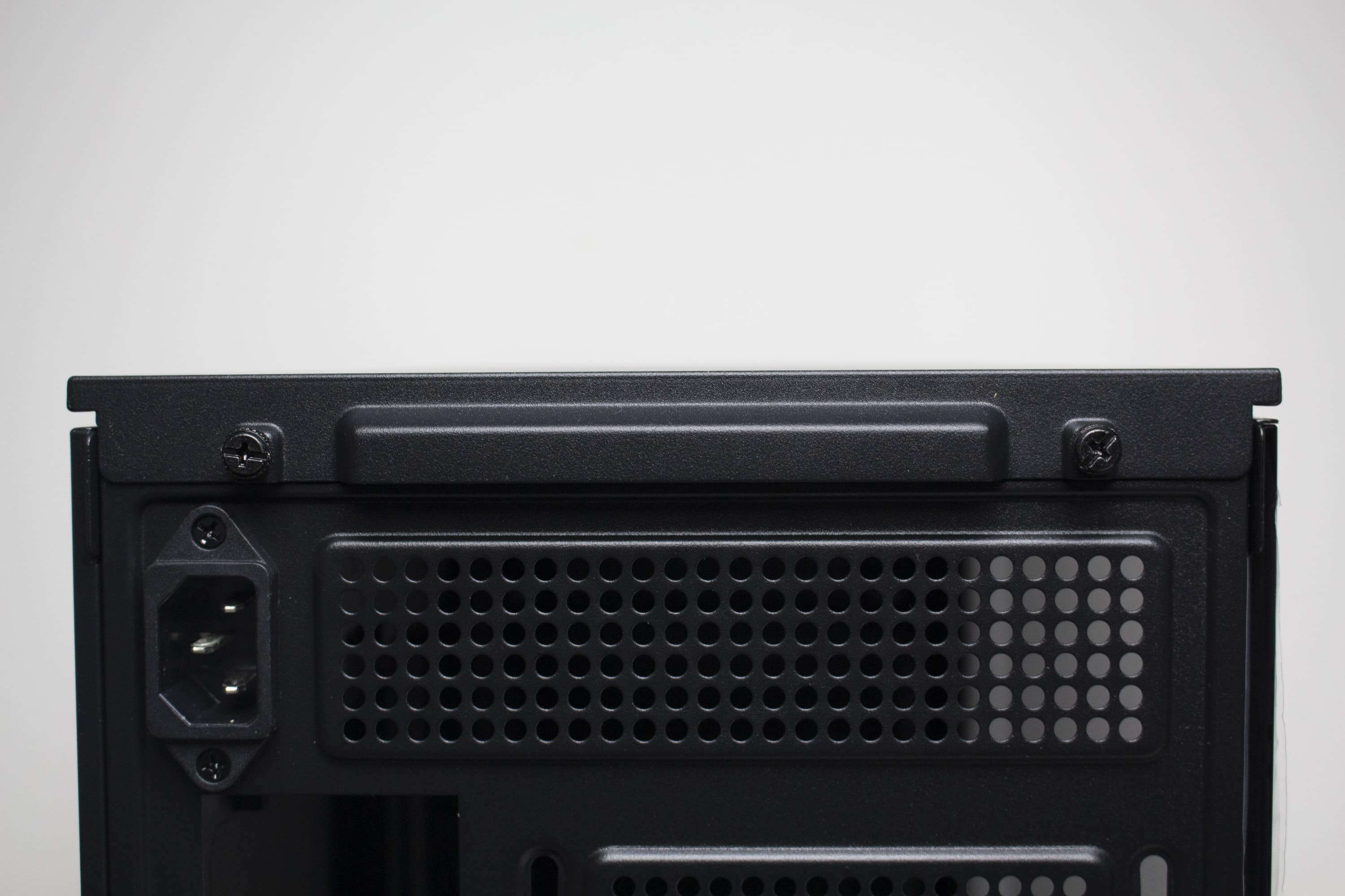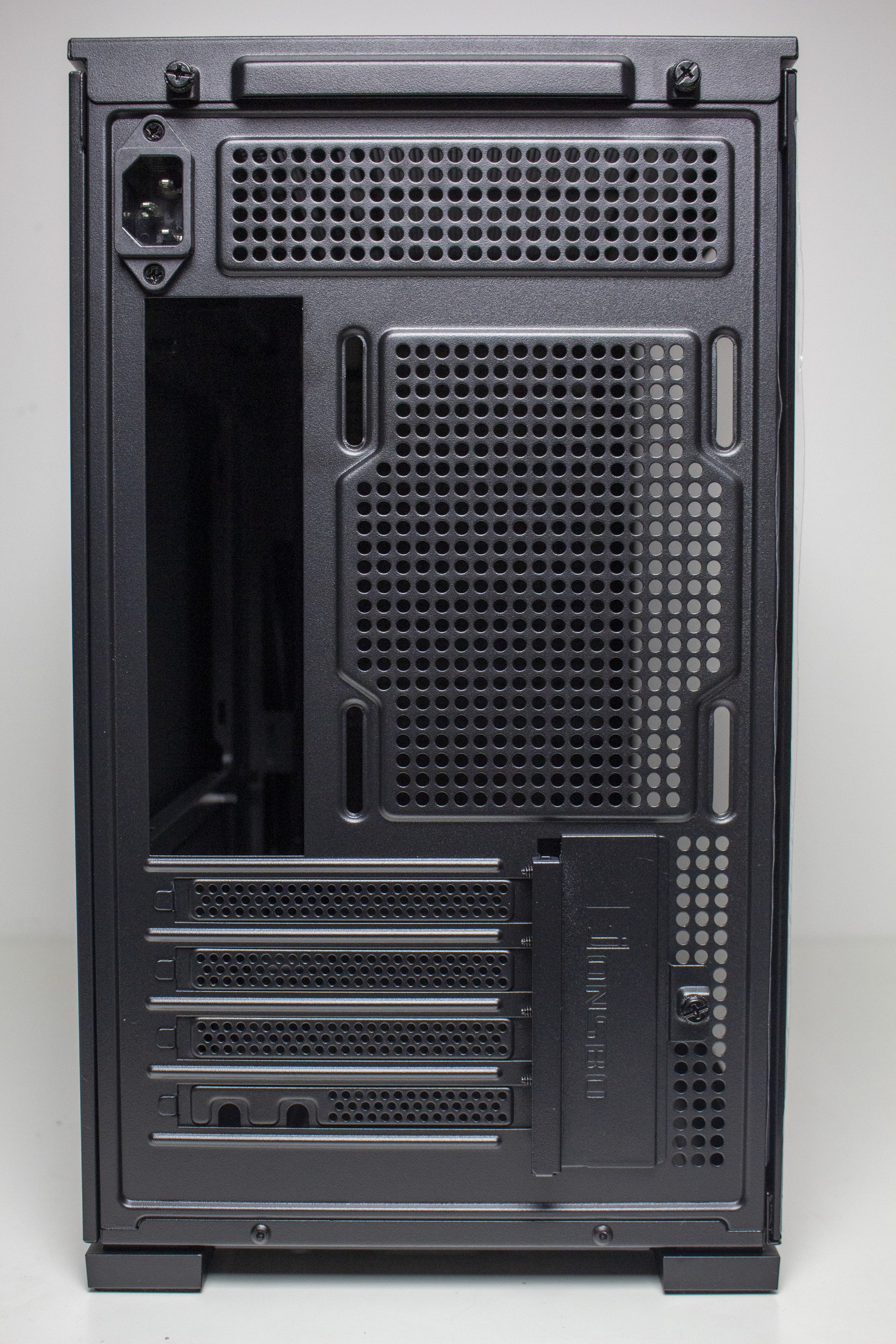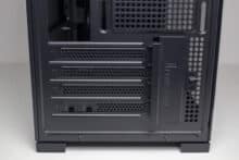 Bei der Rückseite angekommen, kann man direkt erkennen, dass das D31 MESH Screen untypisch aufgebaut ist. So kann man zwar vier Erweiterungsslots, einen unbestückten 120-mm-Lüfterplatz und einen Ausschnitt für das I/O-Shield des Mainboards erkennen. Was aber fehlt, ist die Öffnung für das Netzteil. Der Grund hierfür ist, dass Jonsbo das Netzteil im Innenraum platziert. An der Rückseite finden wir lediglich eine Buchse für das Kaltgerätekabel, welches im Innenraum zum Montageplatz des Netzteil weitergeführt wird.
