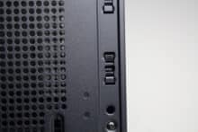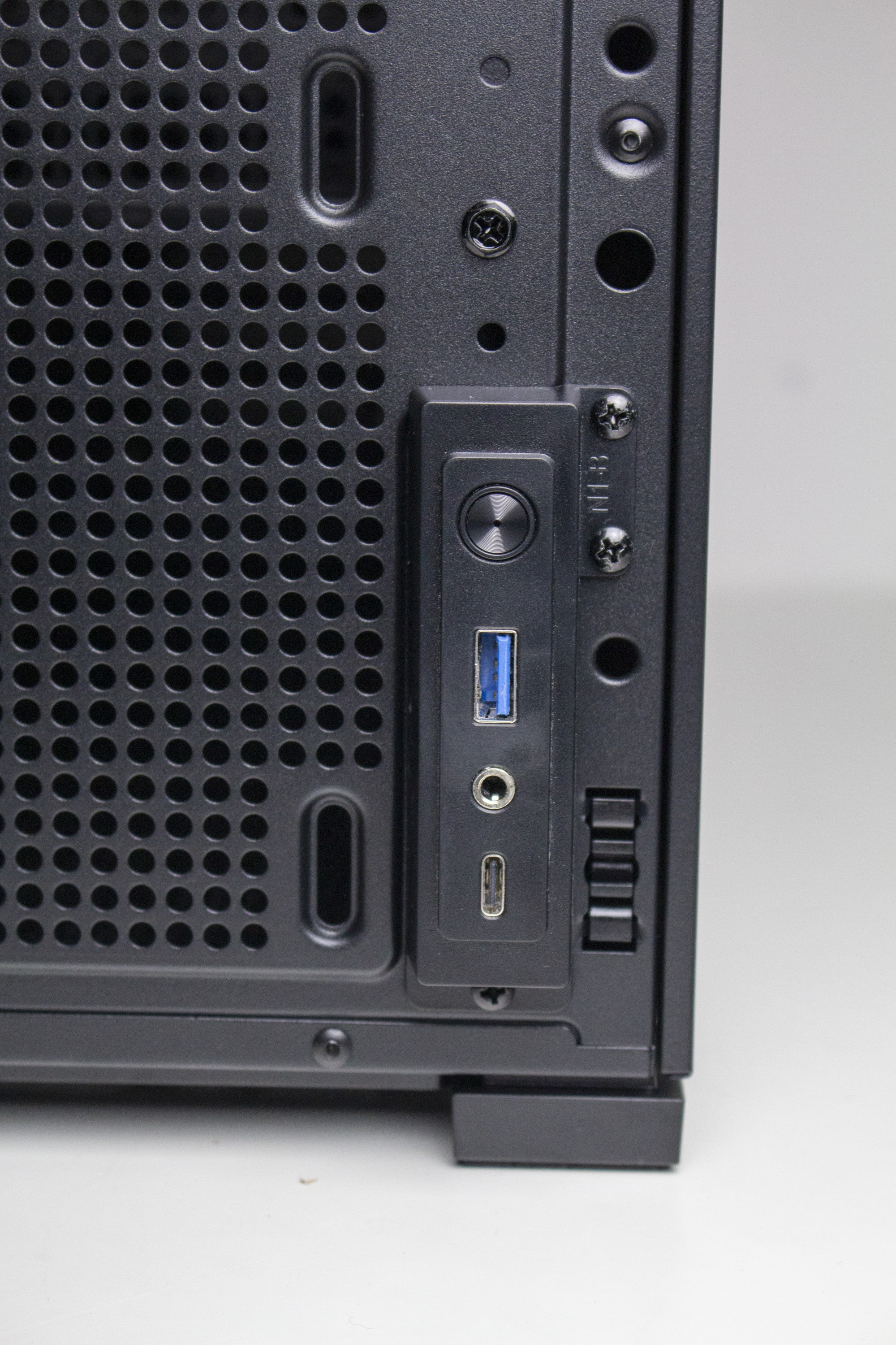 Stattdessen finden wir im unteren rechten Bereich aber ein vertikal ausgerichtetes I/O-Panel. Dieses verfügt über zwei USB-Ports (1x USB-A 3.0, 1x USB-C 3.1), einem 3,5mm-HD-Audio-Comboport sowie einen blau-beleuchteten Power-Button. Der Anschluss der USB-Buchsen am Mainboard erfolgt über einen 19-Pin- (USB-A) bzw. einen 20-Pin-Stecker (USB-C).