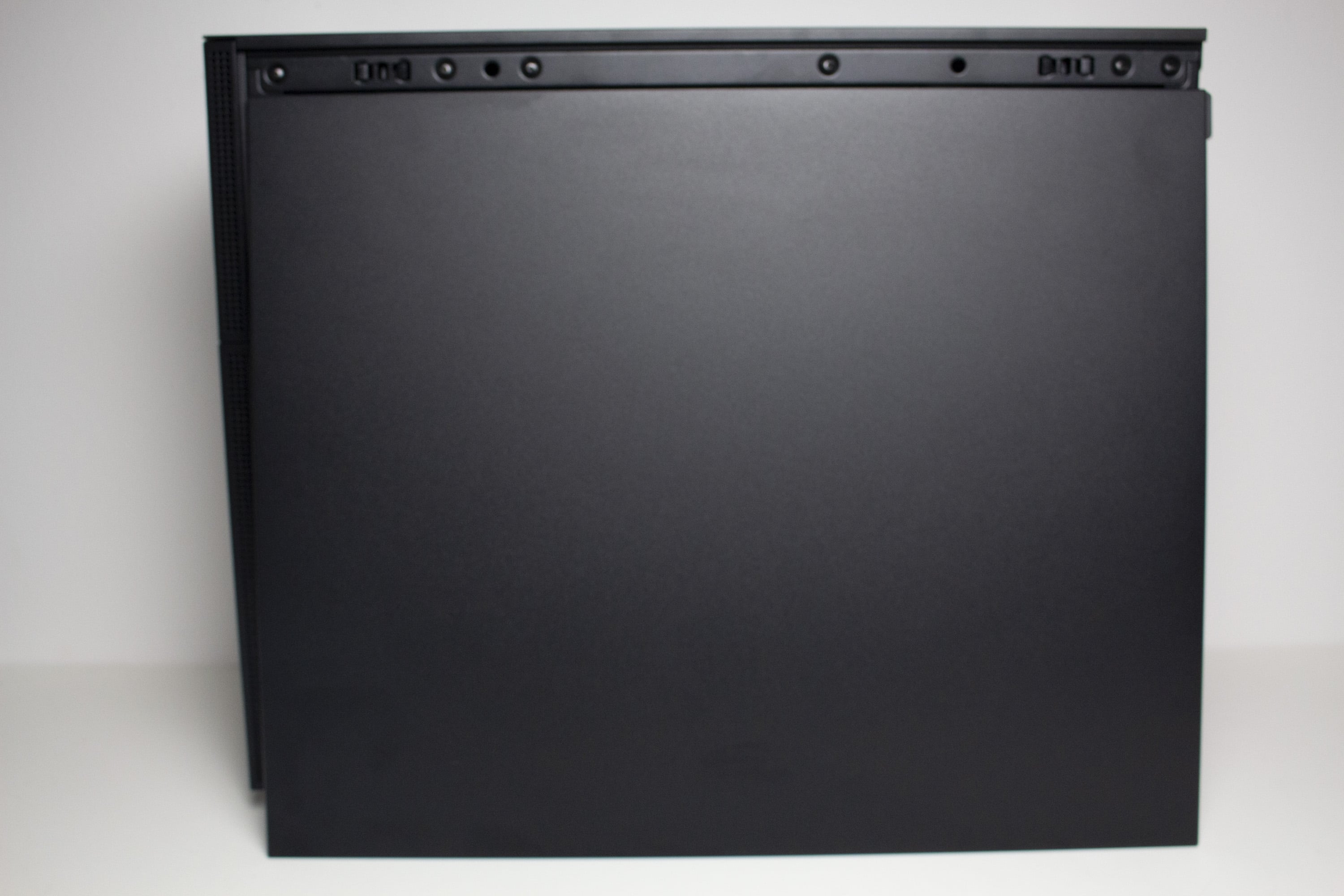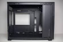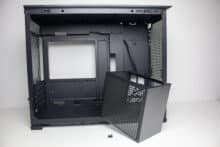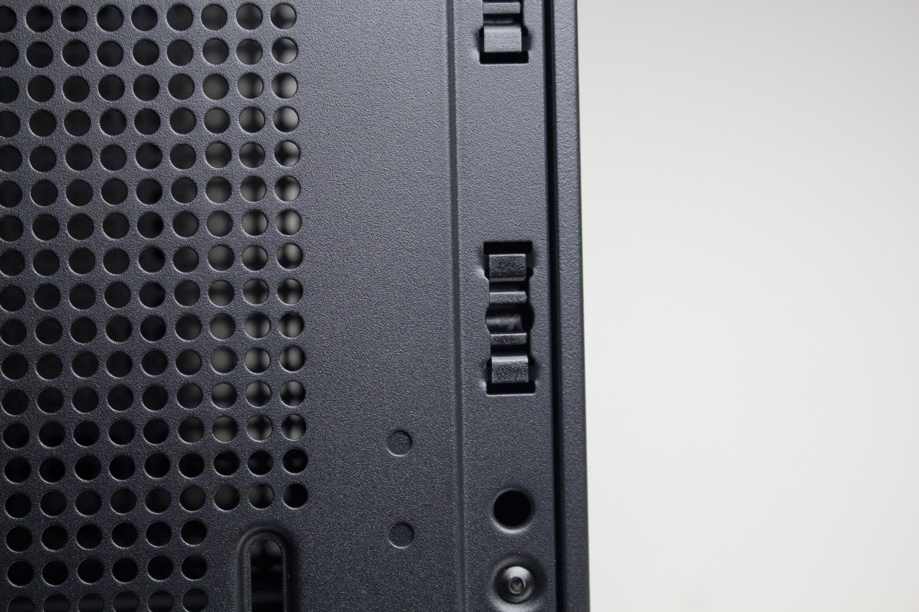 Das linke Seitenteil des Jonsbo D31 besteht aus Temperglas, auf welches zwei dünne Stahlstreifen geklebt wurden. Diese Streifen verfügen wiederum über Push-Pins aus Stahl, die eine werkzeuglose Befestigung der Glasscheibe am Gehäusekorpus ermöglichen. Ein identisches Montagesystem kommt auch beim rechten Seitenteil zum Einsatz. Es wird unten eingehakt und oben mit Push-Pins festgeklipst. Als Material setzt Jonsbo an der rechten Seite auf normalen Stahl. Die Materialstärken beider Panels sind in Ordnung.