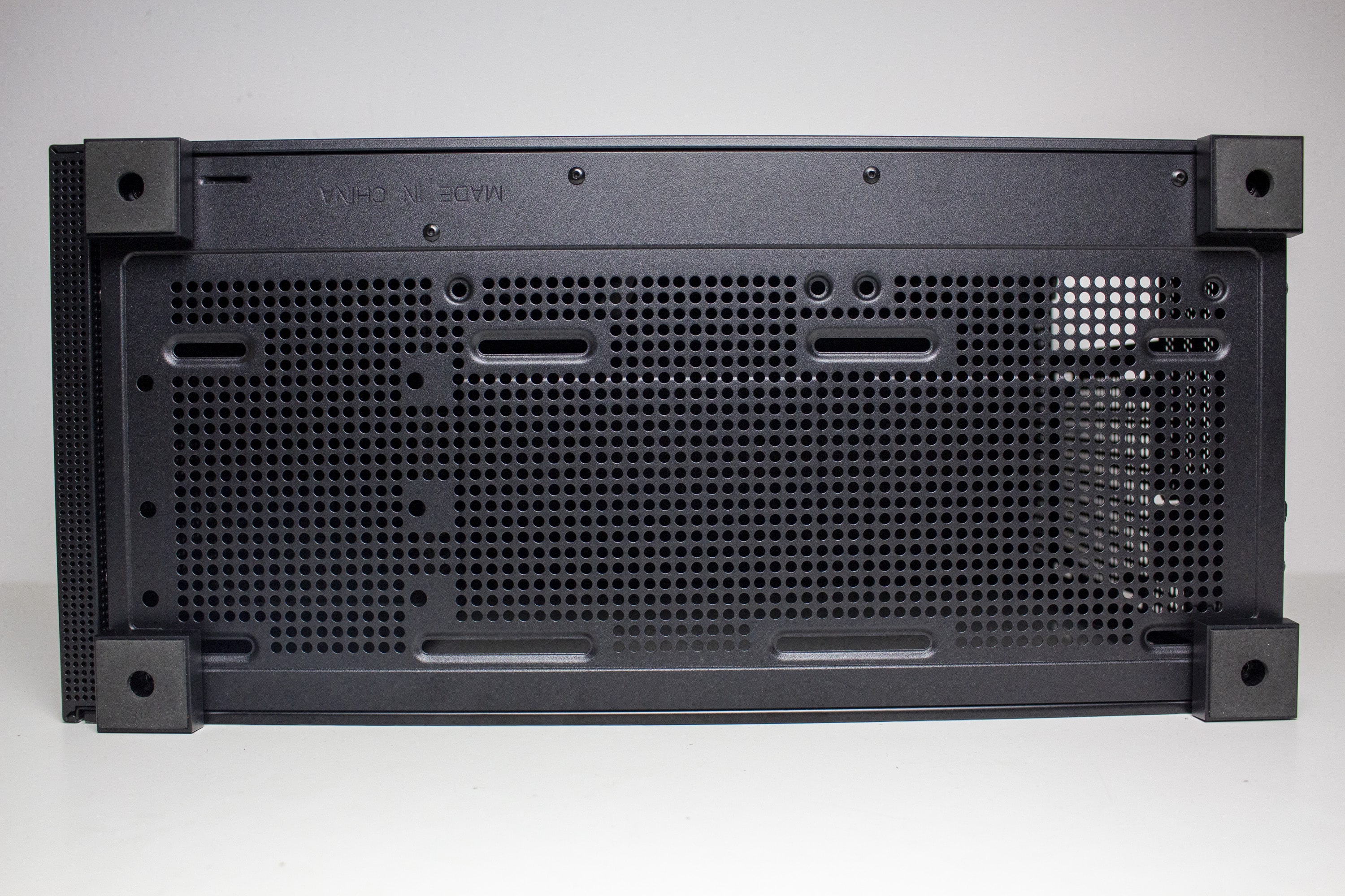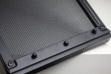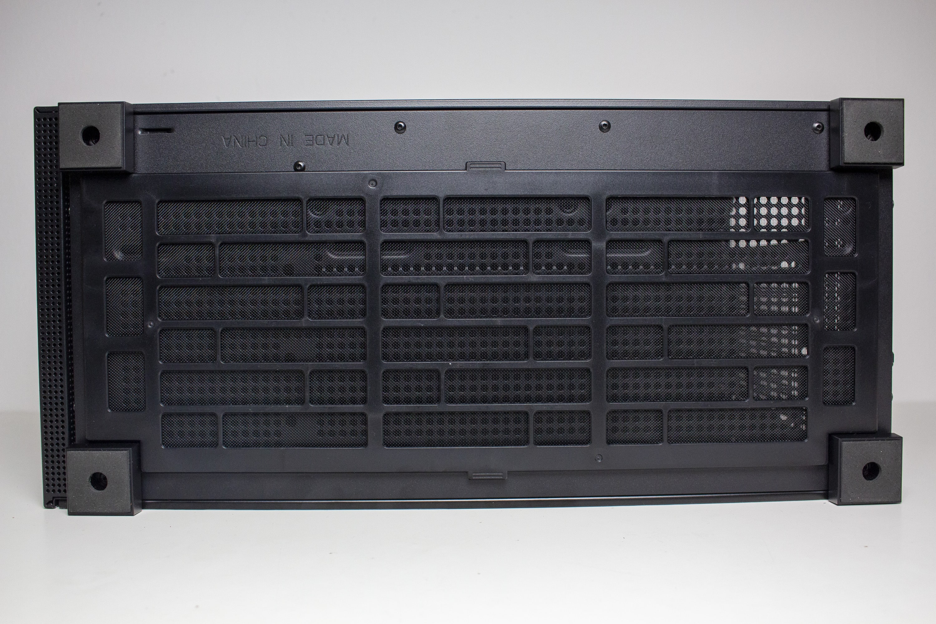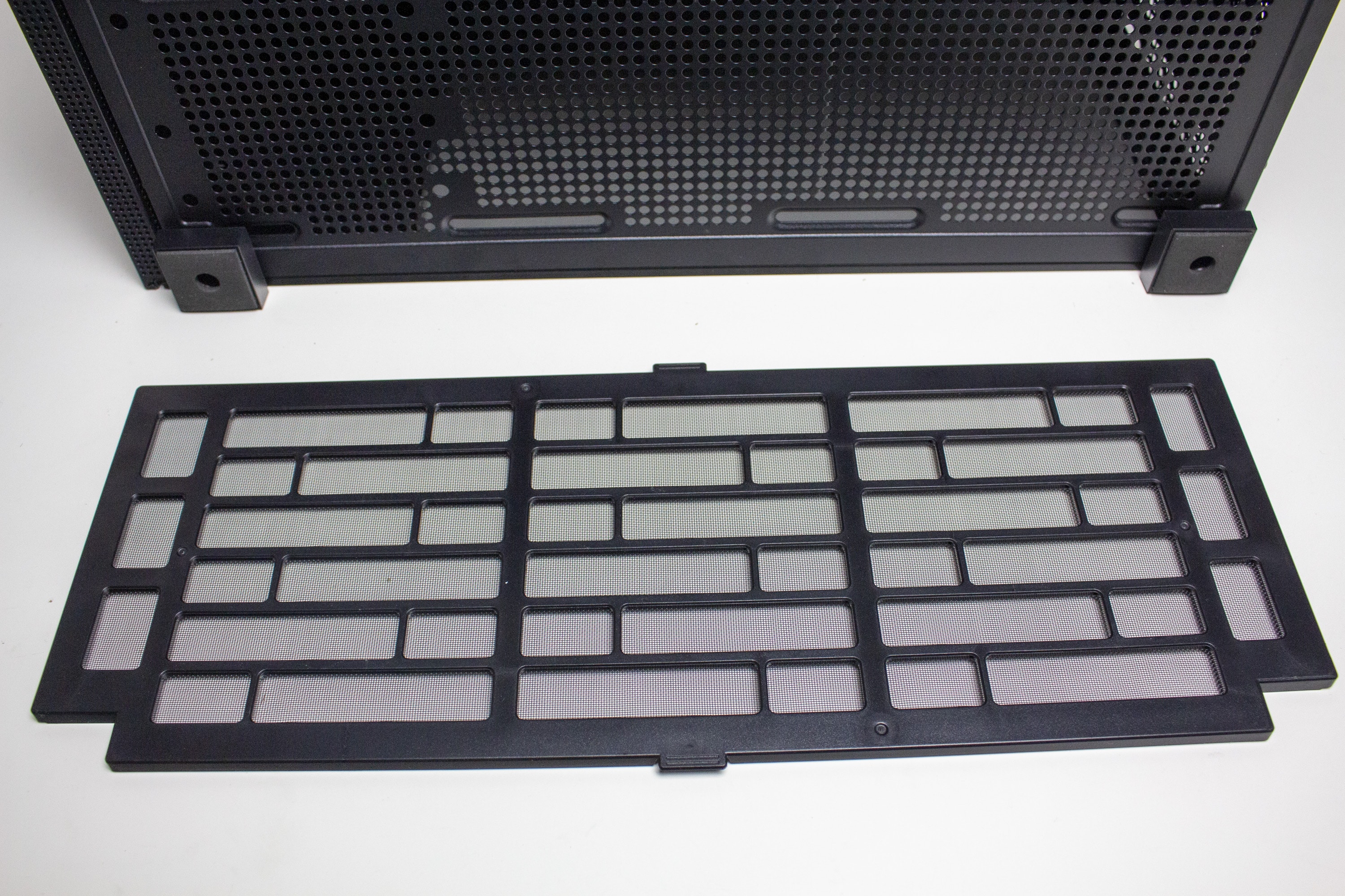 An der Unterseite verbaut Jonsbo vier schwarze, rechteckige Standfüße aus herkömmlichen Kunststoff. Die Materialanmutung ist aber ordentlich und auch auf Gummistreifen unter den Füßen muss man nicht verzichten. Außerdem verbaut der Hersteller an der Unterseite den einzigen Staubfilter im gesamten Gehäuse. Dieser überspannt die gesamte Bodenpartie, verfügt über einen stabilen Rahmen, einen feinen Netzstoff als Filter sowie über zahlreiche Magnete zur Befestigung. Unterhalb des Filter erkennen wir eine große Lüfteröffnung mit Montageschienen für drei 120-mm- oder zwei 140-mm-Lüfter.