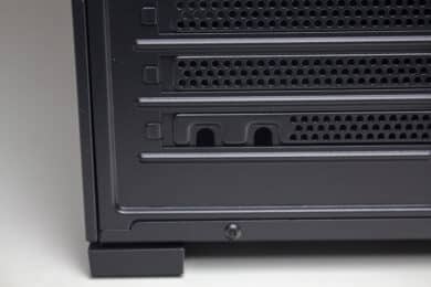 An der Rückseite des Innenraums finden wir einen unbestückten Montageplatz für einen 120-mm-Lüfter sowie vier perforierte und wiederverwendbare Slotblenden. Aufgrund von Schienen kann der rückwärtige Lüfter flexibel positioniert werden. Da die Anschlusskabel des Bildschirms in der Front auch nach hinten bzw. außen geführt werden müssen, verbaut Jonsbo an der untersten Position weiterhin eine besondere Slotblende. Diese verfügt nämlich über zwei passend große Öffnungen, um dort das USB- bzw. HDMI-Kabel durchführen zu können.