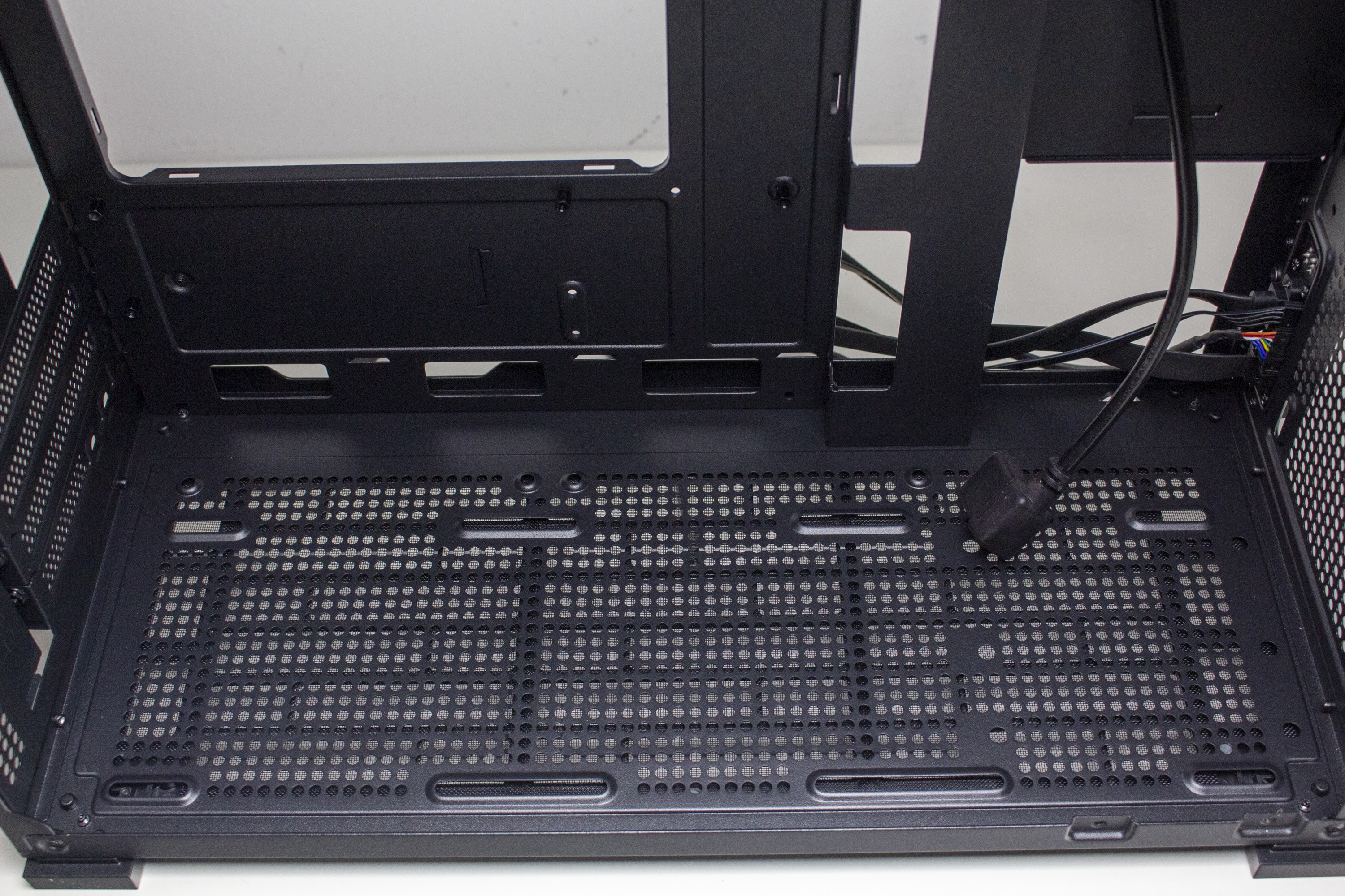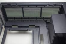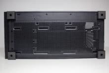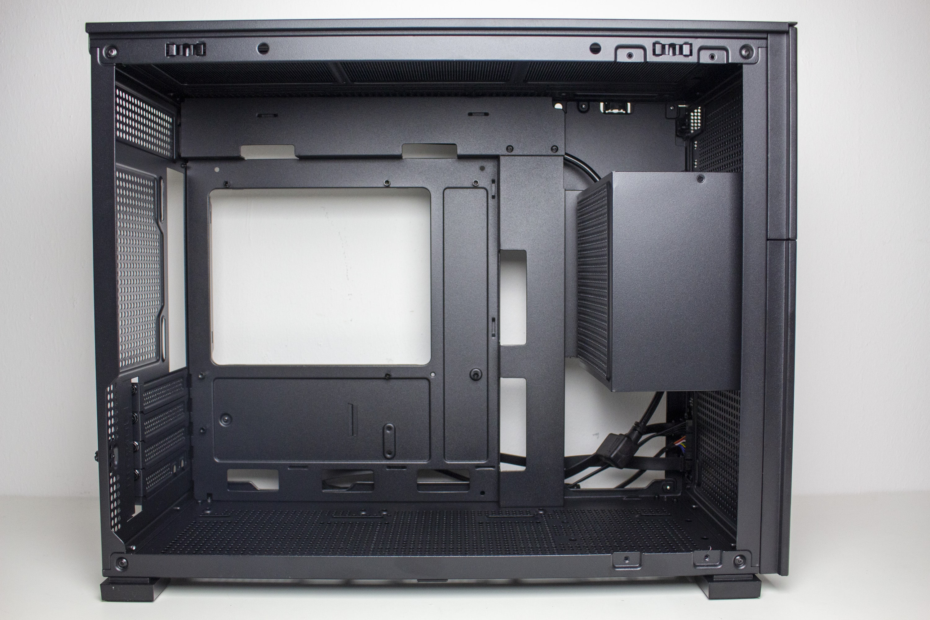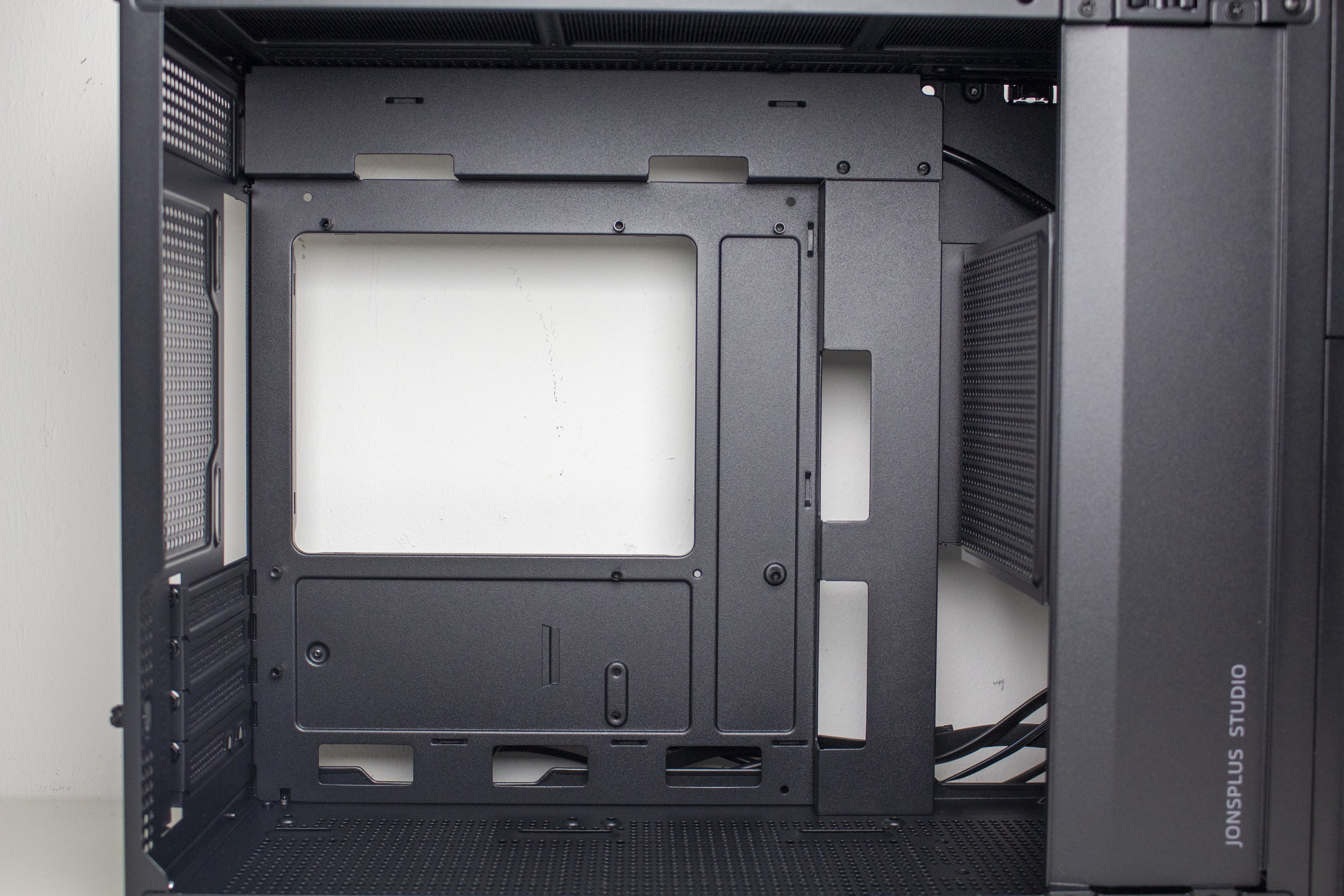 Im vorderen Bereich des Innenraums positioniert Jonsbo den Montagerahmen für das Netzteil, der ab Werk von einer schmalen Stahlblende mit Logo-Schriftzug verdeckt wird. Die Blende ist mit vier Schrauben befestigt und kann ausgebaut werden. Der Netzeilkäfig ist an einer Seite offen und an der anderen Seite perforiert. Dadurch kann die Stromversorgung entweder mit dem Lüfter zum Innenraum oder zur Front zeigend ausgerichtet werden. Zudem kann der PSU-Käfig in vier verschiedenen Höhen befestigt werden. Dies ermöglicht eine flexible Positionierung des Netzteils wenn z.B. ein Radiator im Deckel oben oder eine lange Grafikkarte unten verbaut werden sollen.