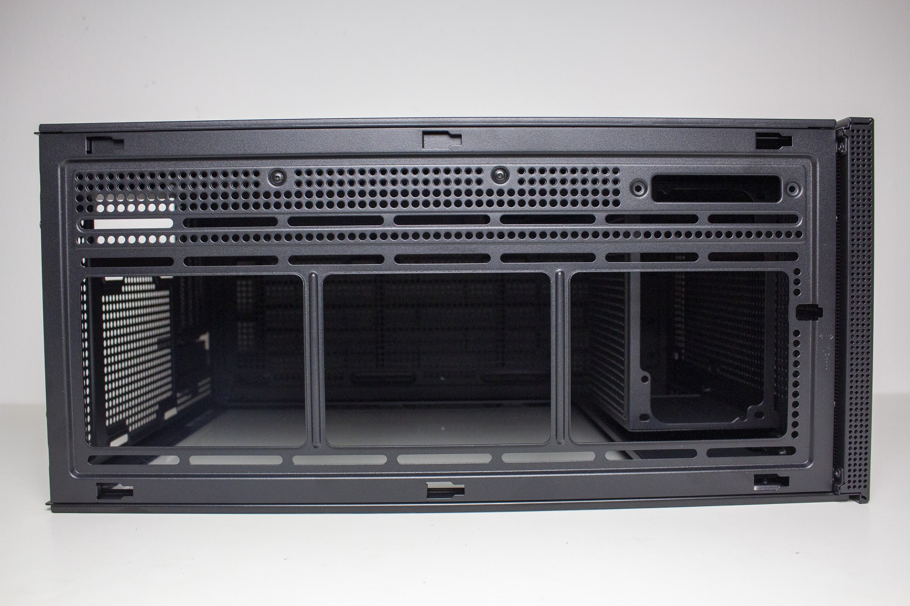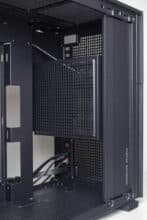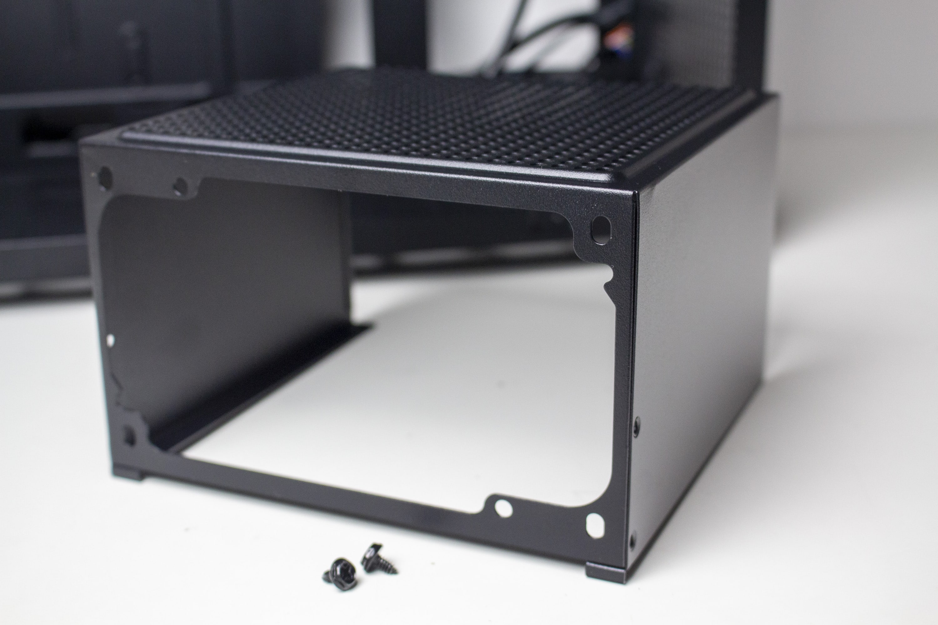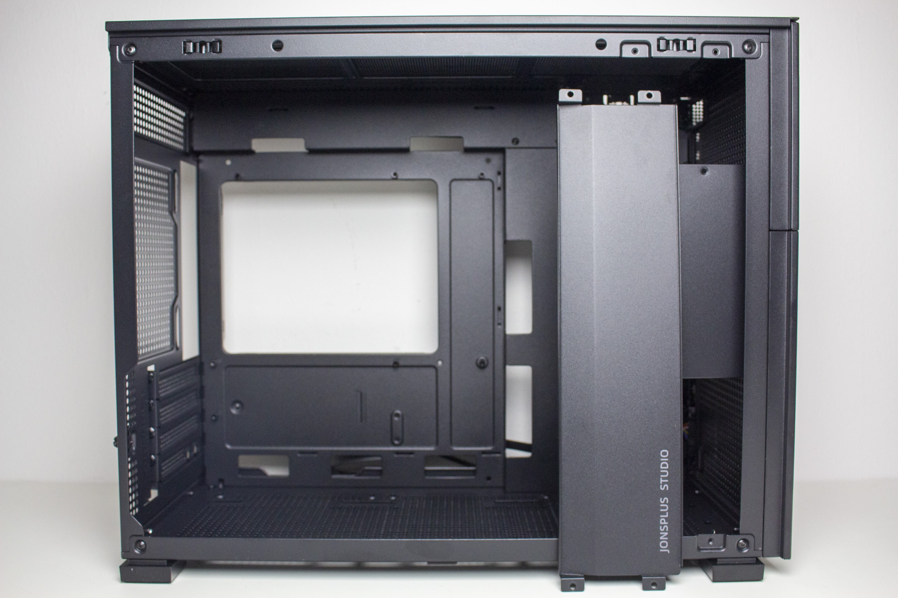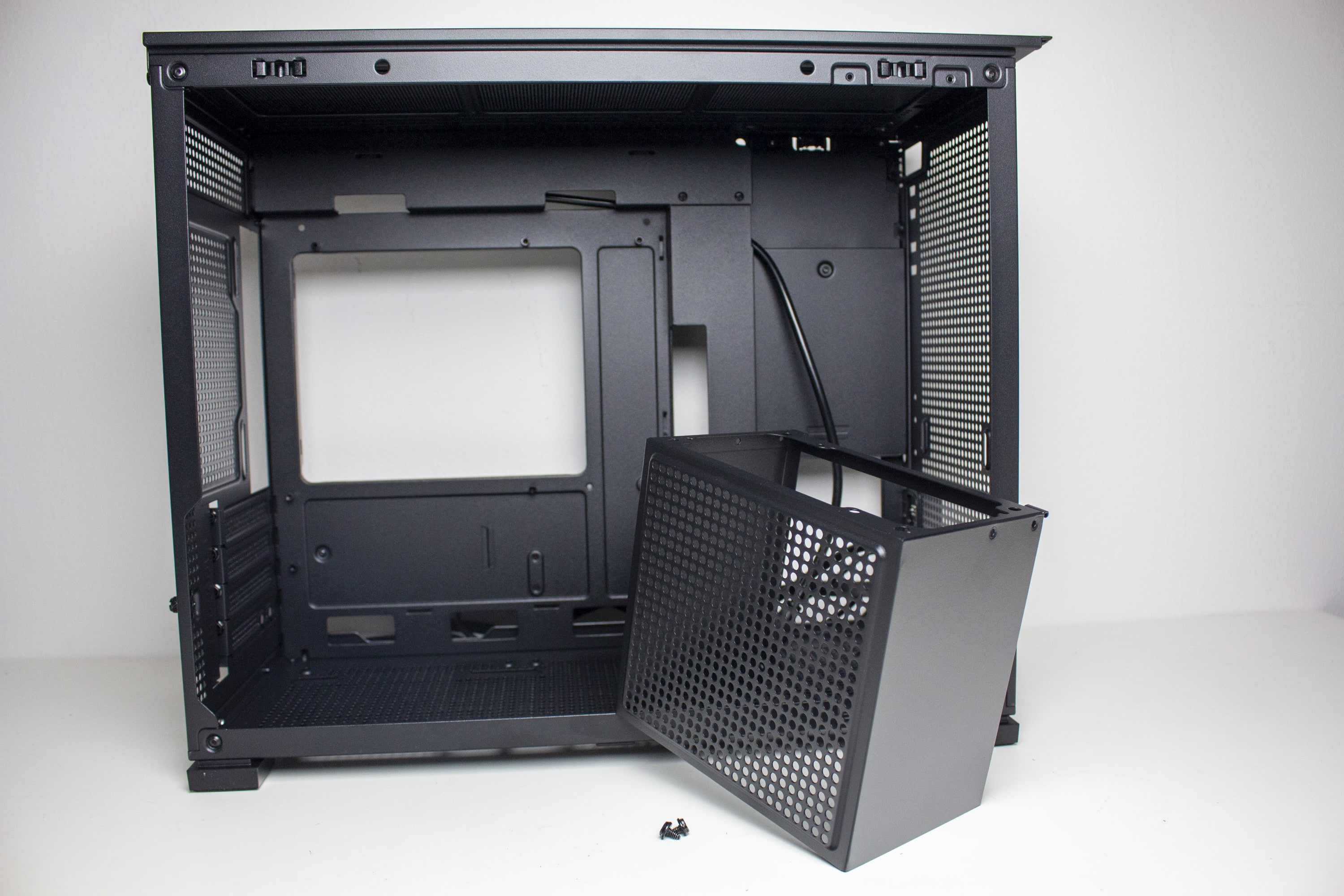 Im vorderen Bereich des Innenraums positioniert Jonsbo den Montagerahmen für das Netzteil, der ab Werk von einer schmalen Stahlblende mit Logo-Schriftzug verdeckt wird. Die Blende ist mit vier Schrauben befestigt und kann ausgebaut werden. Der Netzeilkäfig ist an einer Seite offen und an der anderen Seite perforiert. Dadurch kann die Stromversorgung entweder mit dem Lüfter zum Innenraum oder zur Front zeigend ausgerichtet werden. Zudem kann der PSU-Käfig in vier verschiedenen Höhen befestigt werden. Dies ermöglicht eine flexible Positionierung des Netzteils wenn z.B. ein Radiator im Deckel oben oder eine lange Grafikkarte unten verbaut werden sollen.