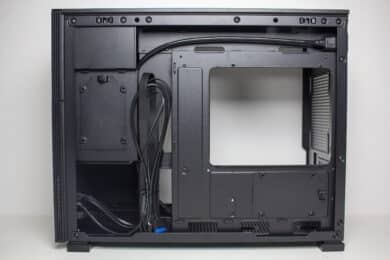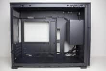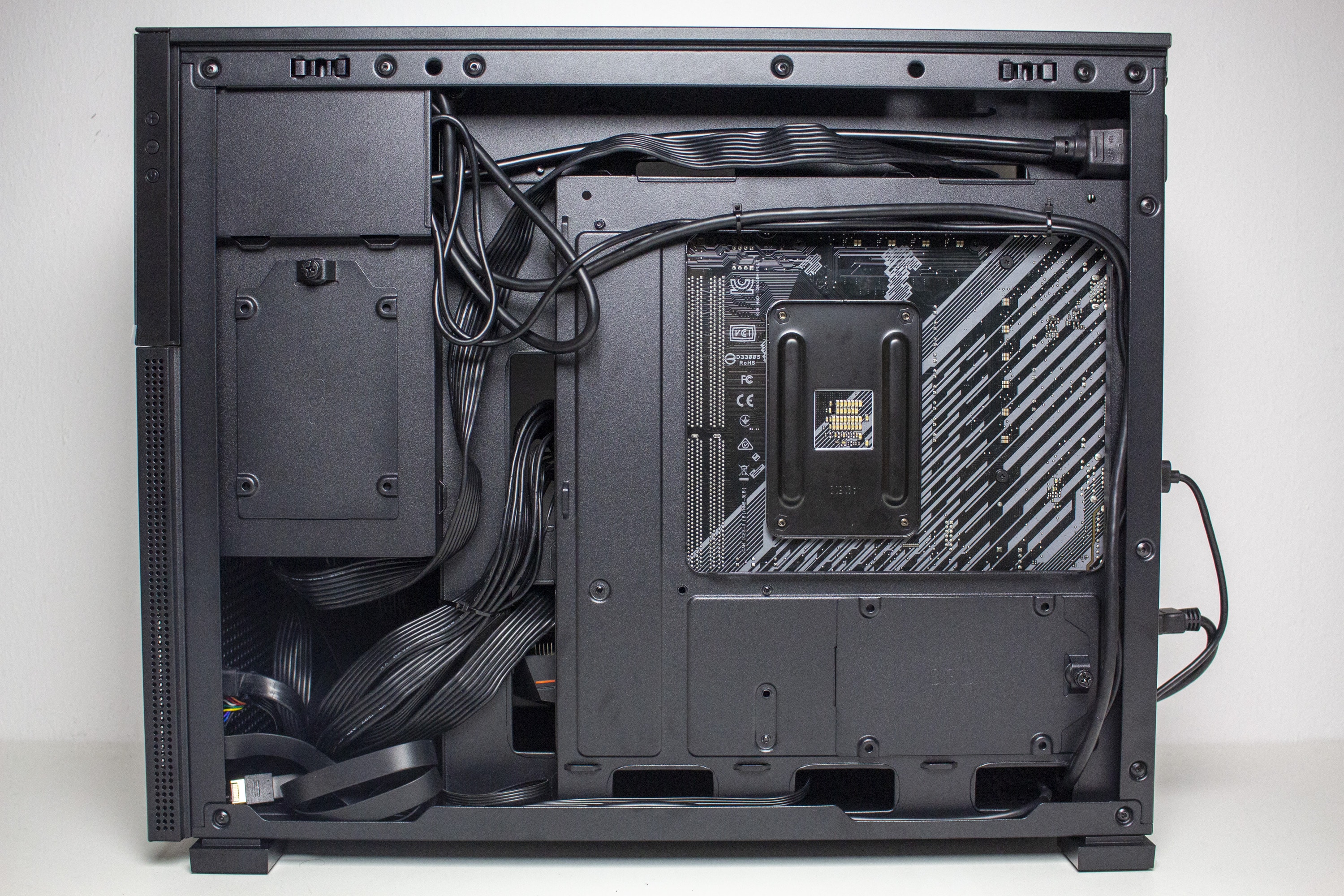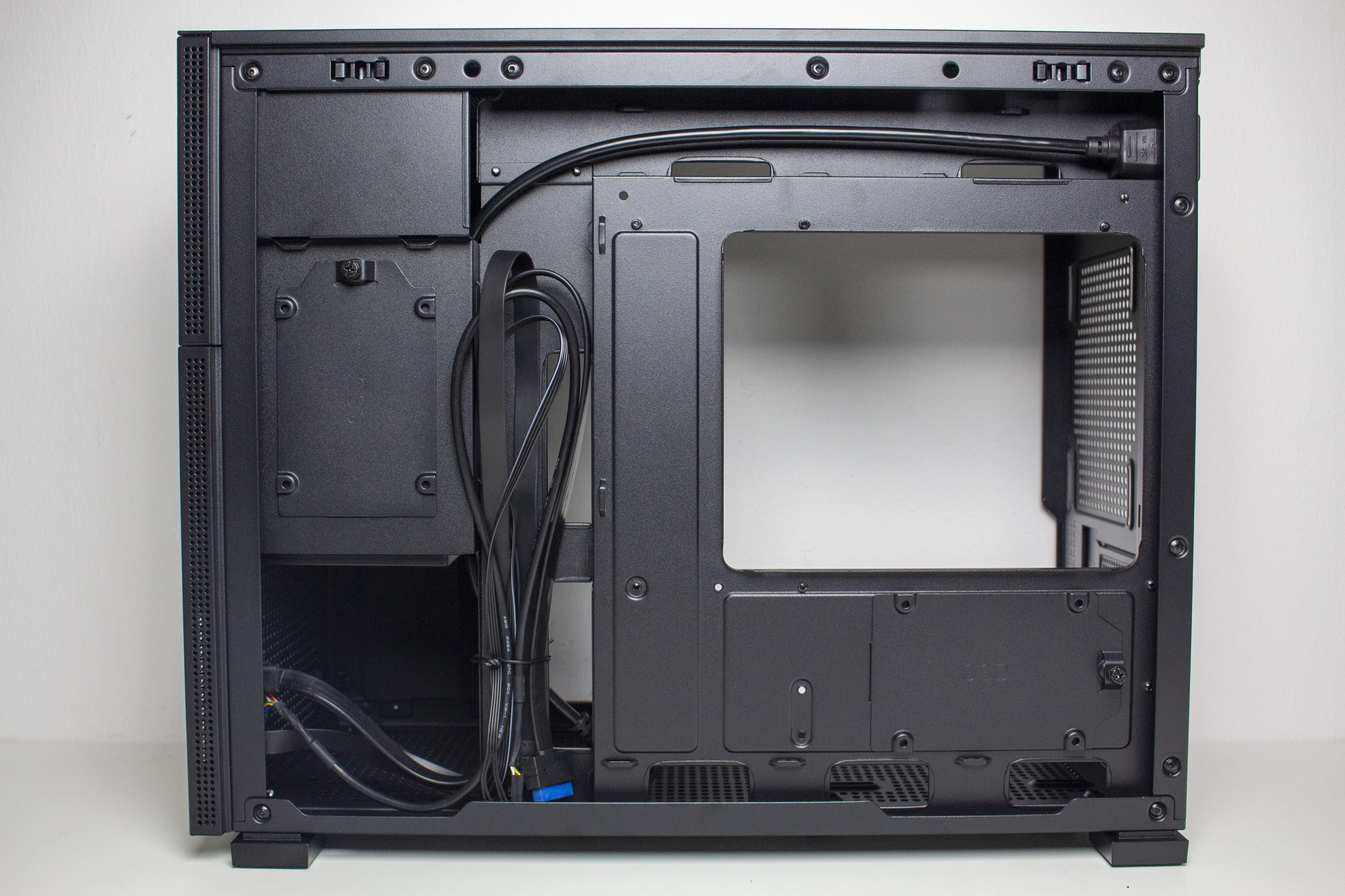 Etwas schwieriger war es da mit der Verkabelung. Die Kabel des Netzteils sind recht starr und lassen sich nicht so gut verbiegen. Aufgrund der Netzteilpositionierung ist das aber notwendig, um die Kabel hinter das Mainboard-Tray legen zu können. Außerdem bietet die Blende vor dem Netzteil weniger Möglichkeiten überflüssige Kabel zu verstecken, da diese in Richtung Innenraum nicht geschlossen ist. Durch die 35 Millimeter tiefen Kabelkanäle, die gut positionierten Ösen für Kabelbinder und dem Einsatz ebenjener konnte aber dennoch ein aufgeräumtes und optisch ansprechendes PC-System erschaffen werden.