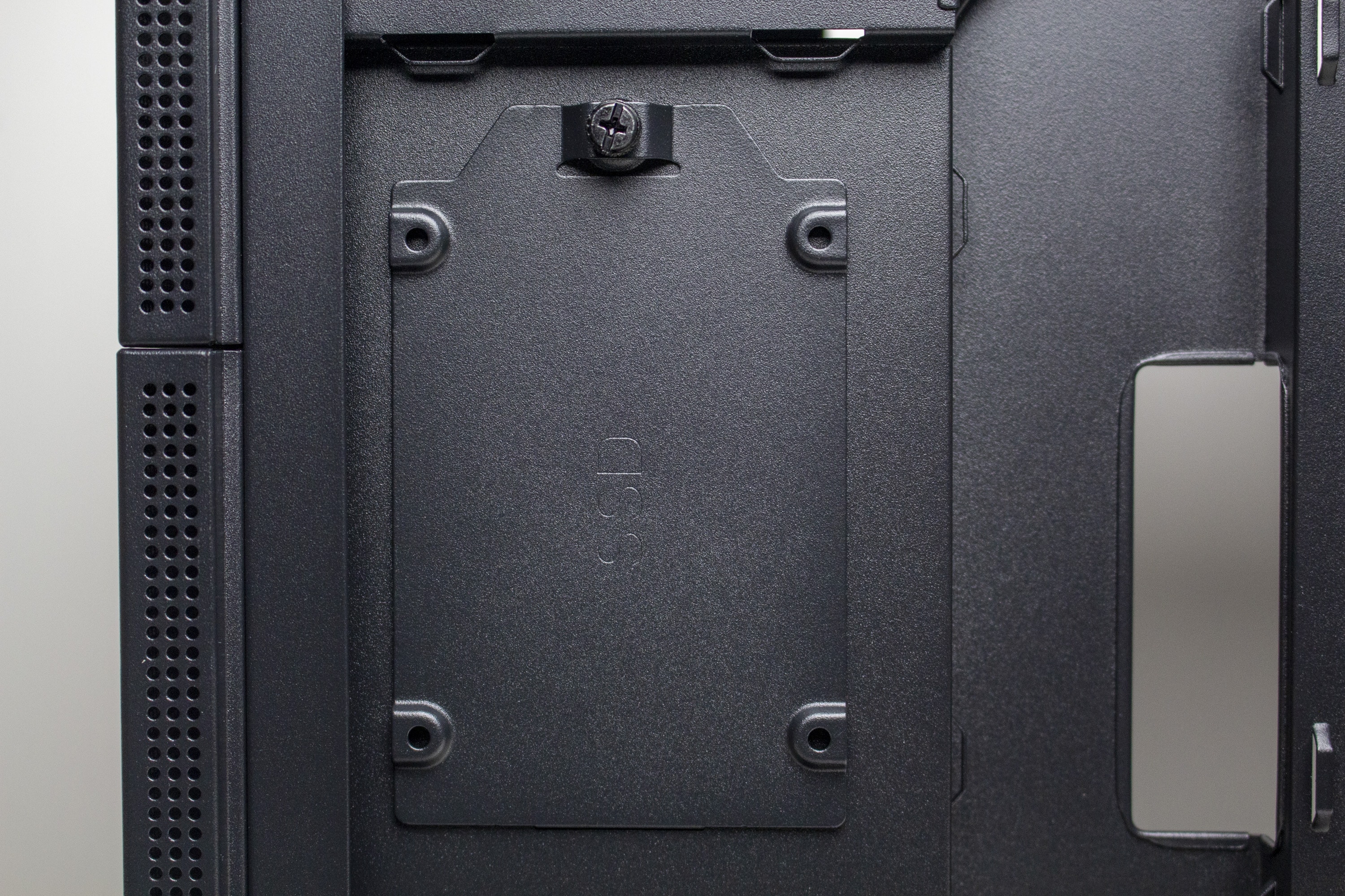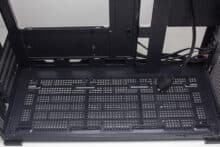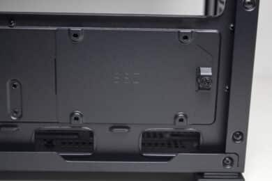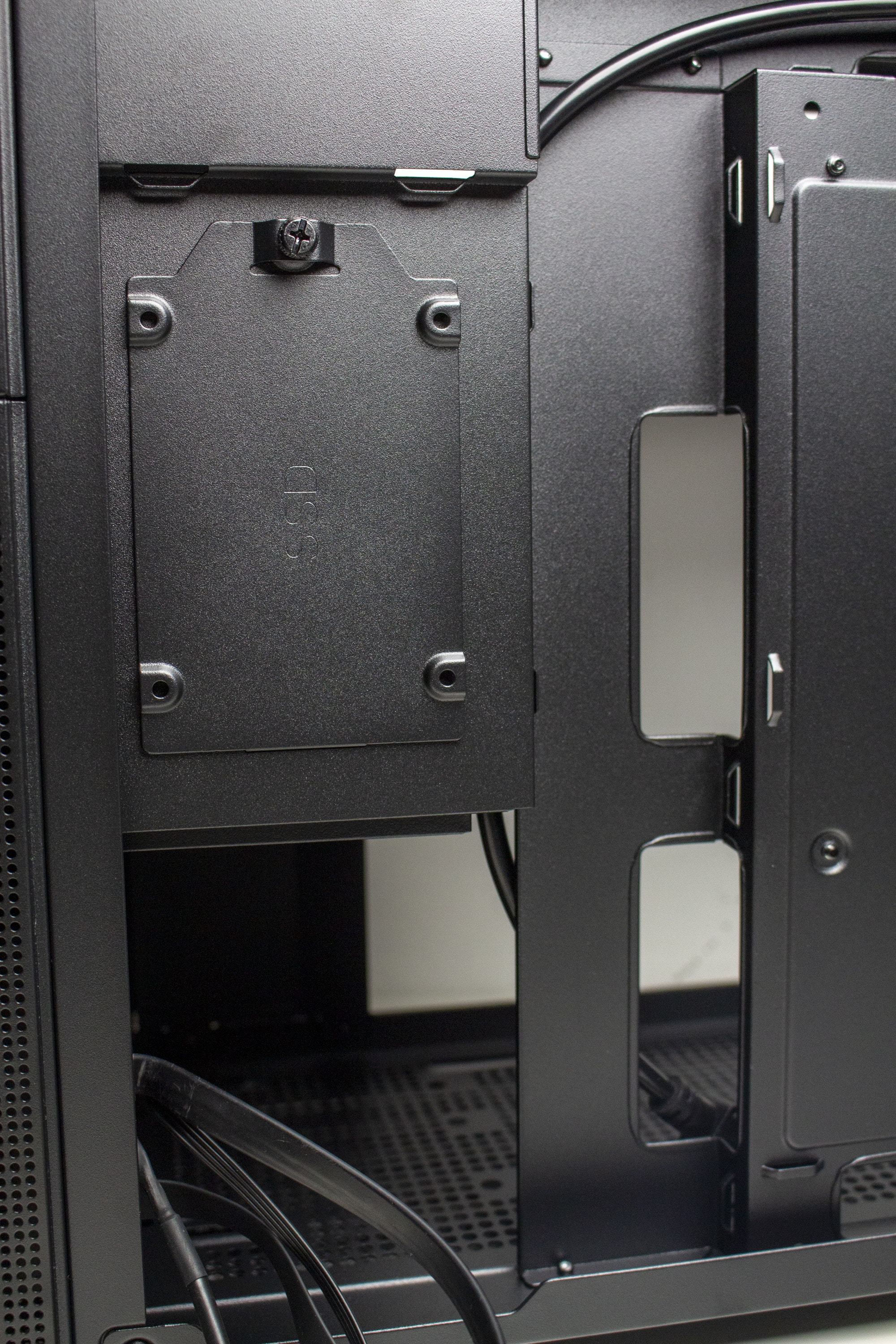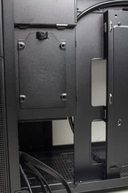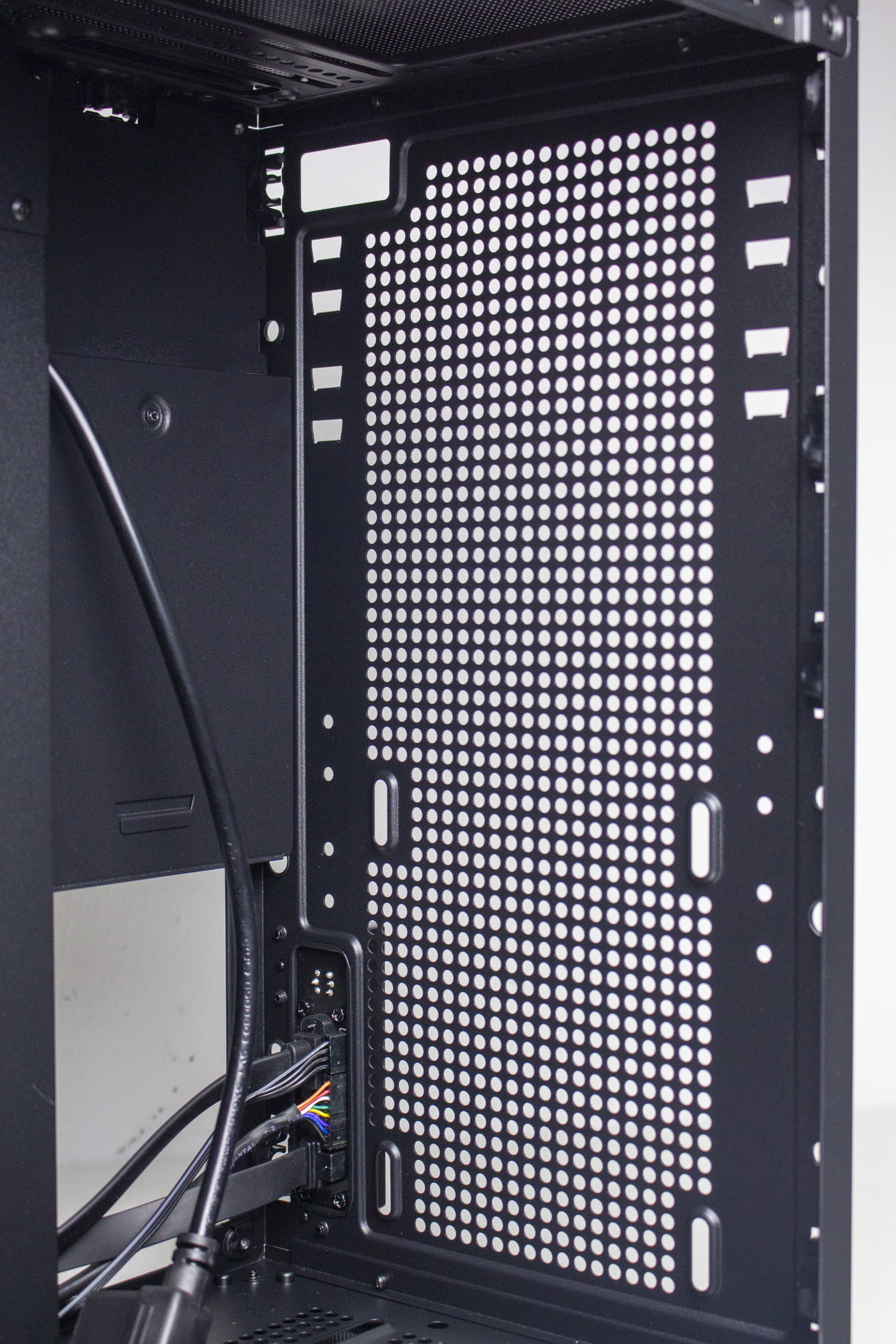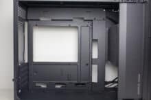Die Rückseite des Mainboard-Trays gestaltet sich recht unspektakulär. Wie bereits erwähnt, gibt es seitlich und oberhalb des Mainboard-Trays einen Kabelkanal, der 35 Millimeter tief ist. In Verbindung mit den zahlreichen Ösen für Kabelbinder sollten sich damit alle Netzteilkabel ordentlich verstecken lassen. Direkt hinter dem Tray können aufgrund der geringeren Tiefe von 15 Millimetern nur sehr dünne Kabel entlang geführt werden. Weiterhin lässt sich eine große Aussparung erkennen, welche es ermöglicht nachträglich einen CPU-Kühler mit Backplate verbauen zu können.