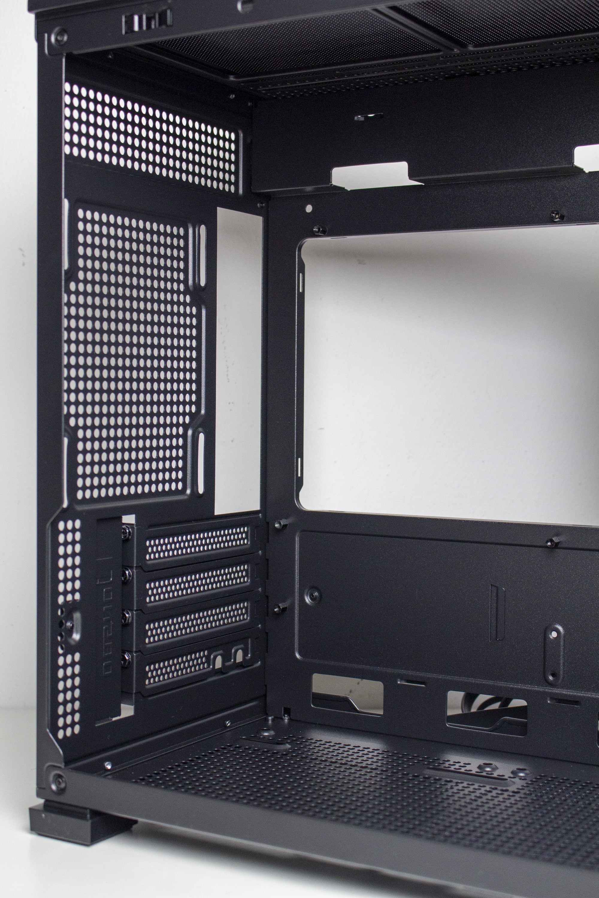 Das Innere des Jonsbo D31 besteht grundsätzlich aus einer sehr großen Hauptkammer, in der alle Komponenten platziert werden, und der Rückseite des Mainboards-Trays, die zur Verlegung von Kabeln eingesetzt werden kann. Das Mainboard-Tray ist dabei nicht ganz plan gestaltet. Stattdessen wurde der Bereich des Mikro-ATX-Mainboards etwas eingelassen und die zwei Kabelkanäle, welche über insgesamt vier Öffnungen verfügen, stehen etwas hervor. Außerdem finden wir im unteren Bereich des Mainboard-Trays drei weitere Kabelmanagement-Öffnungen und Platz für weitere Lüfter. Oberhalb des Mainboards-Trays gibt es genug Spielraum um auch tiefere Radiatoren oder Lüfter verbauen zu können.