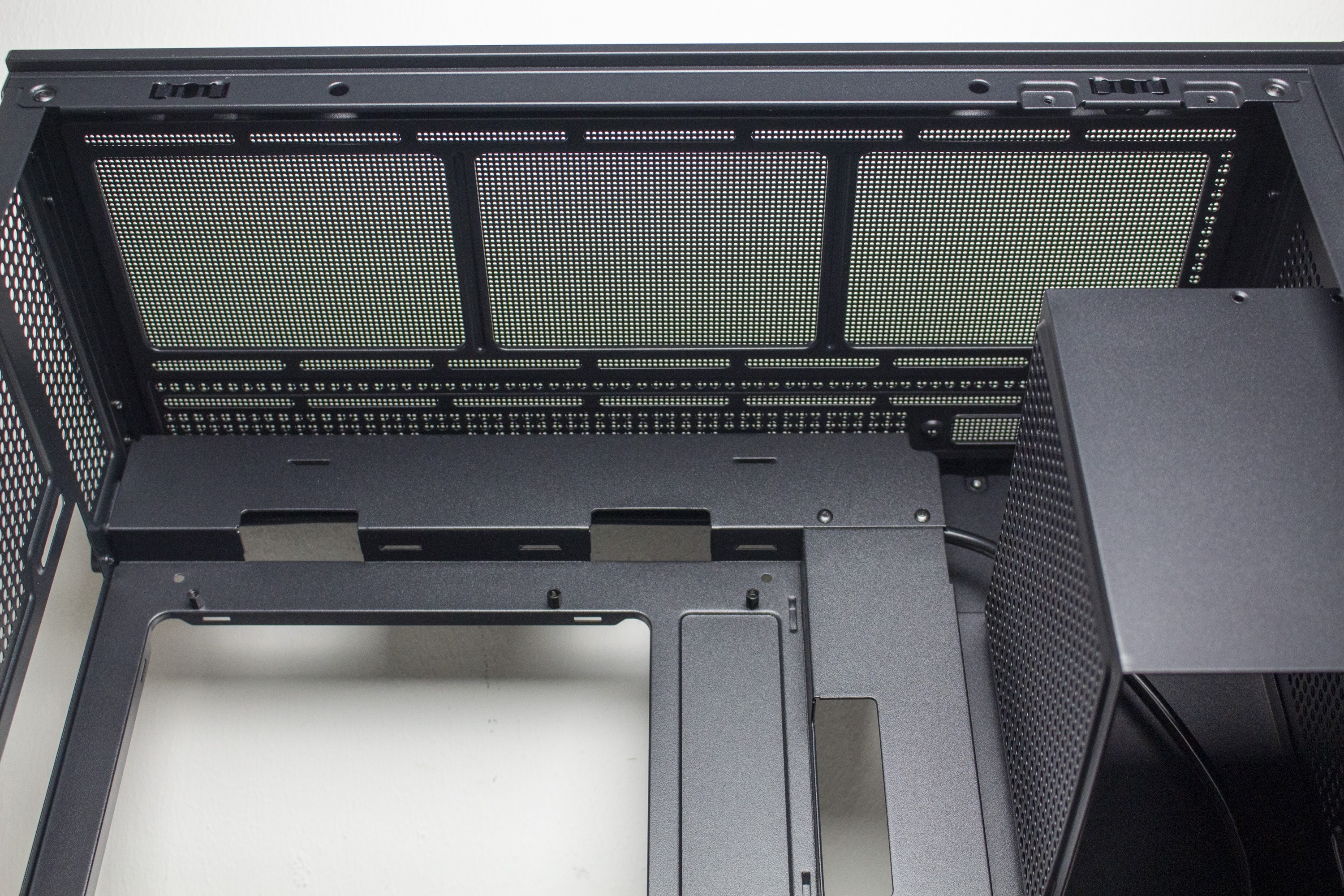 Der Deckel des D31 folgt optisch dem Design der Front. Auch die gesamte Deckelplatte besteht aus Stahl und verfügt ebenfalls über eine rechteckige Mesh-Struktur. Einen Staubfilter verbaut Jonsbo an dieser ebenfalls nicht. Durch die Entfernung von zwei Rändelschrauben am hinteren Ende lässt dich das Topanel abziehen und offenbart darunter einen großen Rahmen zur Befestigung von drei 120-mm- oder zwei 140-mm-Radiatoren bzw. entsprechend großen Radiatoren.