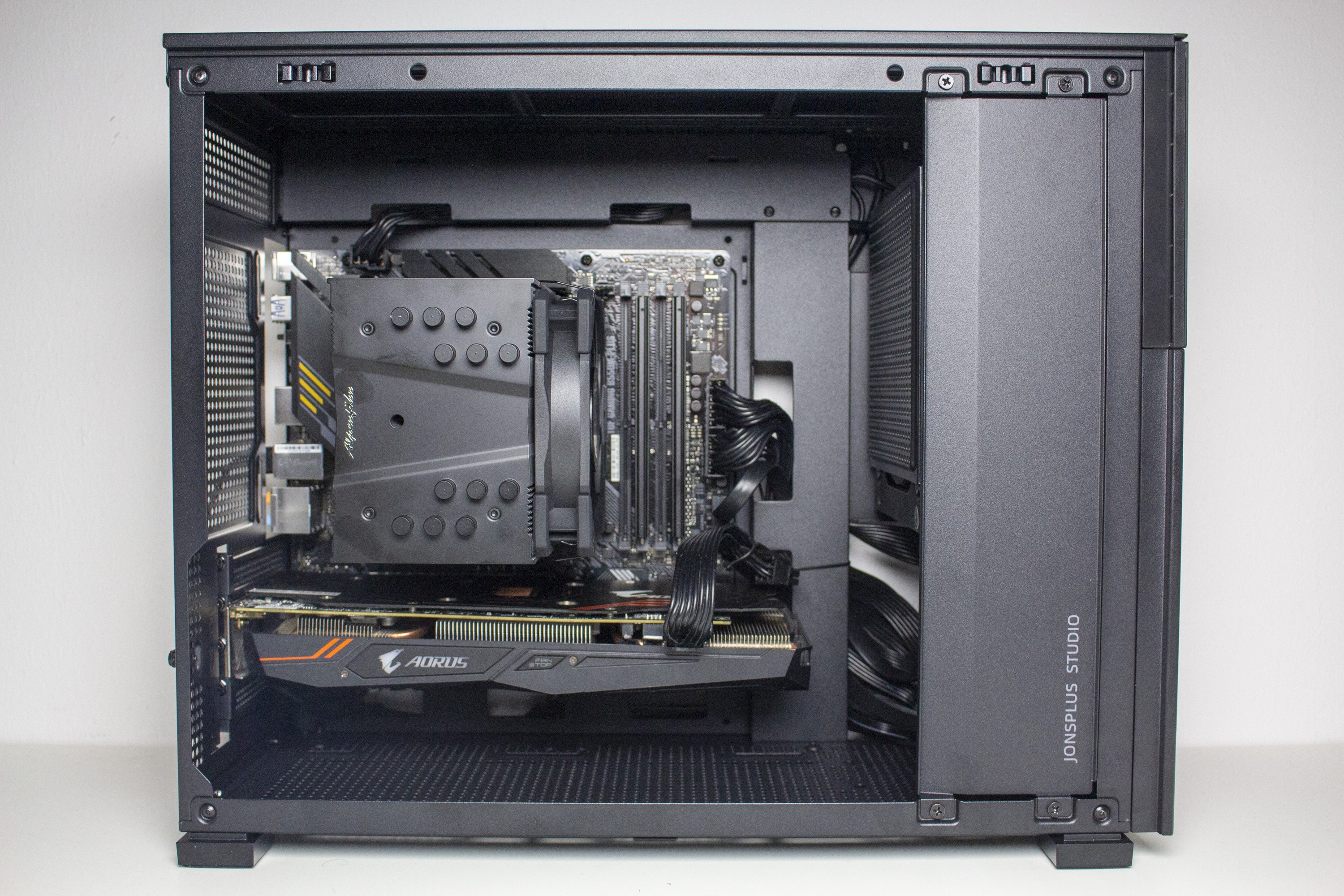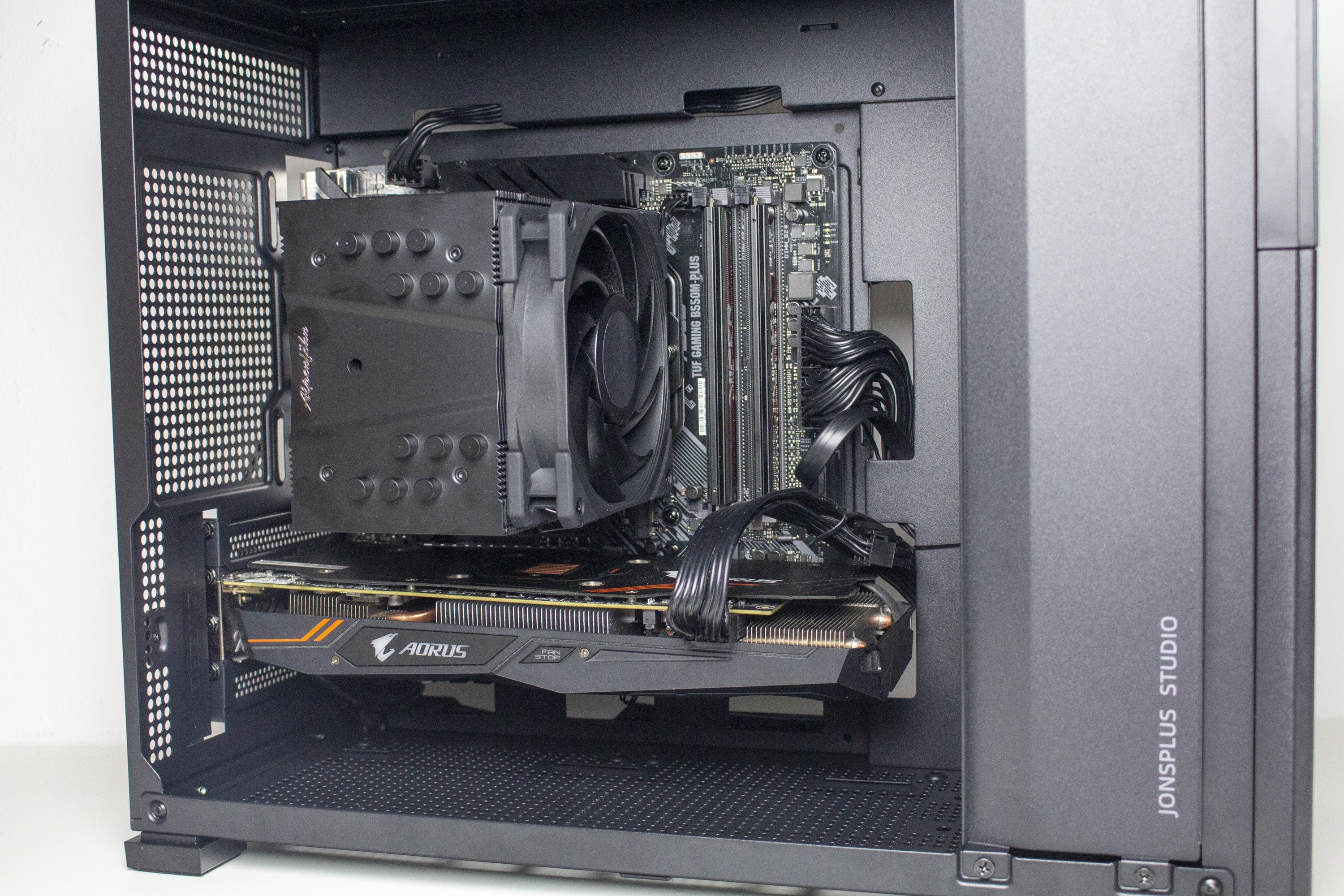 Nun kommen wir zum Systemeinbau beim Jonsbo D31 MESH Screen Test. Als Hardware verwenden wir einen AMD Ryzen 5 1400* auf einem ASUS TUF Gaming B550M-Plus* mit 16GB Crucial Ballistix Sport LT grau DDR4-2666*. Der Ryzen wird von einem Alpenföhn Brocken 4* gekühlt und ist auf 3,8 GHz (1,175 V) übertaktet. Für die Bildausgabe ist eine Gigabyte AORUS GTX 1060 6GB zuständig. Die Stromversorgung erledigt das vollmodulare LC-Power LC550 V2.31 Platinum*.