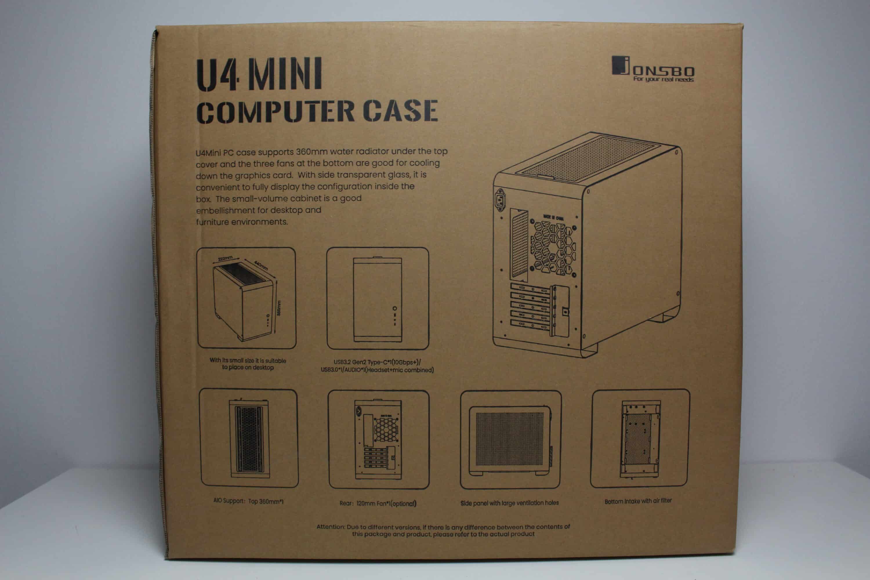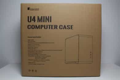 Jonsbo verpackt das U4 Mini Mesh in einem schlichten Karton aus brauner Pappe. Darauf finden wir, aufgedruckt in schwarzer Farbe, einige schematische Zeichnungen des Mini-Towers, eine Auflistung der technischen Daten sowie eine bebilderte Auflistung der wichtigsten Features und eine kurze Beschreibung des Jonsbo U4 Mini.