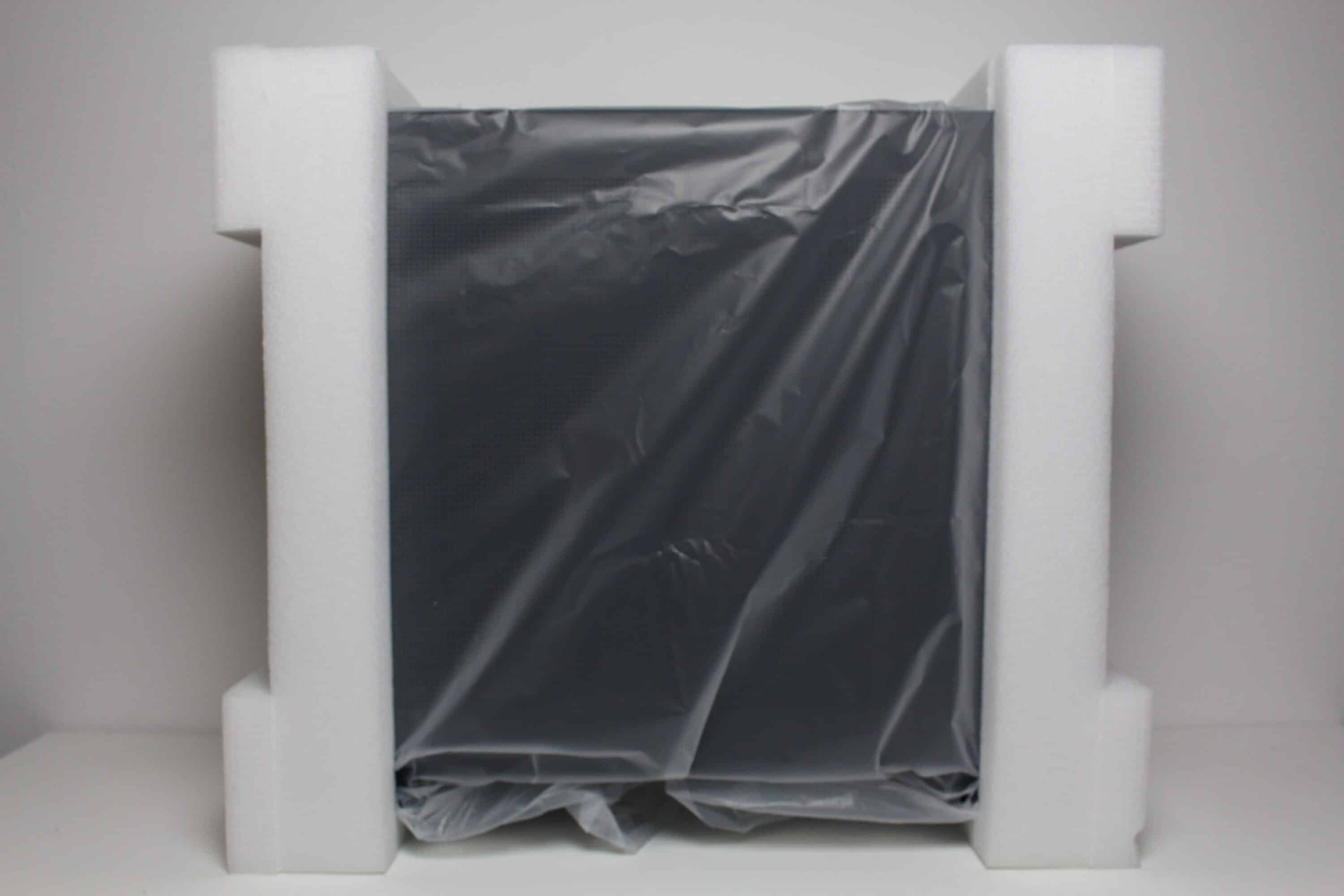 Im Inneren des Kartons umhüllt Jonsbo das U4 Mini mit zwei Blöcken aus einem elastischen Schaumstoff sowie mit einer dicken Kunststofffolie. Diese Kombination sollte den Mini-Tower während des Transports gut schützen. Das Zubehör platziert der Hersteller in einem Kunststoffbeutel. Enthalten sind dort alle notwendigen Montageschrauben in beschrifteten Tütchen, eine Nuss zum Eindrehen der Abstandshalter, 12 Lüfterschrauben, einige Kabelbinder sowie eine Montageanleitung bzw. Garantieinformationen.