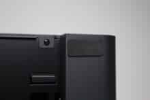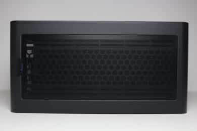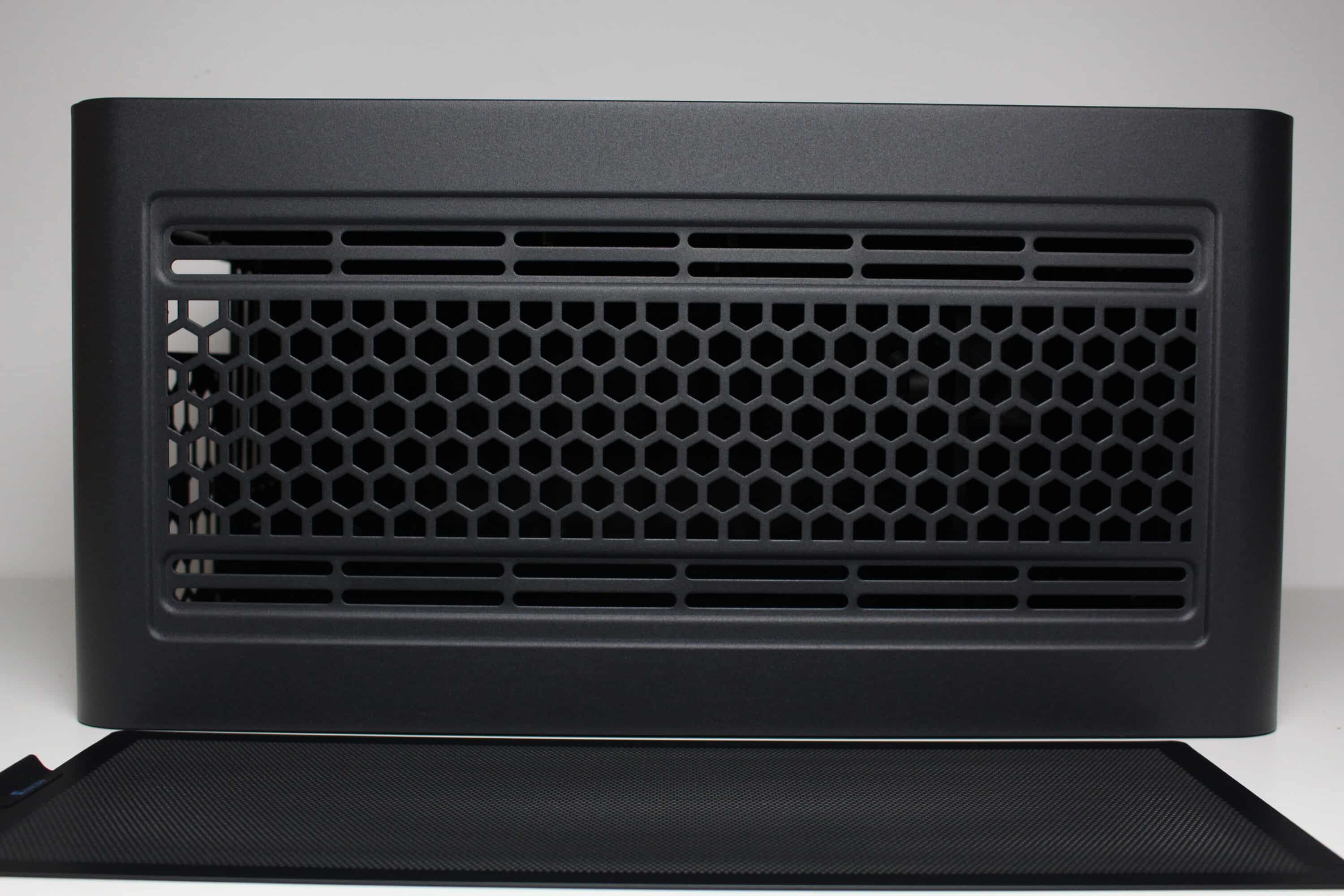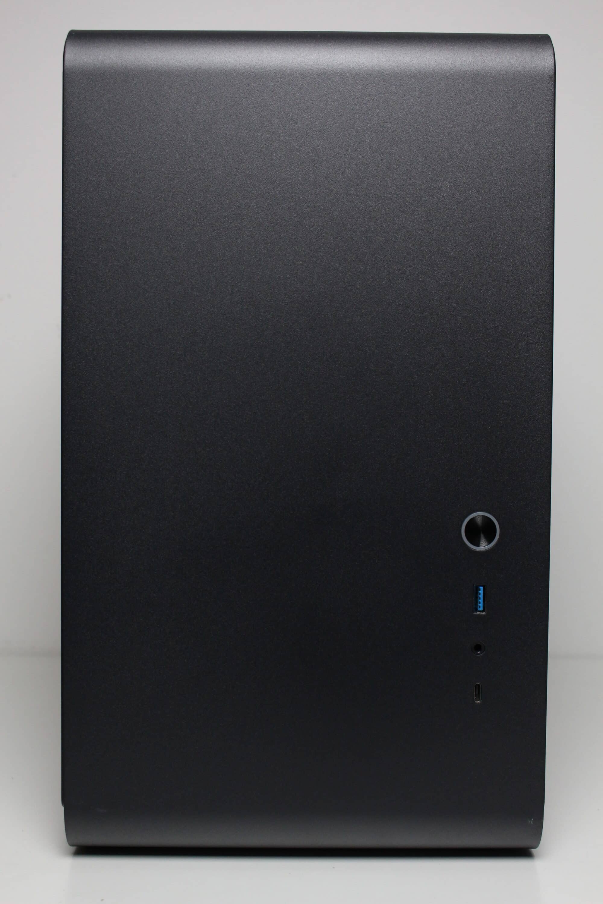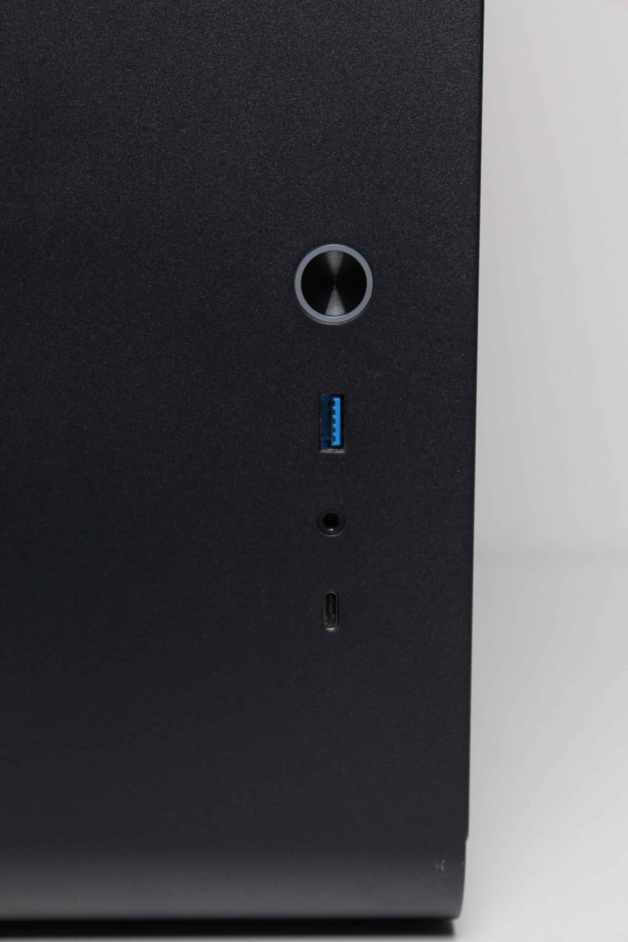 Wie bereits erwähnt, bestehen die Front, der Deckel, das Heck und die Standfüße vollständig aus Stahl bzw. bilden ein zusammenhängendes Element, welches mehrfach gebogen wurde. Ansonsten ist die Front vollständig geschlossen, bietet aber Platz für das I/O-Panel. Dieses wurde in der unteren rechten Ecke platziert und besteht aus zwei USB-Ports (1x USB-C 3.2 Gen2, 1x USB-A 3.0), einer HD-Audio-Buchse für Kopfhörer bzw. Mikrofon sowie einem weiß beleuchteten Power-Taster.