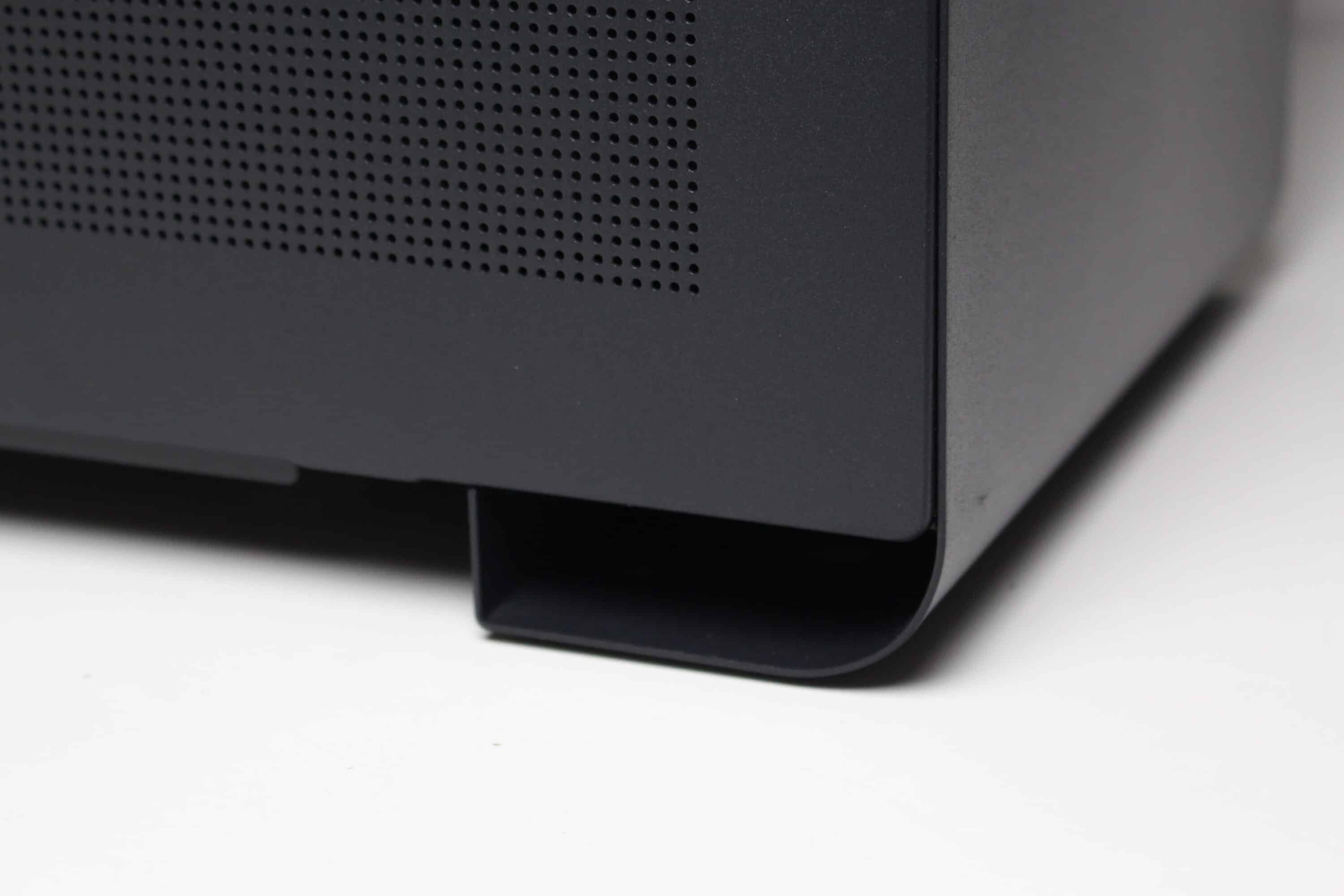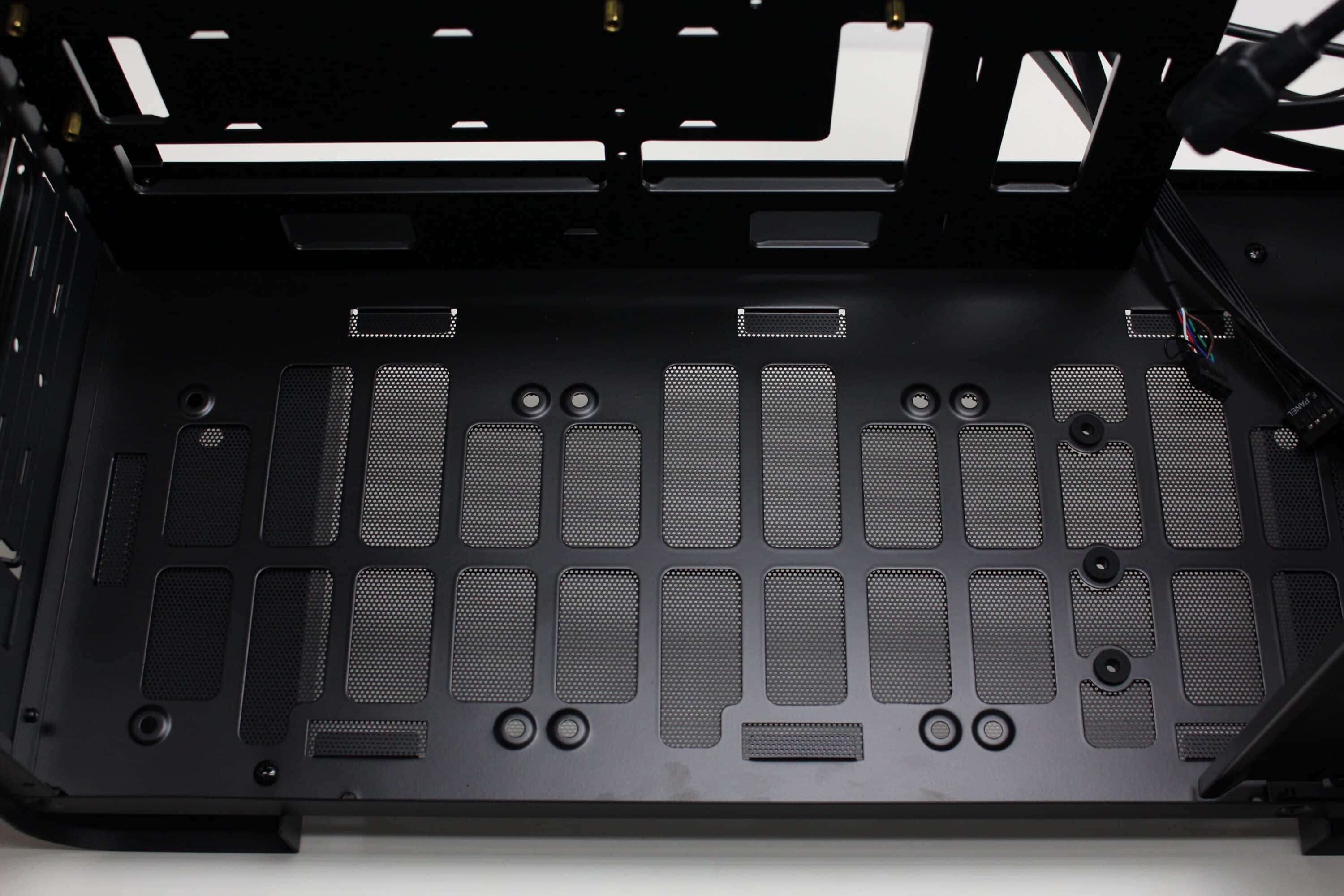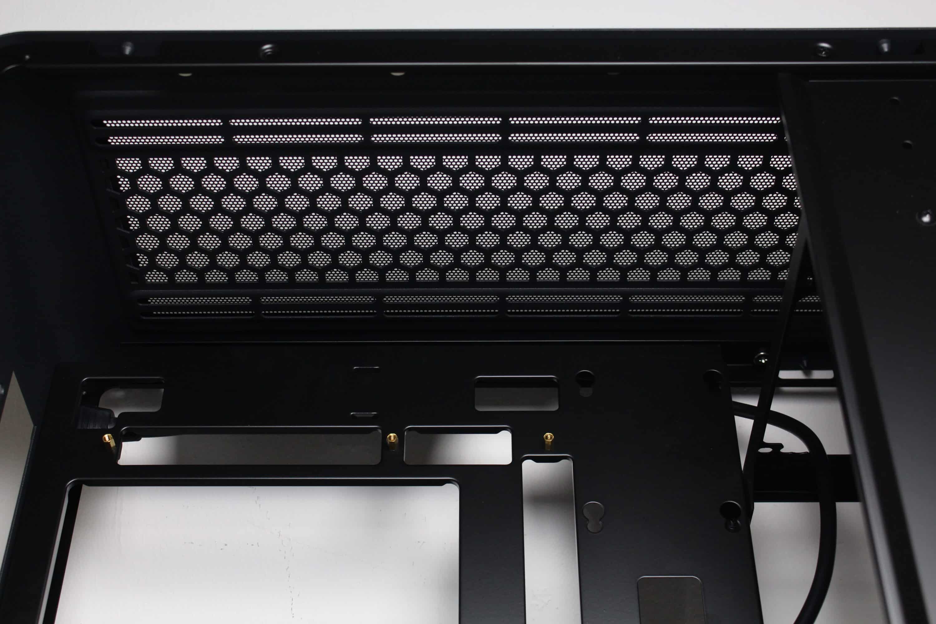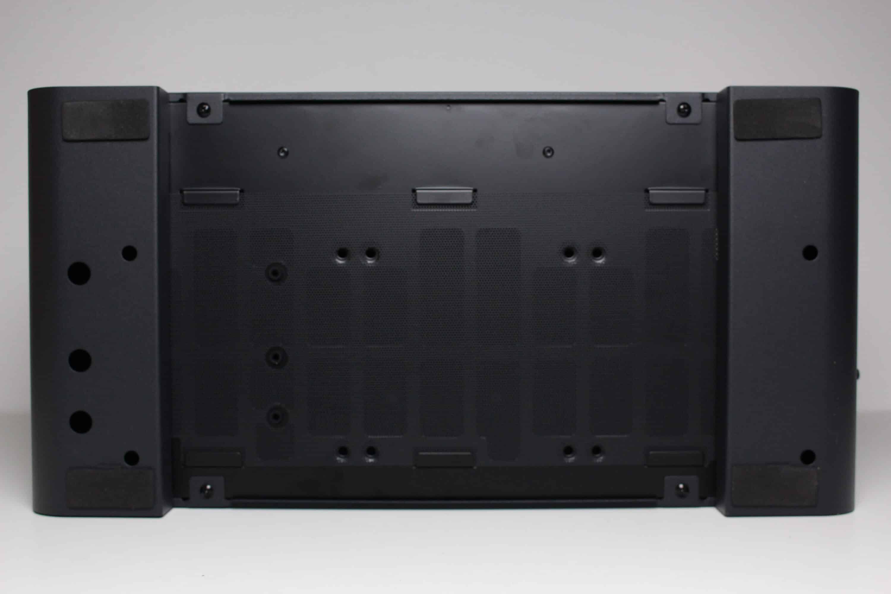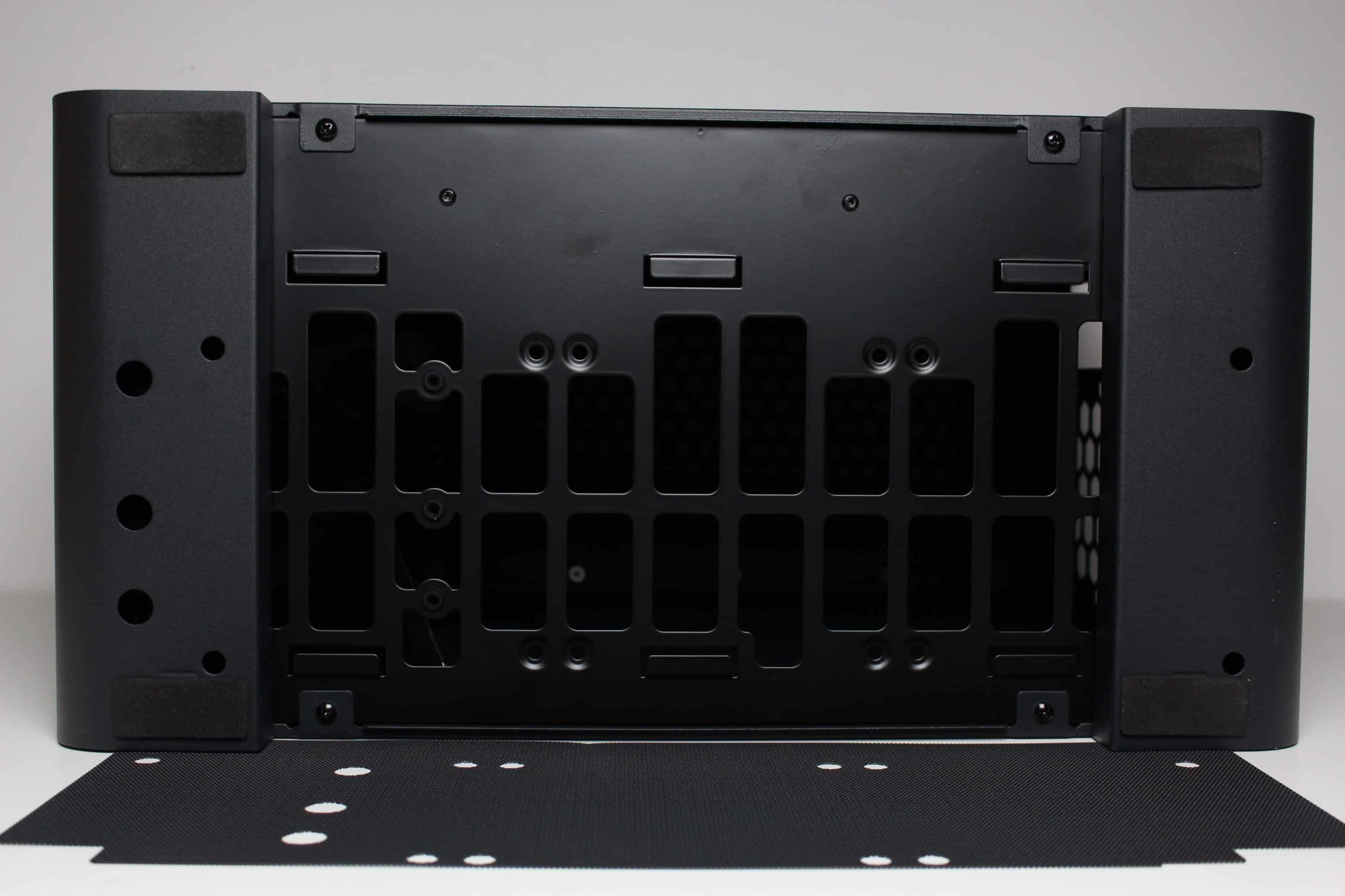 Die Unterseite macht da weiter, wo der Deckel aufgehört hat. Denn auch hier ermöglicht der Aufbau des U4 Mini die Montage von bis zu drei 120-mm-Lüftern oder eines einzelnen 360-mm-Radiators. Zum Schutz vor Staub wurde auch hier ebenfalls eine Staubfiltermatte aus Mesh platziert. Anders als im Deckel verfügt diese aber nicht über Magnete und muss über Stahllaschen eingehakt werden. Die Standfüße sind Teil des Korpus uns bestehen aus gebogenem Stahl. Zum Schutz des Untergrundes verfügen diese zusätzlich über Gummistreifen.