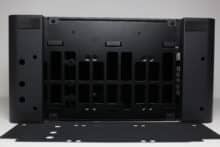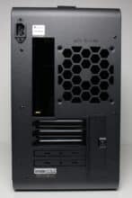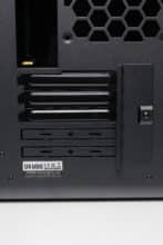 An der Rückseite fällt nach kurzer Betrachtung direkt auf, dass es hier keine Öffnung für das Netzteil gibt, sondern nur eine Buchse für das Kaltgerätekabel. Weiterhin lassen sich im unteren Bereich fünf Slots für Erweiterungskarten erkennen, von denen immerhin drei mit wiederverwendbaren Blenden ausgestattet wurden. Die Verschraubung der Blenden oder Erweiterungskarten erfolgt von außen. Darüber gibt es Platz für einen einzelnen 120-mm-Lüfter sowie den Ausschnitt für die I/O-Blende des Netzteils.