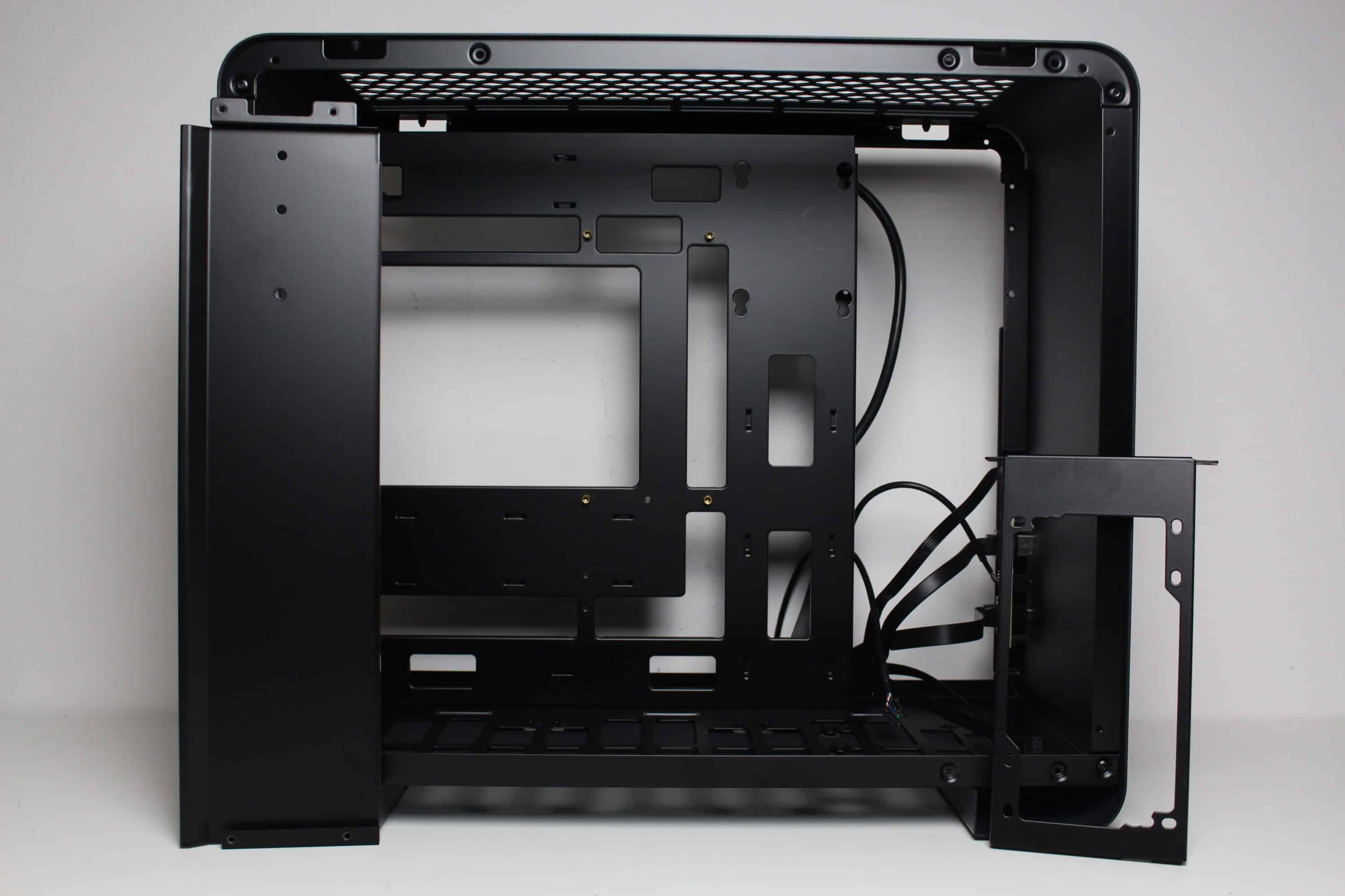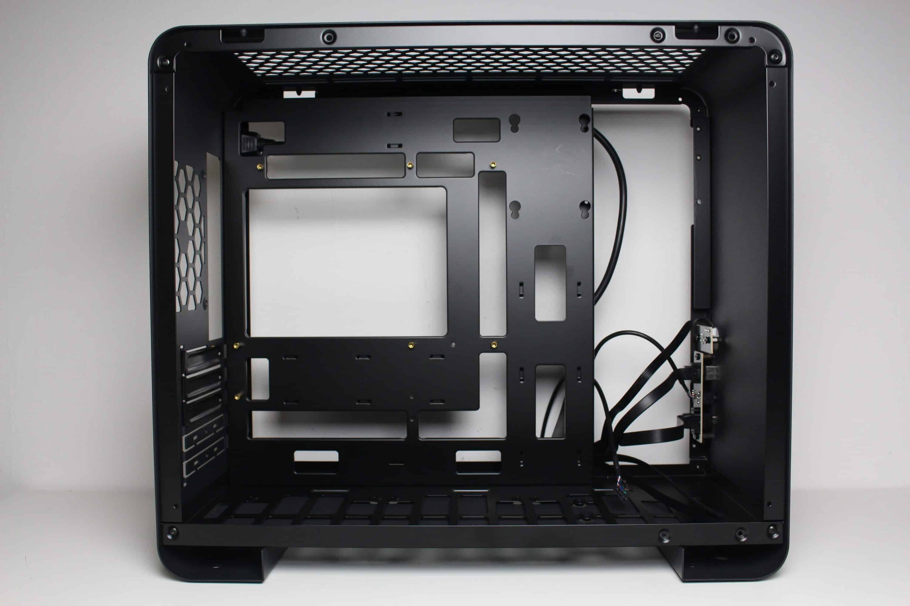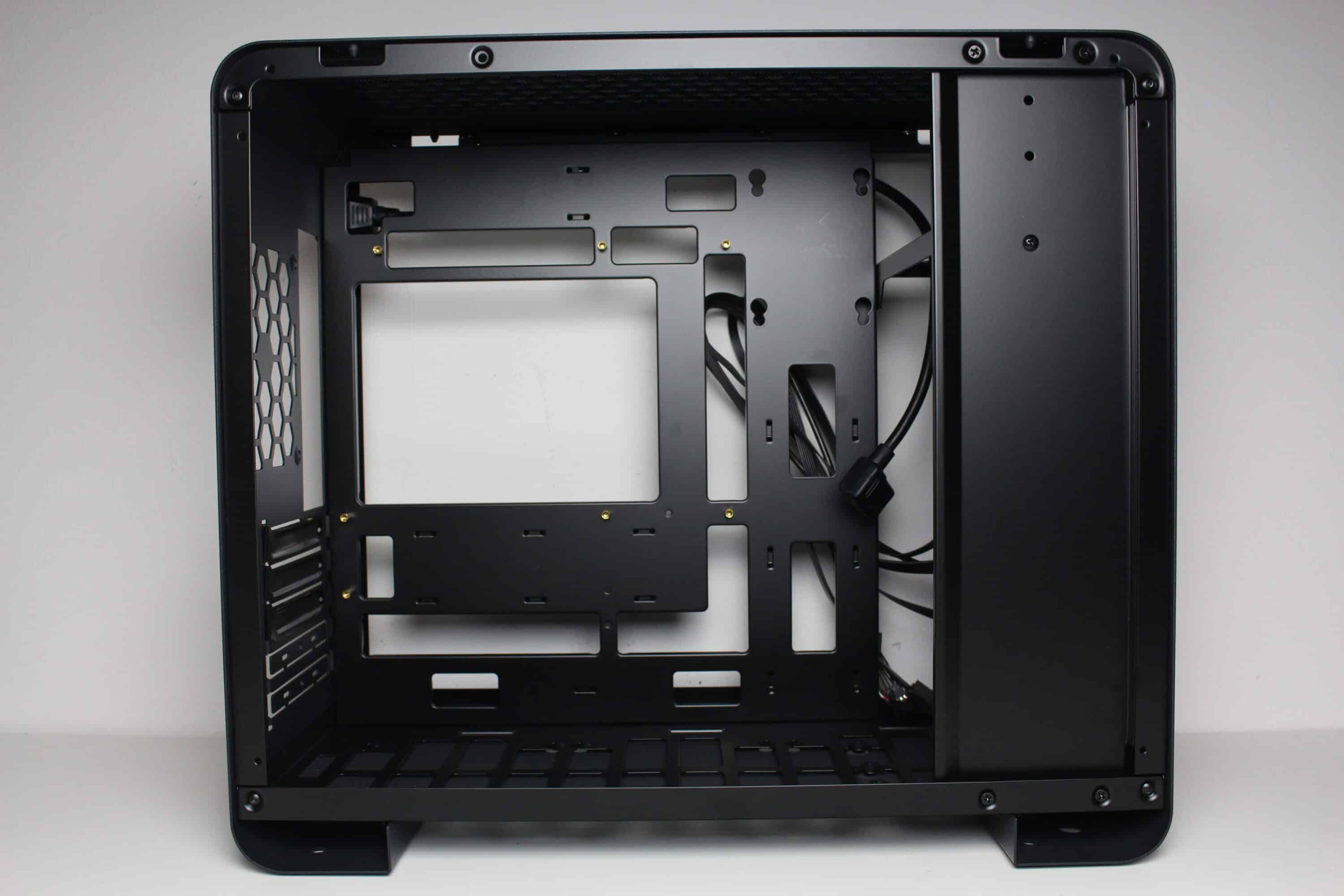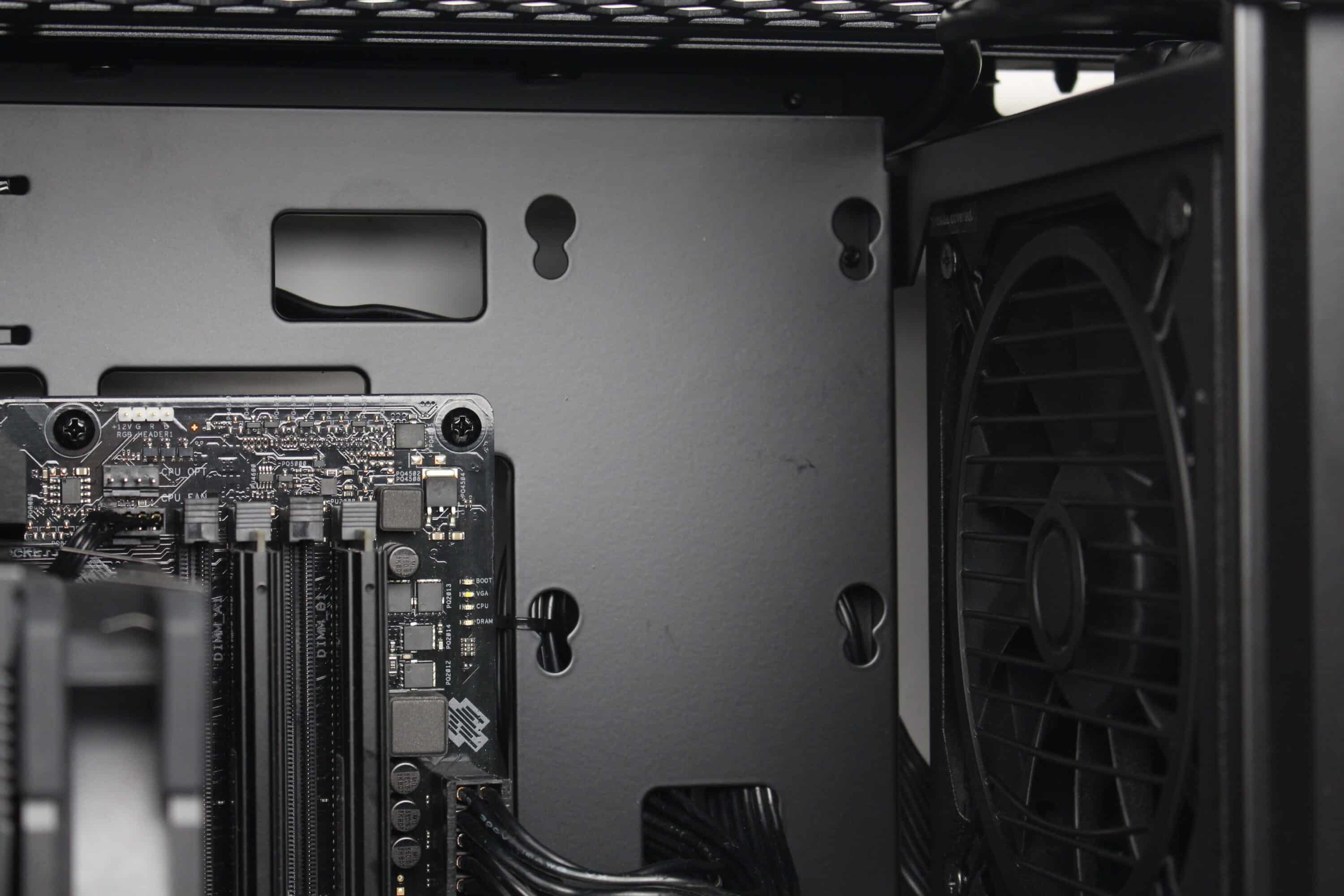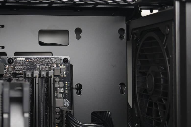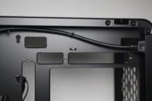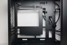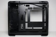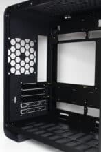 Wie bereits vermutet, wird das ATX-Netzteil im Innenraum des U4 Mini mit einem Rahmen hinter dem Frontpanel befestigt. Der Lüfter muss aufgrund der geschlossenen Front in jedem Fall nach Innen zeigen. Im Heck erkennen wir den freien Lüfterplatz sowie fünf Erweiterungsslots, was für einen Mini-Tower eher ungewöhnlich ist. Ober- und unterhalb des Mainboard-Trays gibt es zudem auch ausreichend Platz für bis zu zwei 360-mm-Radiatoren.