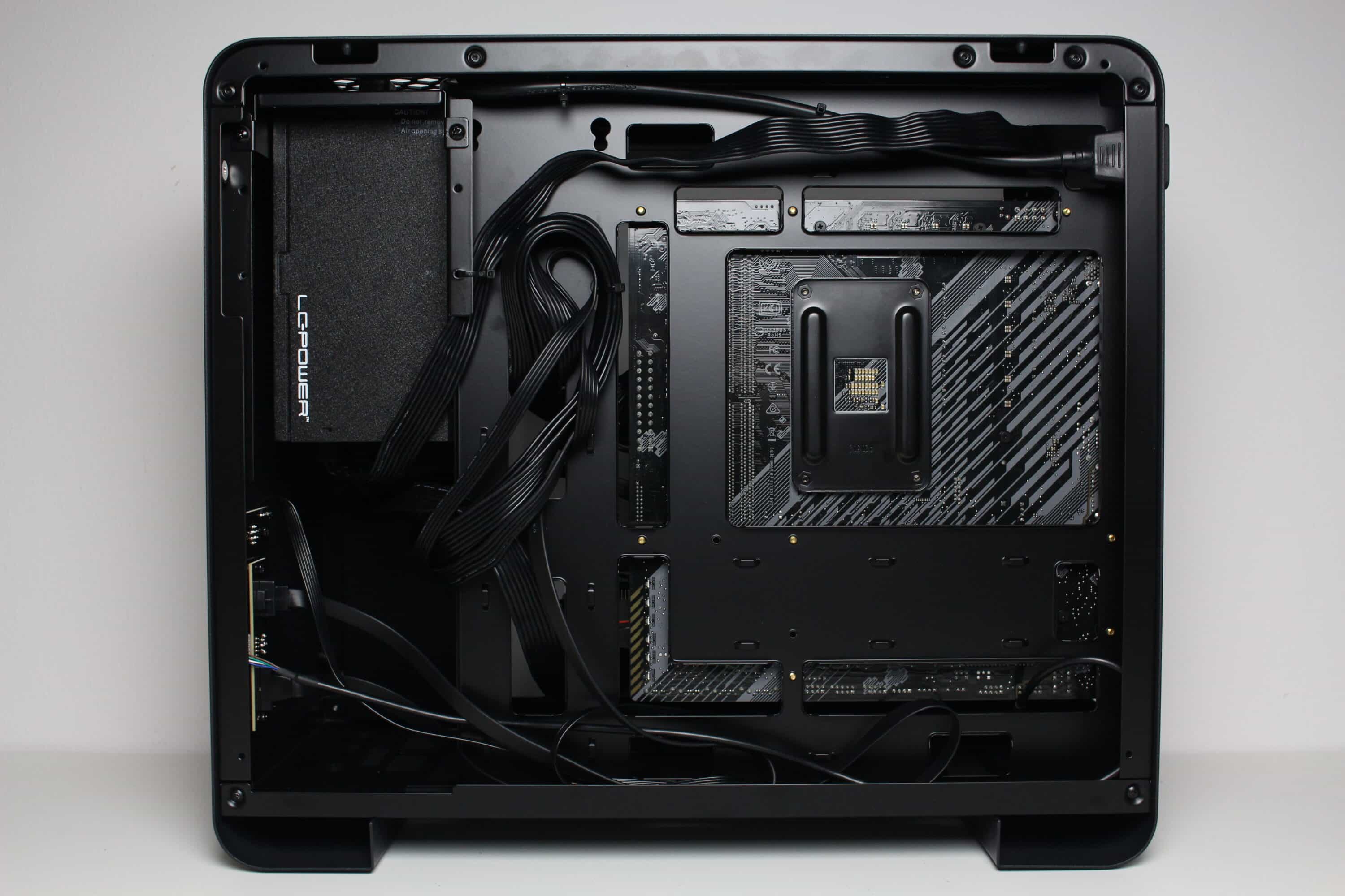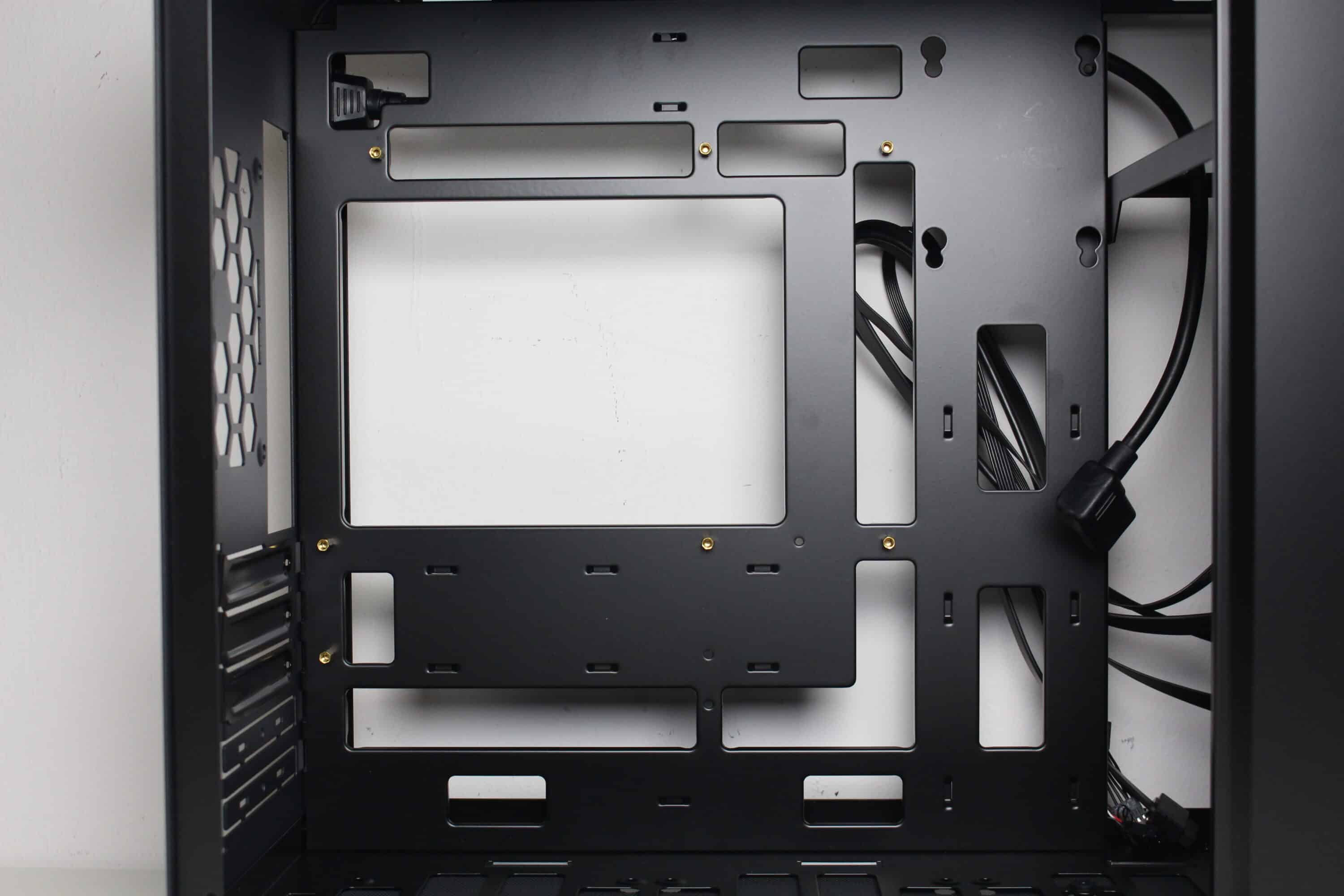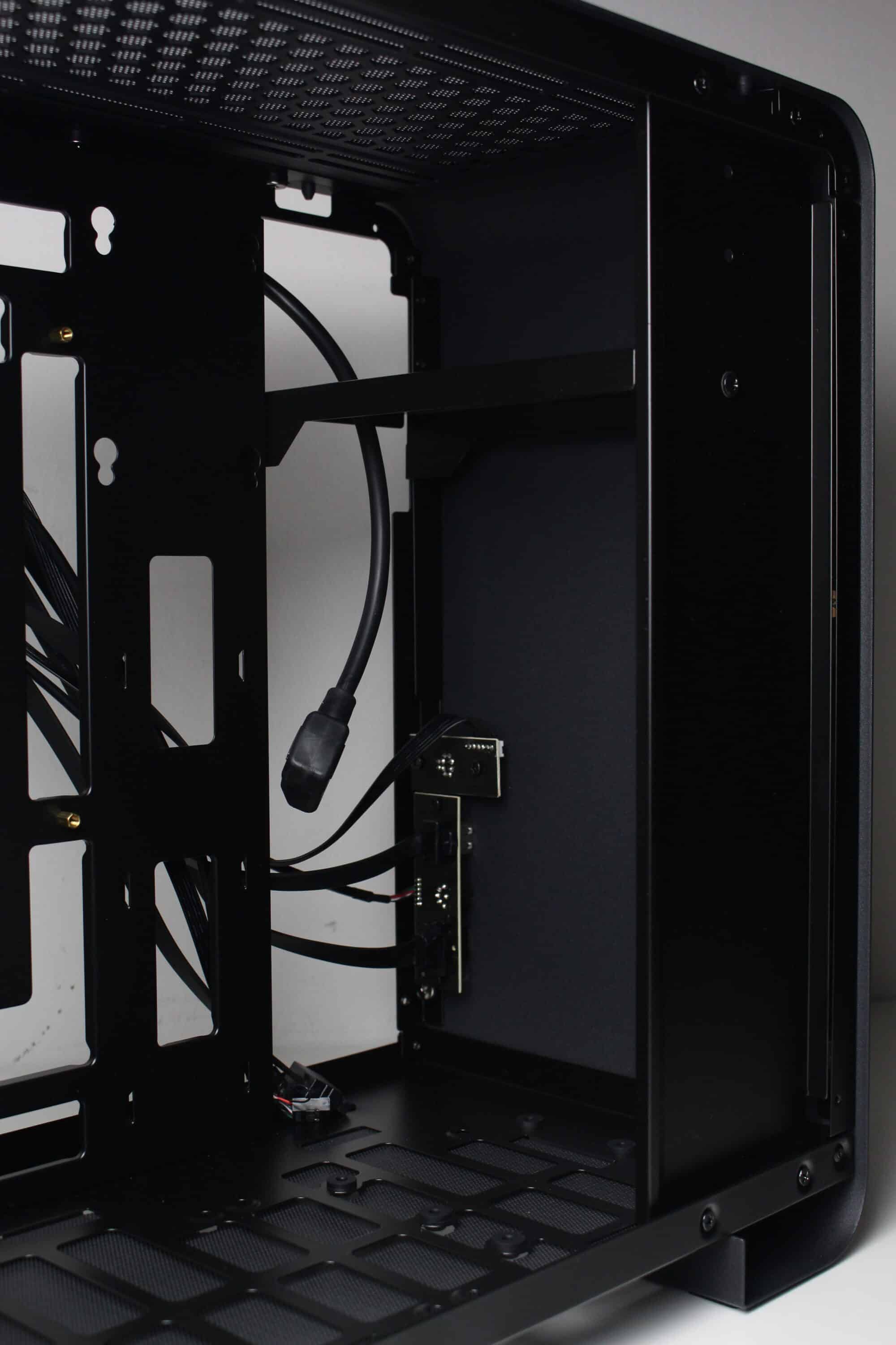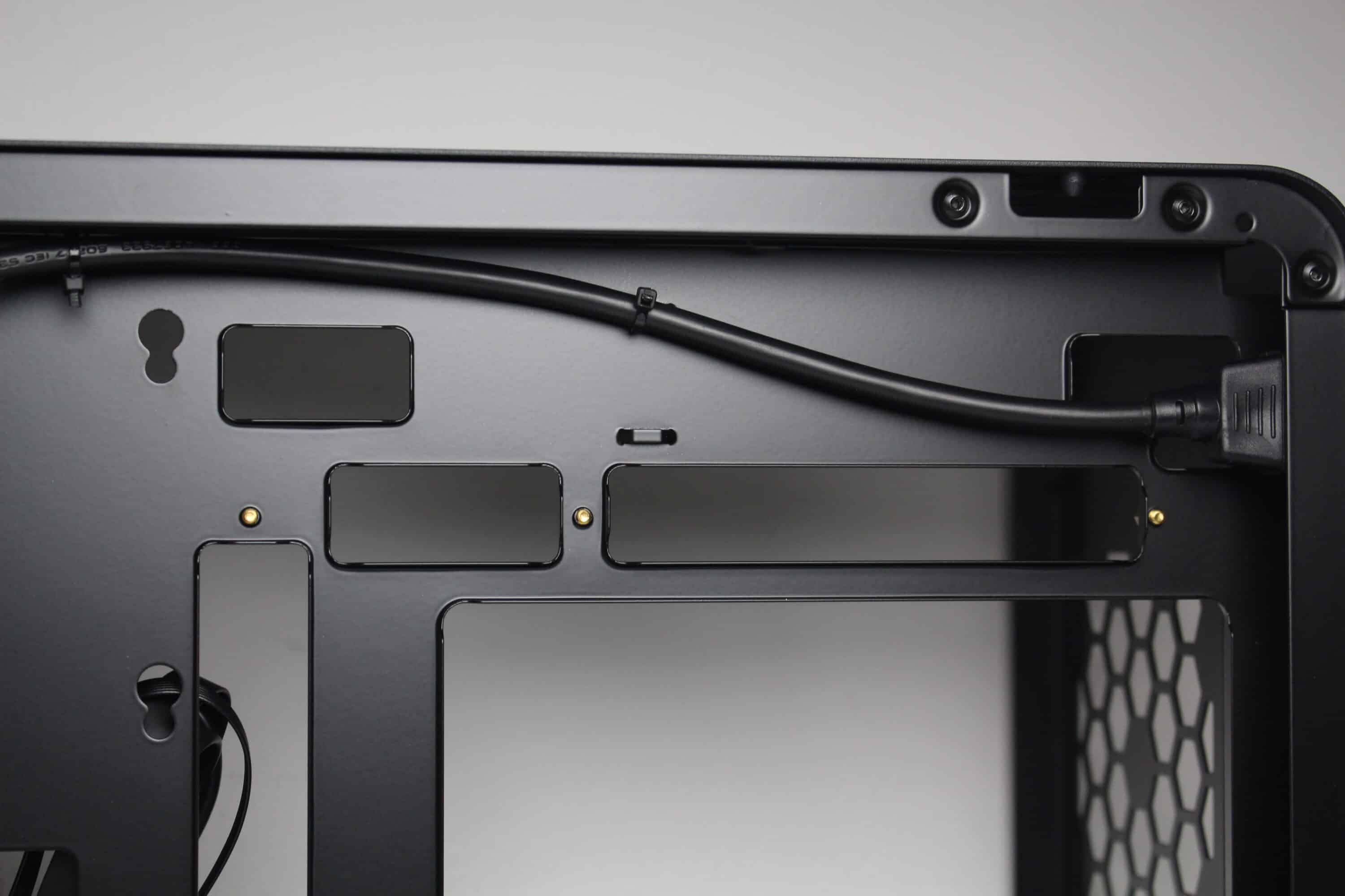 An der Rückseite des Mainboard-Trays gibt es mit bis zu 30 Millimetern Platz sehr viel Spielraum zum Verlegen der Kabel. Zusätzlich helfen dabei die sinnvoll platzierten Kabelmanagementöffnungen sowie Ösen zum Verzurren der Kabelbinder. Der Netzteilrahmen ist modular aufgebaut und kann an drei verschiedenen Positionen hinter der Front befestigt werden. Dazu muss man lediglich drei Schrauben lösen. Das Kaltgerätekabel hat Jonsbo vorverlegt und im Bereich des Netzteilrahmens platziert.
