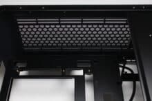Im Vergleich zur Front ist der Deckel des U4 Mini sehr airflow-freundlich gestaltet. So finden wir hier eine große Belüftungsöffnung mit Montageschienen für drei 120-mm- oder zwei 140-mm-Lüfter. Alternativ können hier natürlich auch entsprechend große Radiatoren untergebracht werden. Oberhalb der Öffnung positioniert der Hersteller zudem eine magnetische Staubfiltermatte aus Mesh.