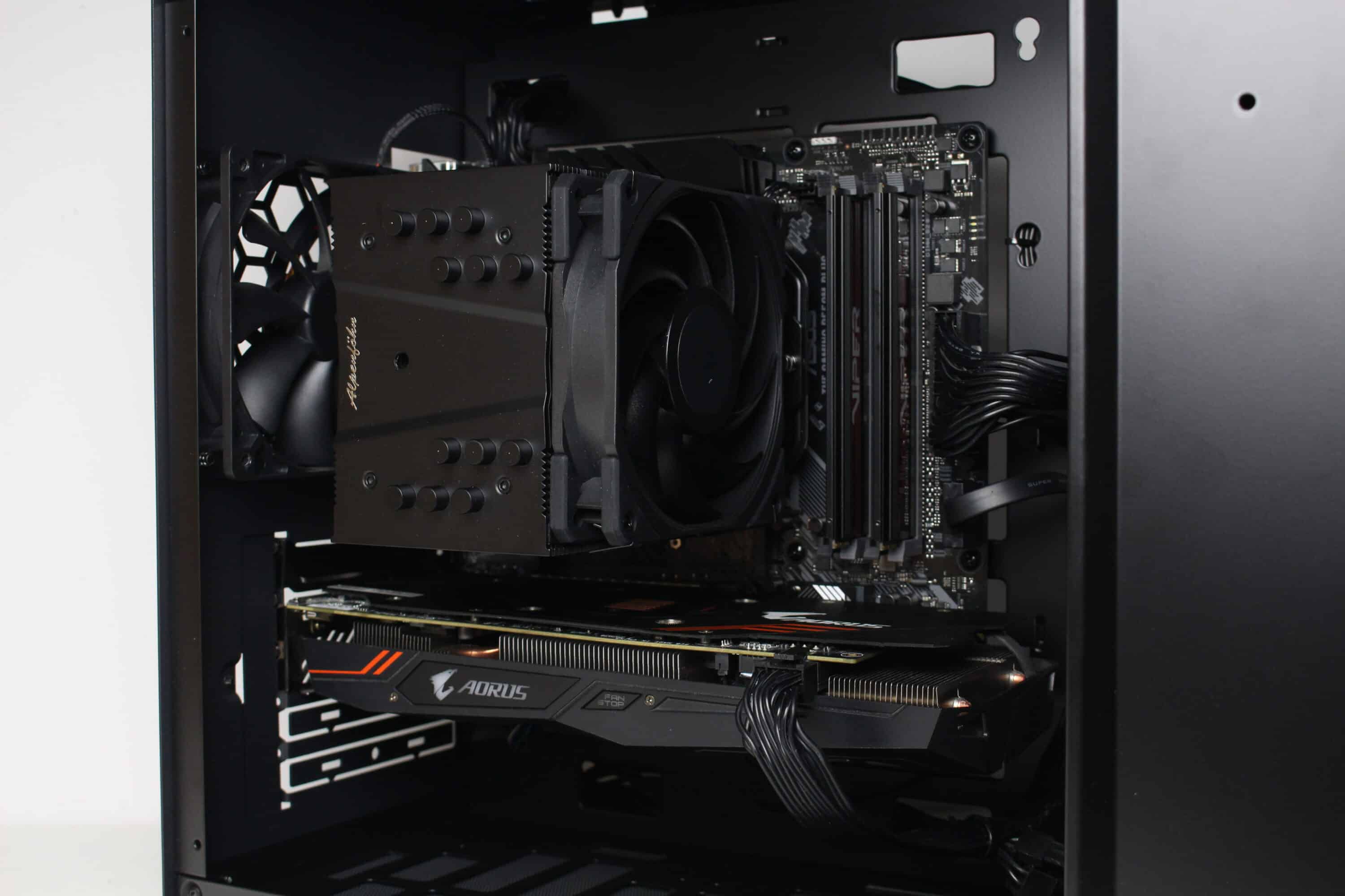 Nun kommen wir zum Systemeinbau beim Jonsbo U4 Mini Test. Als Hardware verwenden wir einen AMD Ryzen 5 1400* auf einem ASUS TUF Gaming B550M-Plus* mit 16GB Crucial Ballistix Sport LT grau DDR4-2666*. Der Ryzen wird von einem Alpenföhn Brocken 4* gekühlt und ist auf 3,8 GHz (1,175 V) übertaktet. Für die Bildausgabe ist eine Gigabyte AORUS GTX 1060 6GB zuständig. Die Stromversorgung erledigt das vollmodulare LC-Power LC550 V2.31 Platinum*.