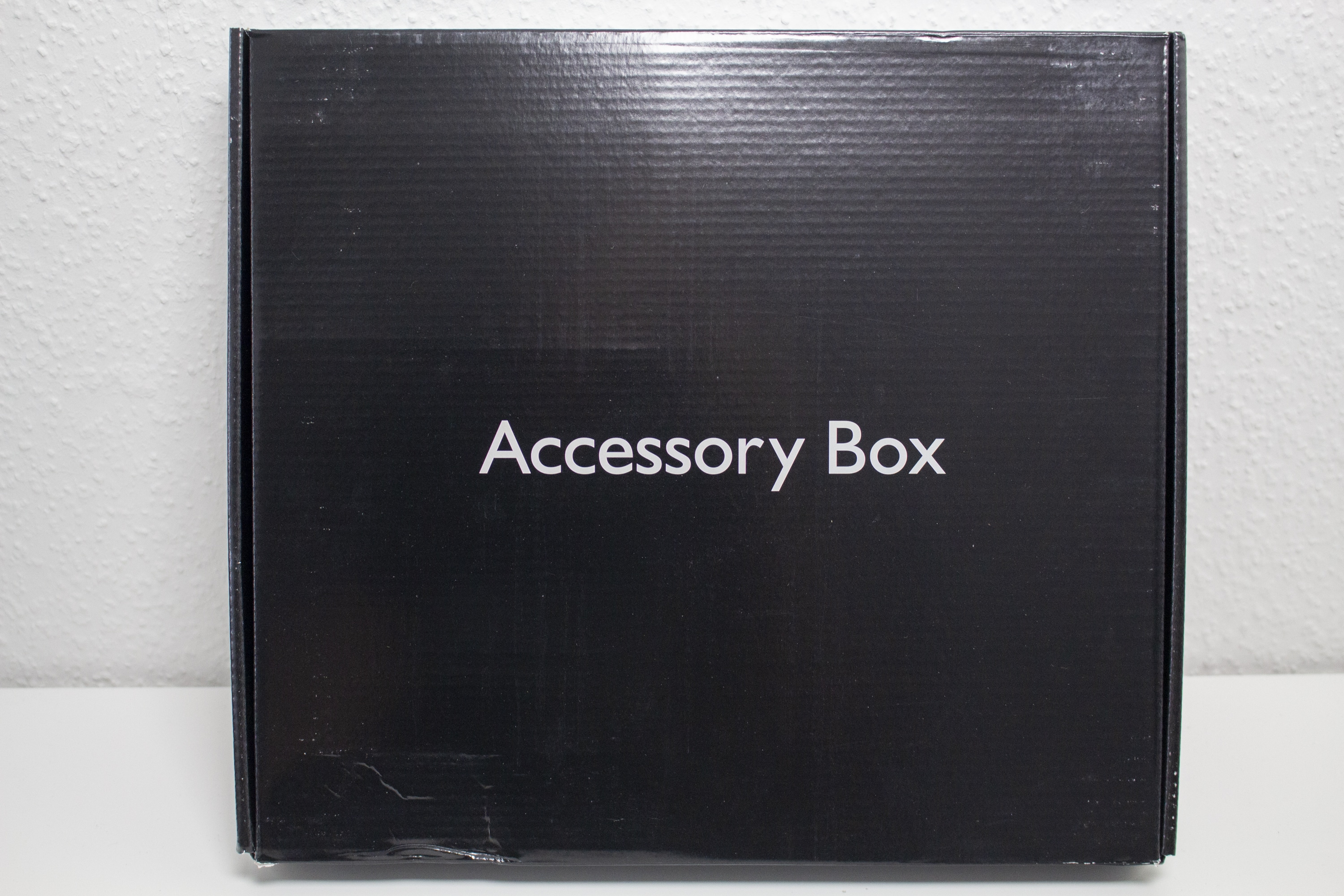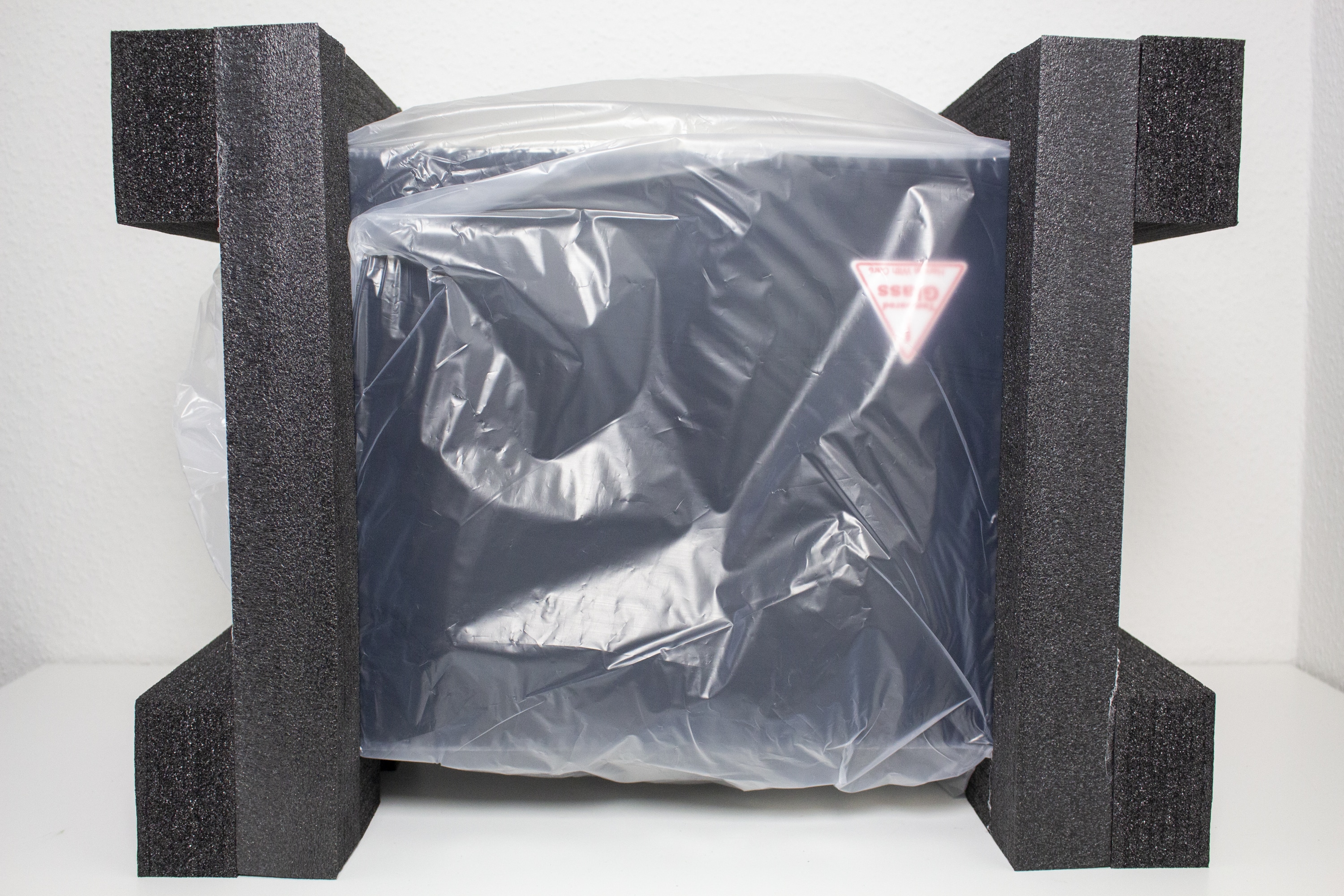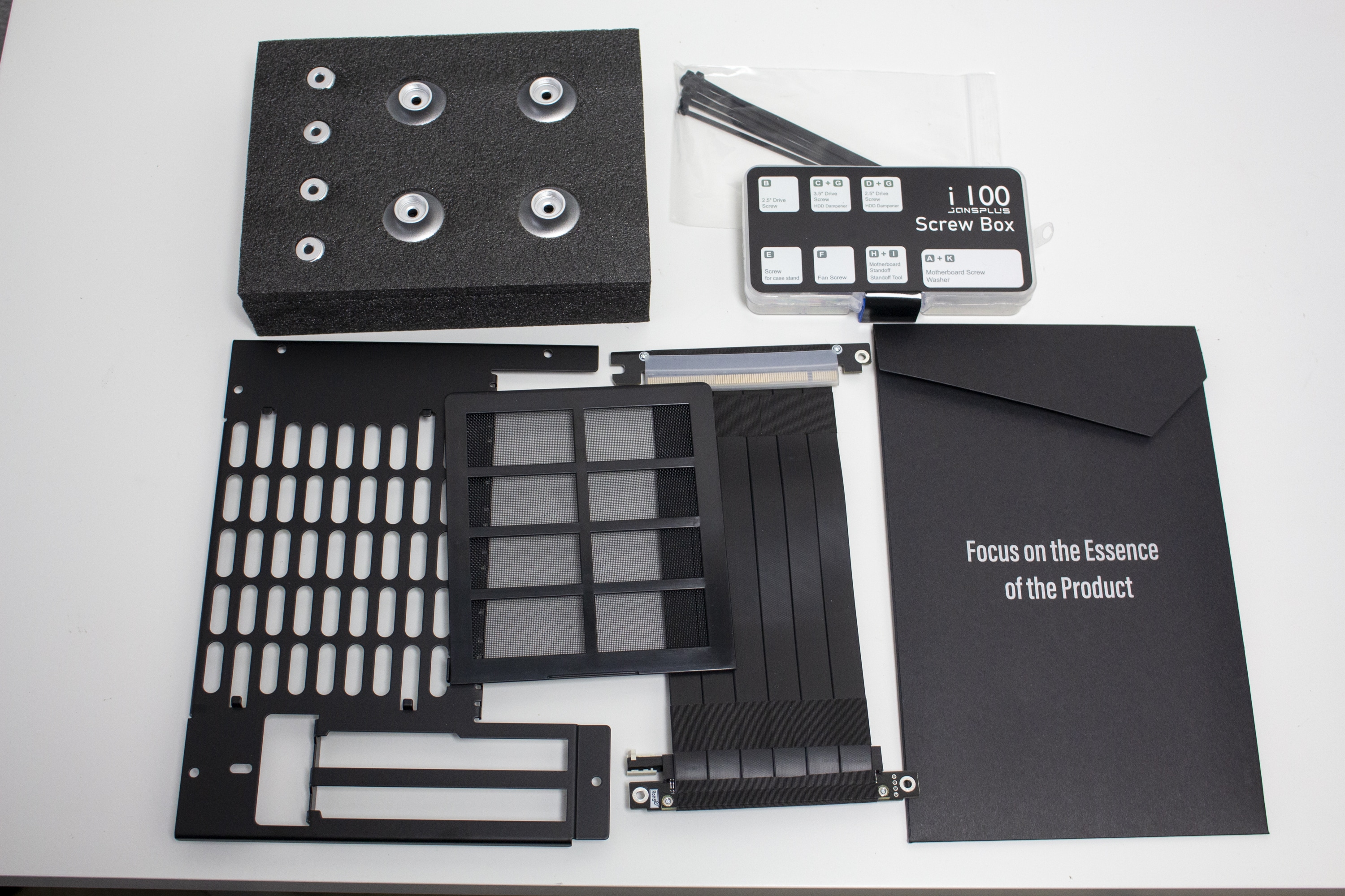 Jonsplus verpackt das i100 Pro in einem farbig bedruckten Karton aus Pappe. Umrandet von viel schwarzer Farbe sind auf der Verpackung zwei Bilder des Produktes und der Produktname aufgedruckt. Auf technische Daten hat Jonsplus komplett verzichtet. Lediglich ein Hinweis zur Modellvariante kann man auf der Verpackung erkennen. Umhüllt von weichem Styropor und einer Schutzfolie aus Kunststoff, versteckt sich das Gehäuse innerhalb des Kartons. Das mitgelieferte Zubehör hat der Hersteller in einer hochwertigen Schachtel innerhalb der Hauptverpackung untergebracht. Mitgeliefert werden eine Box mit Montageschrauben, das PCIe-3.0-Riser-Kabel, vier Standfüße, eine alternative Blende für die Rückseite, ein Staubfilter und eine ausführliche Montageanleitung. Insgesamt hat sich Jonsplus beim Zubehör also schon mal nicht lumpen lassen.