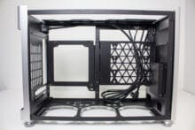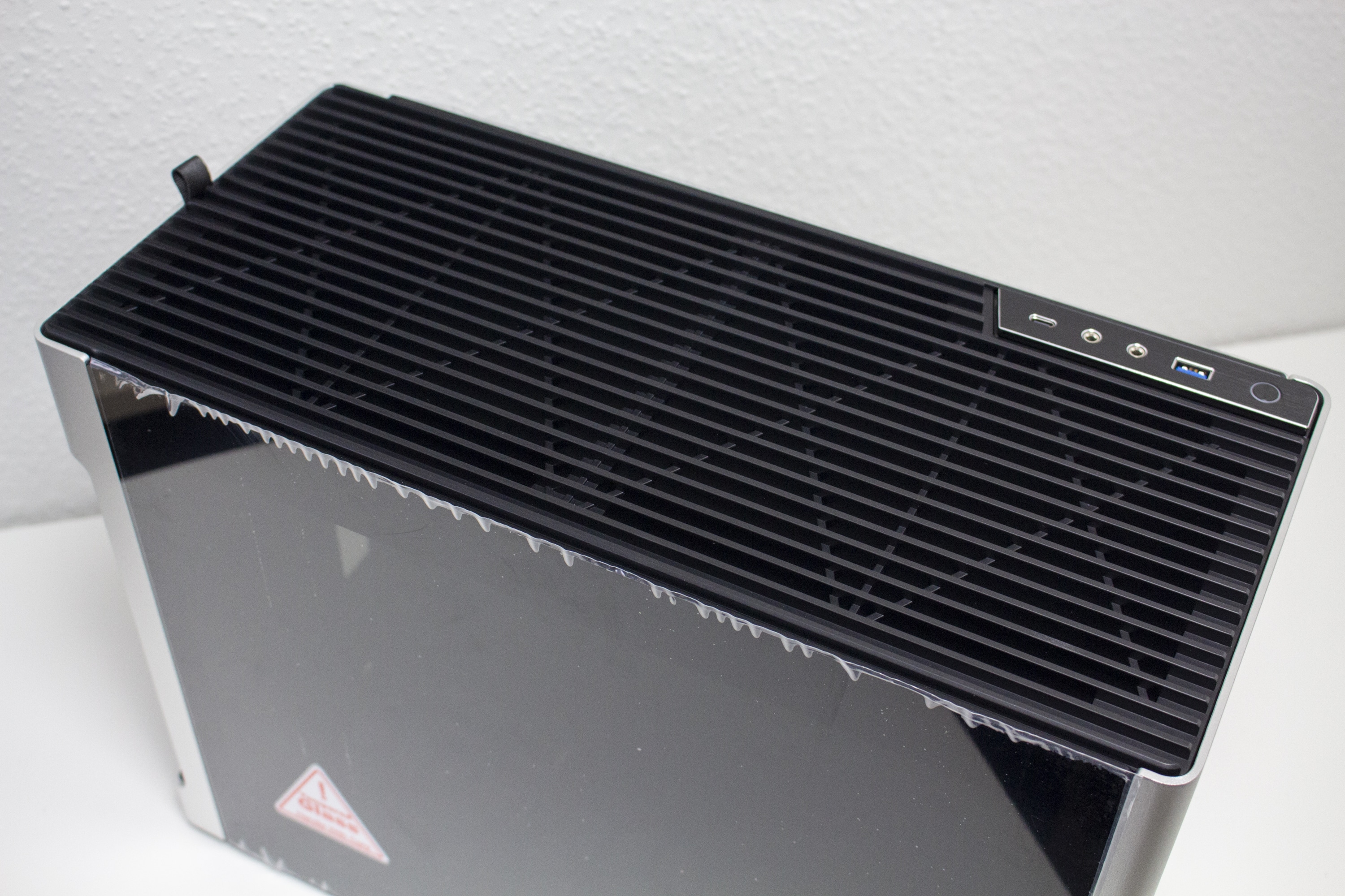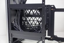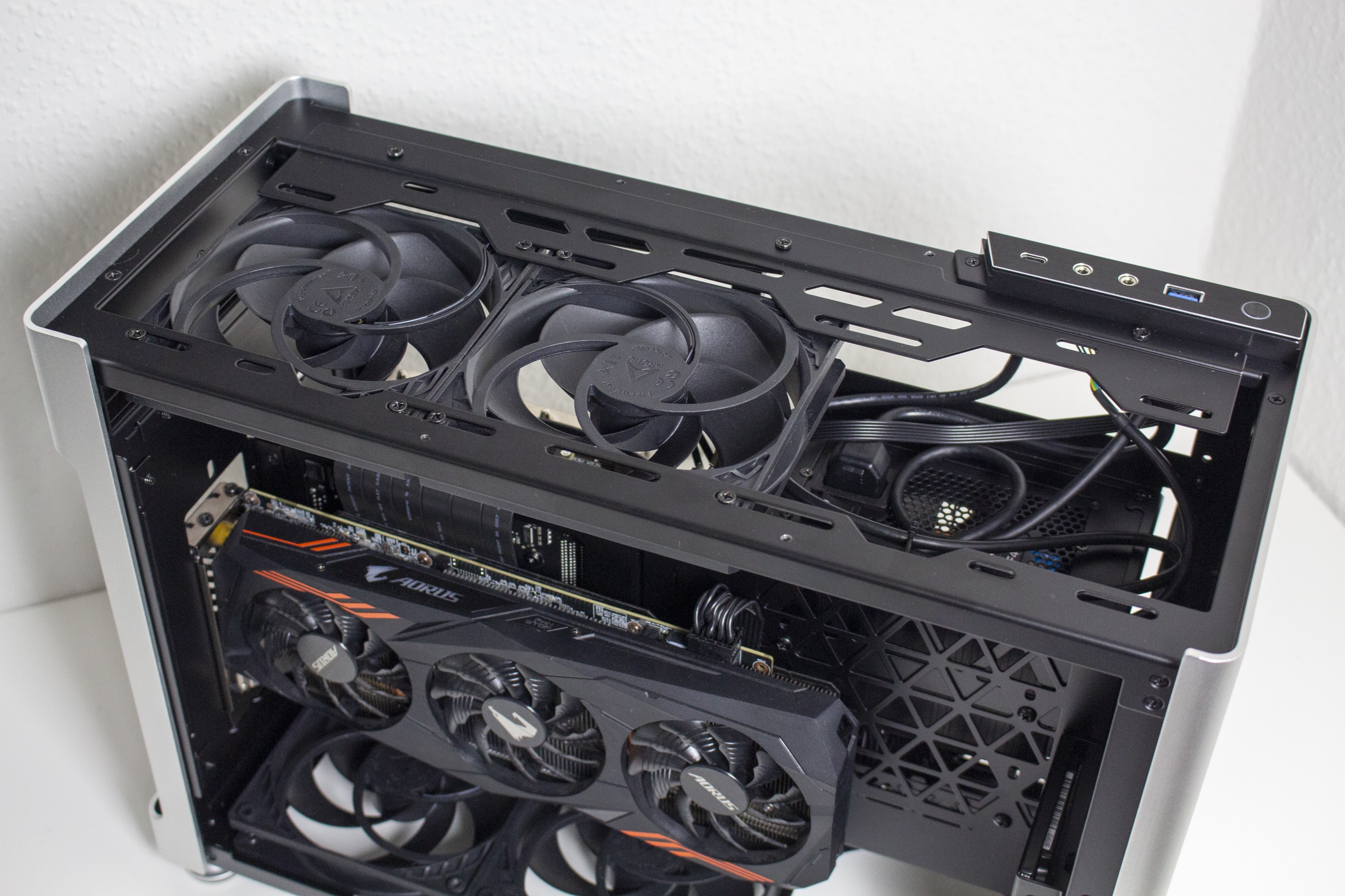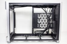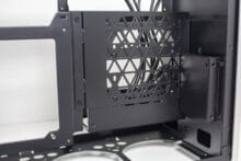 Die Gestaltung des Deckel erlaubt optional auch die Montage einer 360er AiO-Wasserkühlung mit einer gemeinsamen Tiefe von 55 Millimetern für Radiator und Lüfter. Das ermöglicht auch den Einbau bzw. die vernünftige Kühlung einer High-End-CPU. Davon unabhängig kann die Grafikkarte vertikal oder horizontal verbaut werden, solange ein SFX-Netzteil zum Einsatz kommt.