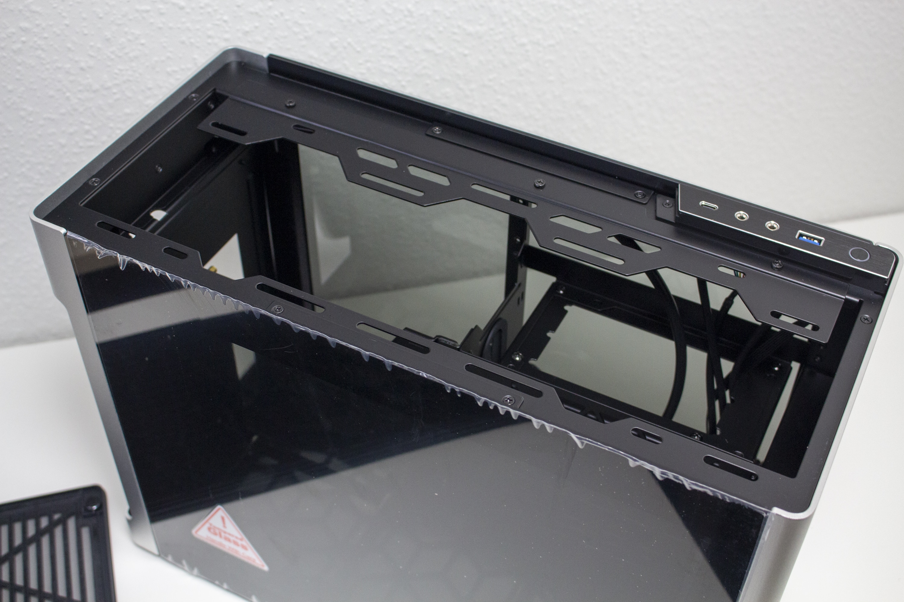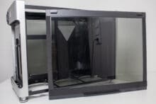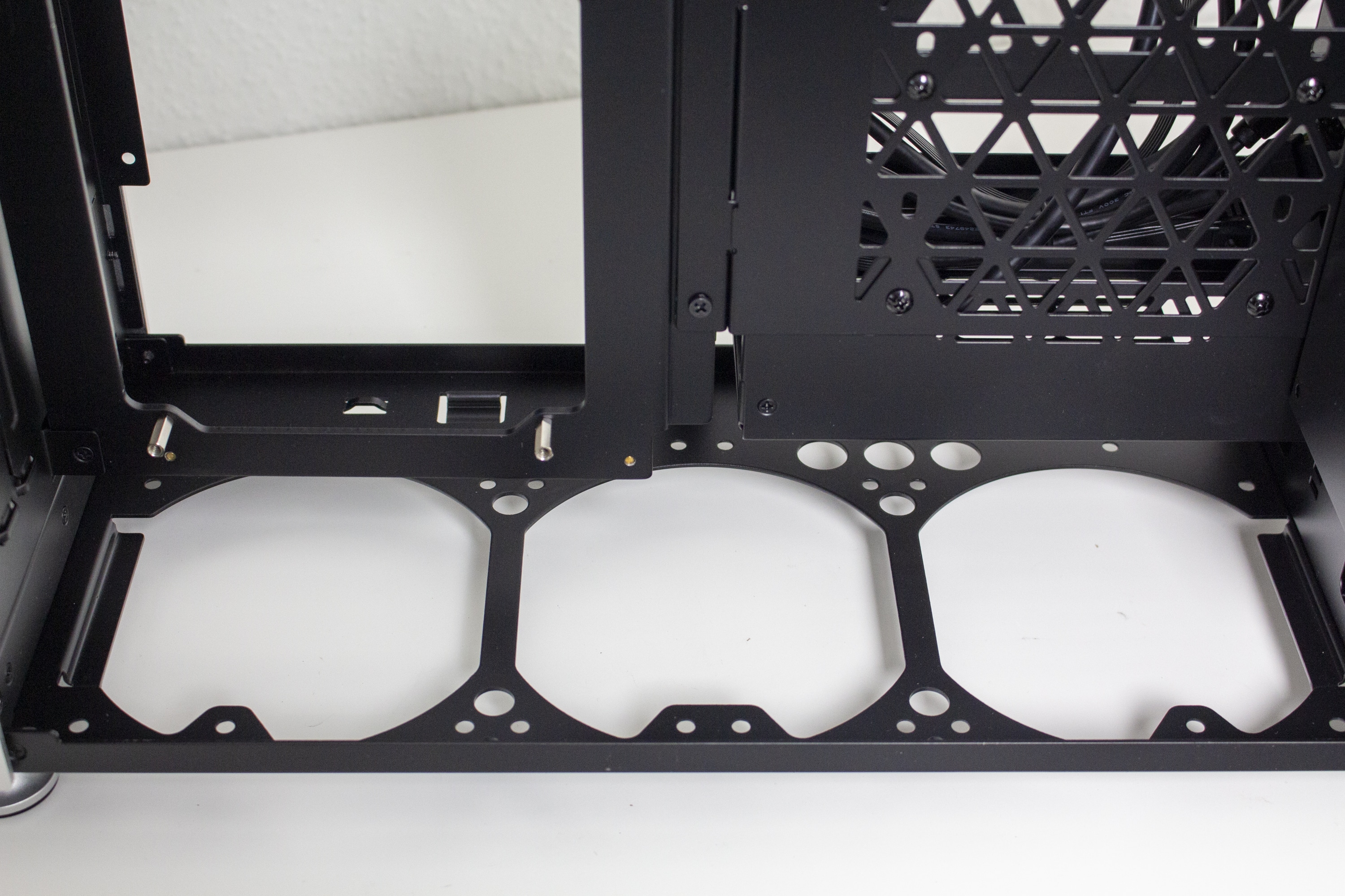 Wie für ein Gehäuse dieser Preisklasse zu erwarten war, ist die Verarbeitungsqualität auf einem sehr hohen Niveau. Es gibt keine Verarbeitungs- oder Lackierungsfehler und auch die Materialqualität ist sehr gut. Dennoch sind wir bei der Materialauswahl des Deckels etwas enttäuscht. Ein solch modularer Deckel aus Aluminium wäre aber in dieser Form vermutlich nicht umsetzbar gewesen.