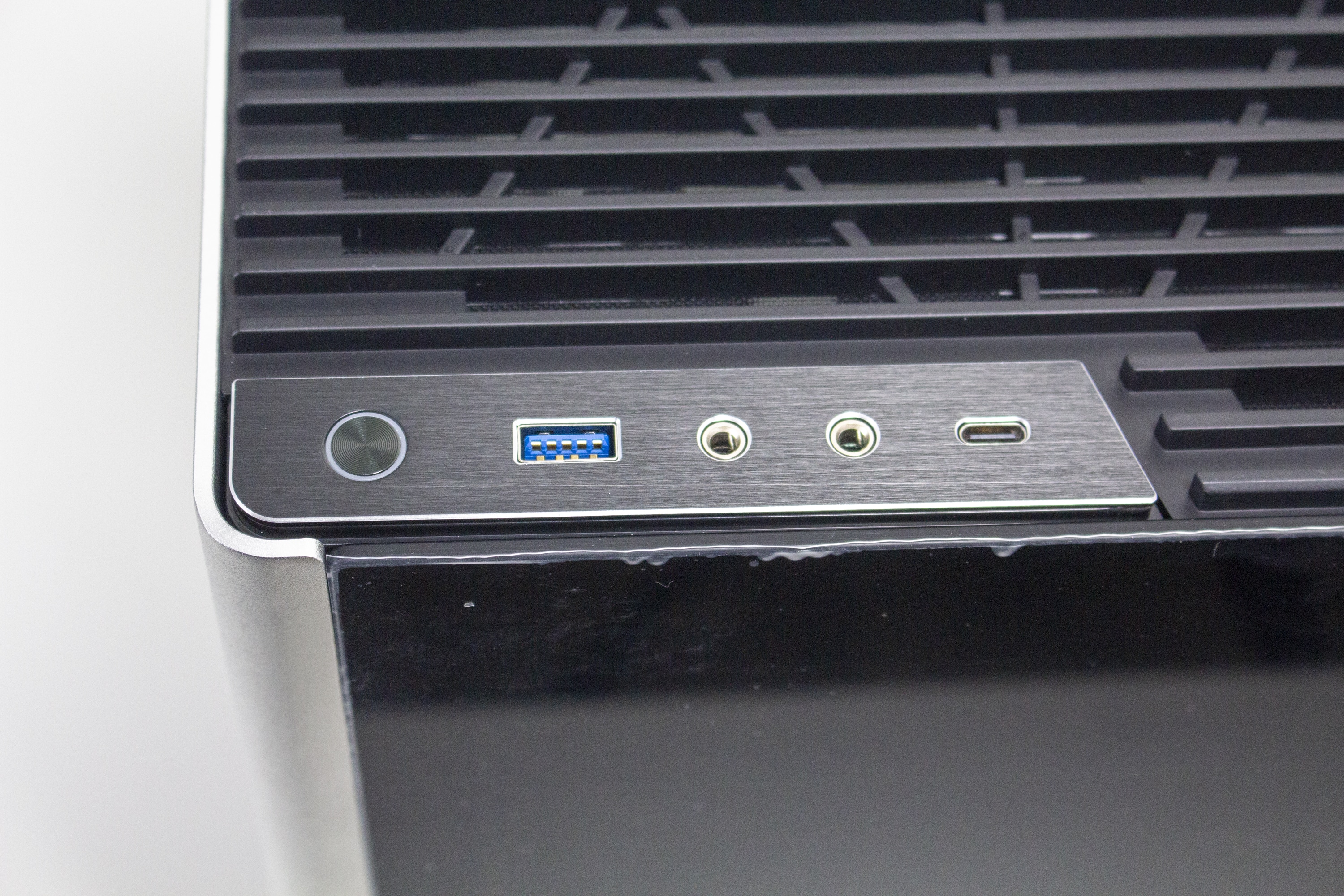 Der Deckel besteht beim i100 Pro vollständig aus Kunststoff und soll einen hohen Airflow ermöglichen. Die Befestigung erfolgt durch sechs Magnete auf der Unterseite. Ebenfalls an der Unterseite des Kunststoffgitters hat Jonsplus eine Staubfiltermatte integriert. Diese Matte ist leider nicht entfernbar. Unterhalb des Gehäusedeckels gibt es Platz für drei 120- oder zwei 140-Millimeter-Lüfter. Zuletzt findet man im Deckel noch das I/O-Panel. Dieses verfügt über einen Power-Button, zwei USB-Anschlüsse (1x USB 3.0 Typ-A, 1x USB 3.2 Typ-C) sowie zwei HD-Audio-Ports für Kopfhörer und Mikrofon.