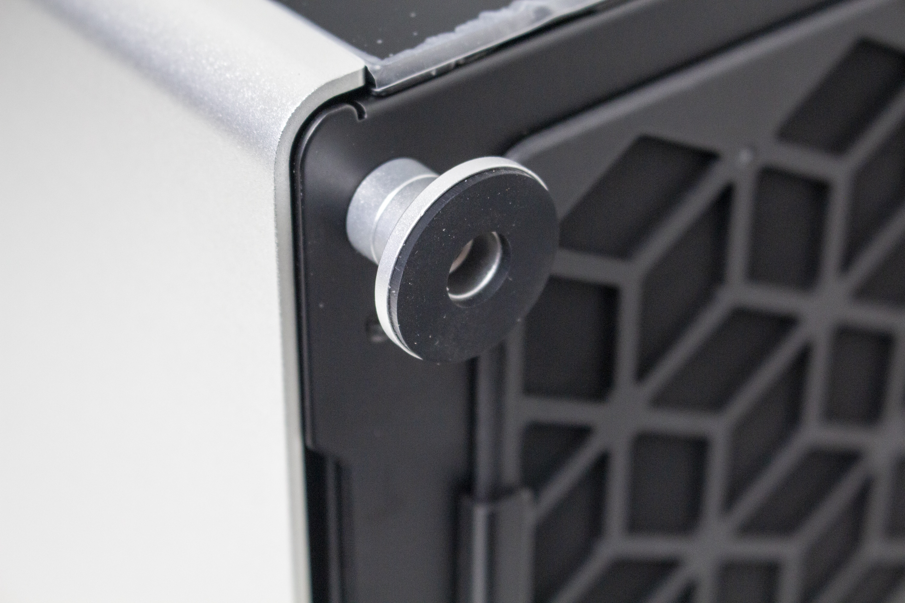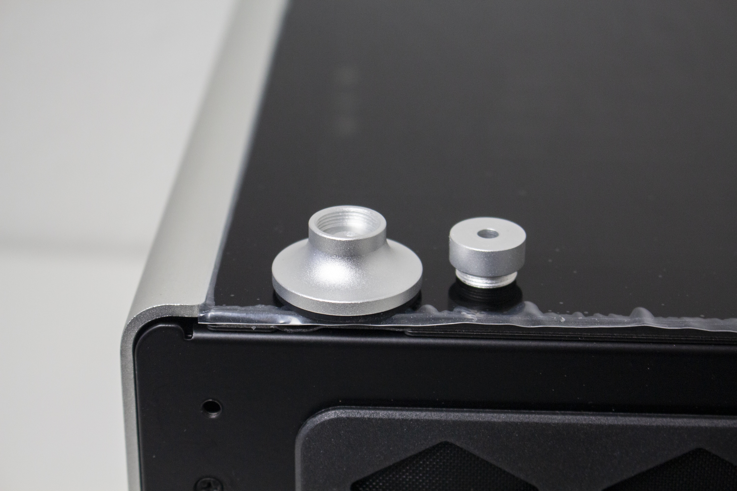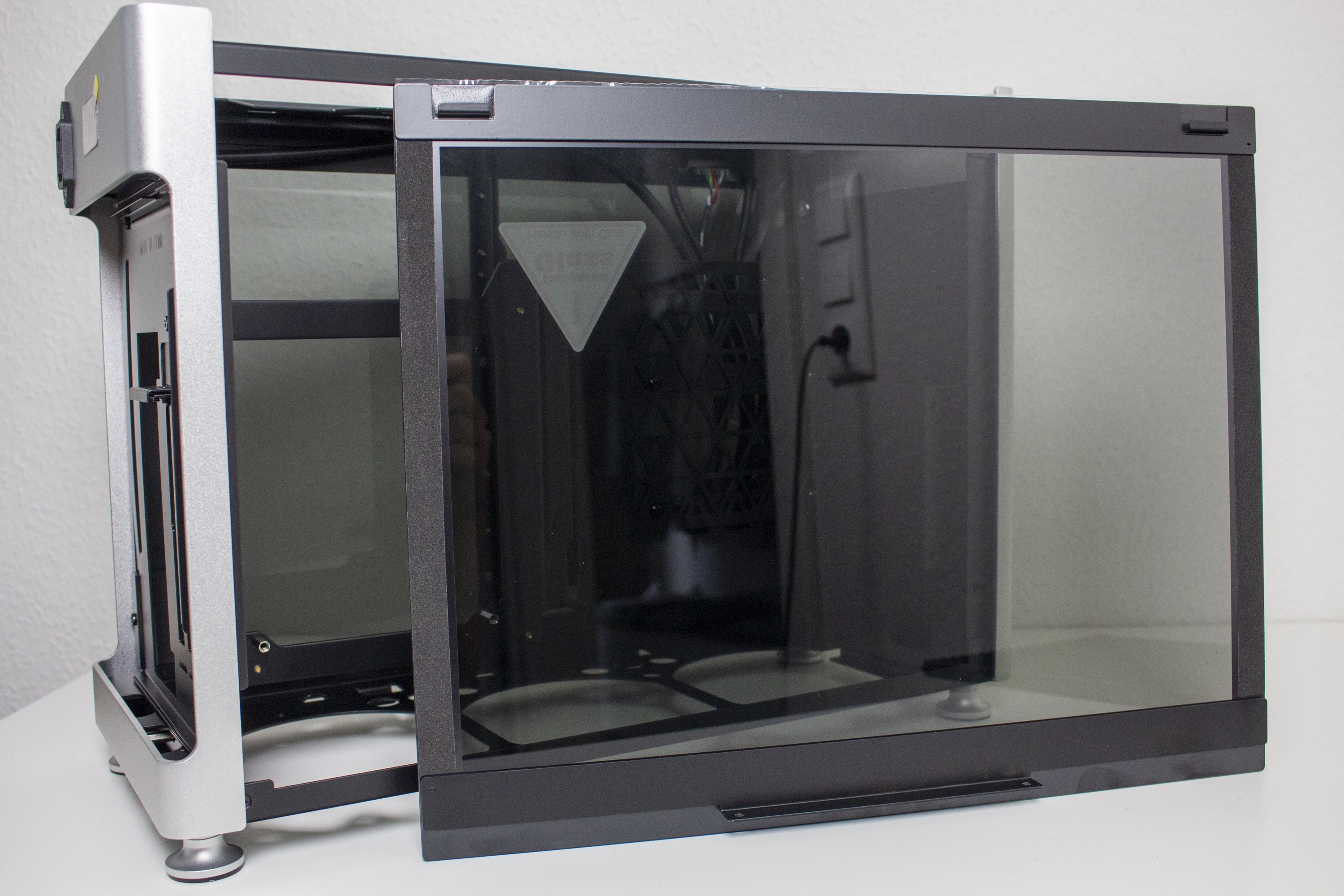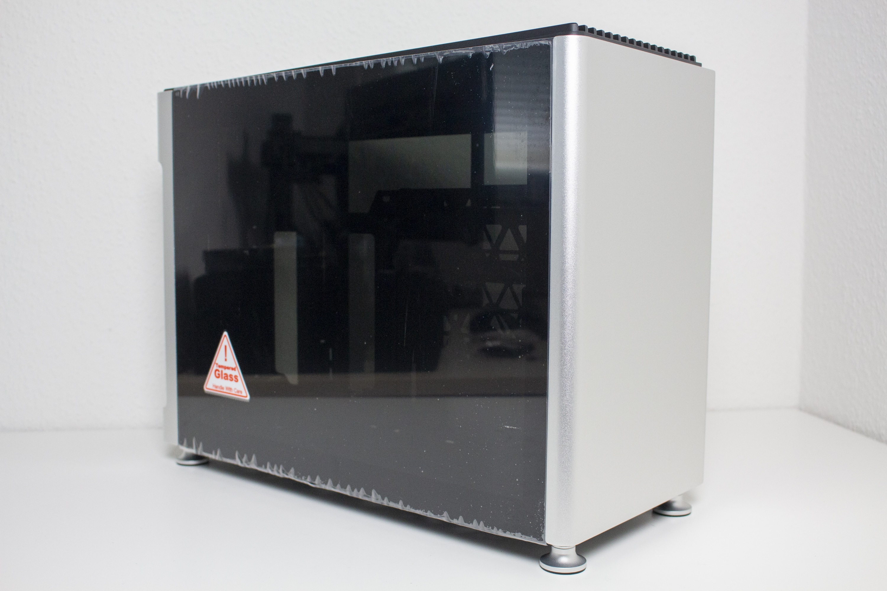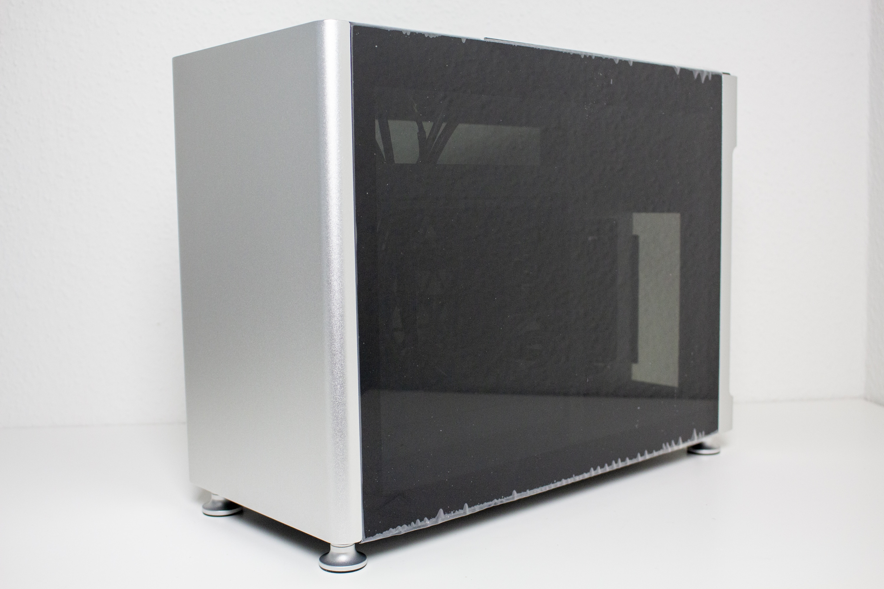 Je nach Modell bestehen die Sidepanels entweder auf Aluminium oder, wie in unserem Fall, aus einem verdunkelten Tempered Glass. Die Befestigung am Korpus erfolgt pro Panel über zwei kleine Schrauben im oberen Bereich. Diese kann man erst entfernen, wenn auch der Gehäusedeckel abgenommen wurde. Danach lassen sich die Seitenteile nach oben hin abziehen. Um die Übertragung von Vibrationen zu verhindern, hat Jonsplus die Seitenteile zusätzlich mit dünnen Gummistreifen beklebt.