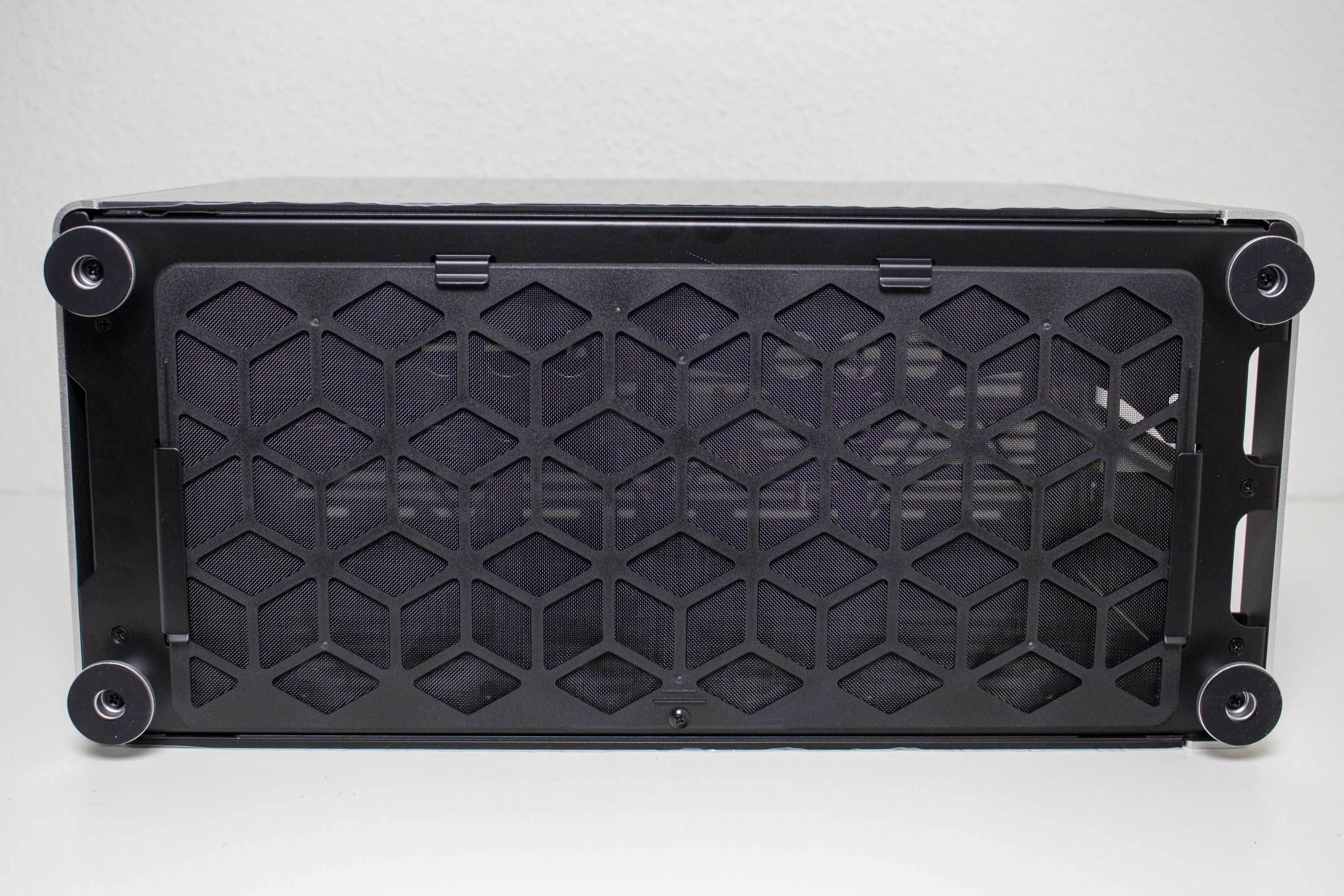 Ab Werk kommt das i100 Pro ohne Standfüße. Diese liegen im Zubehörpaket und müssen nachträglich mit Schrauben angebracht werden. Hier überlässt der Hersteller dem Käufer die Wahl, wie hoch diese sein dürfen und liefert Material für zwei verschiedene Höhen mit. Ansonsten verfügt die Unterseite über ein großes Belüftungsgitter, vor dem ein feiner Staubfilter platziert wurde. Um diesen seitlich ausbauen zu können, muss vorher erst eine Schraube gelöst werden.