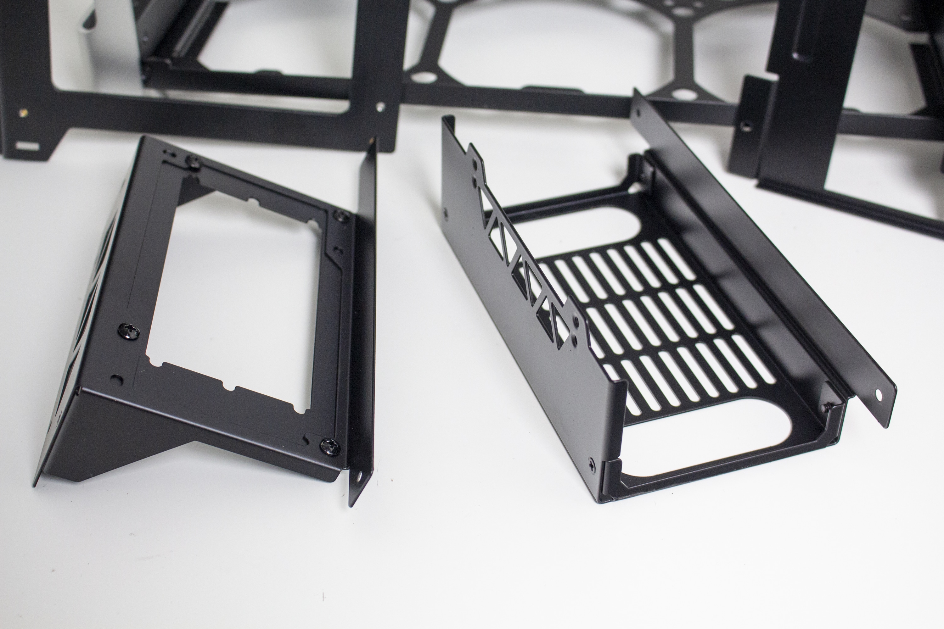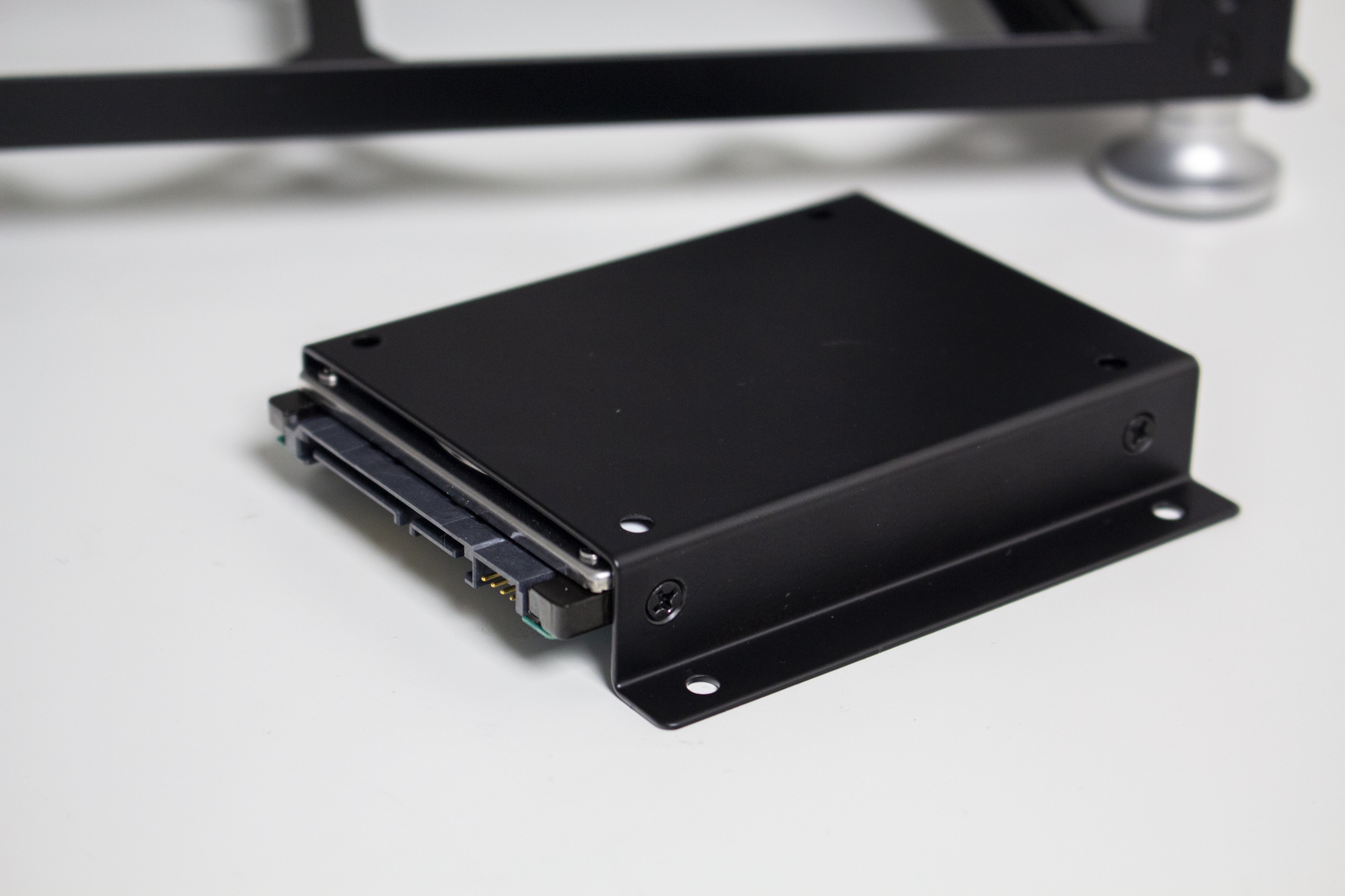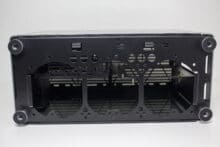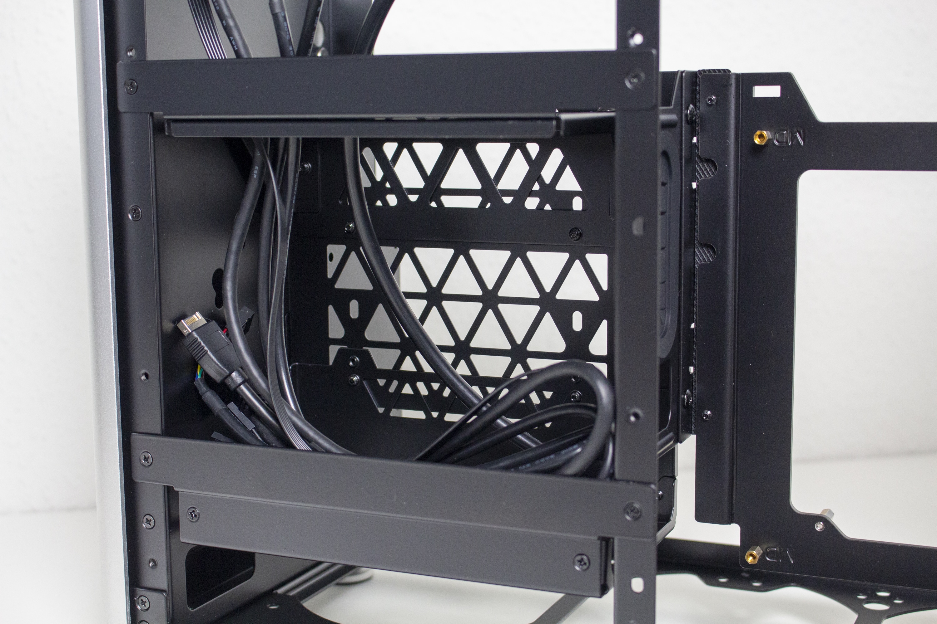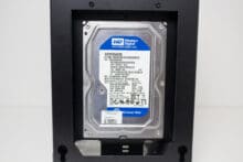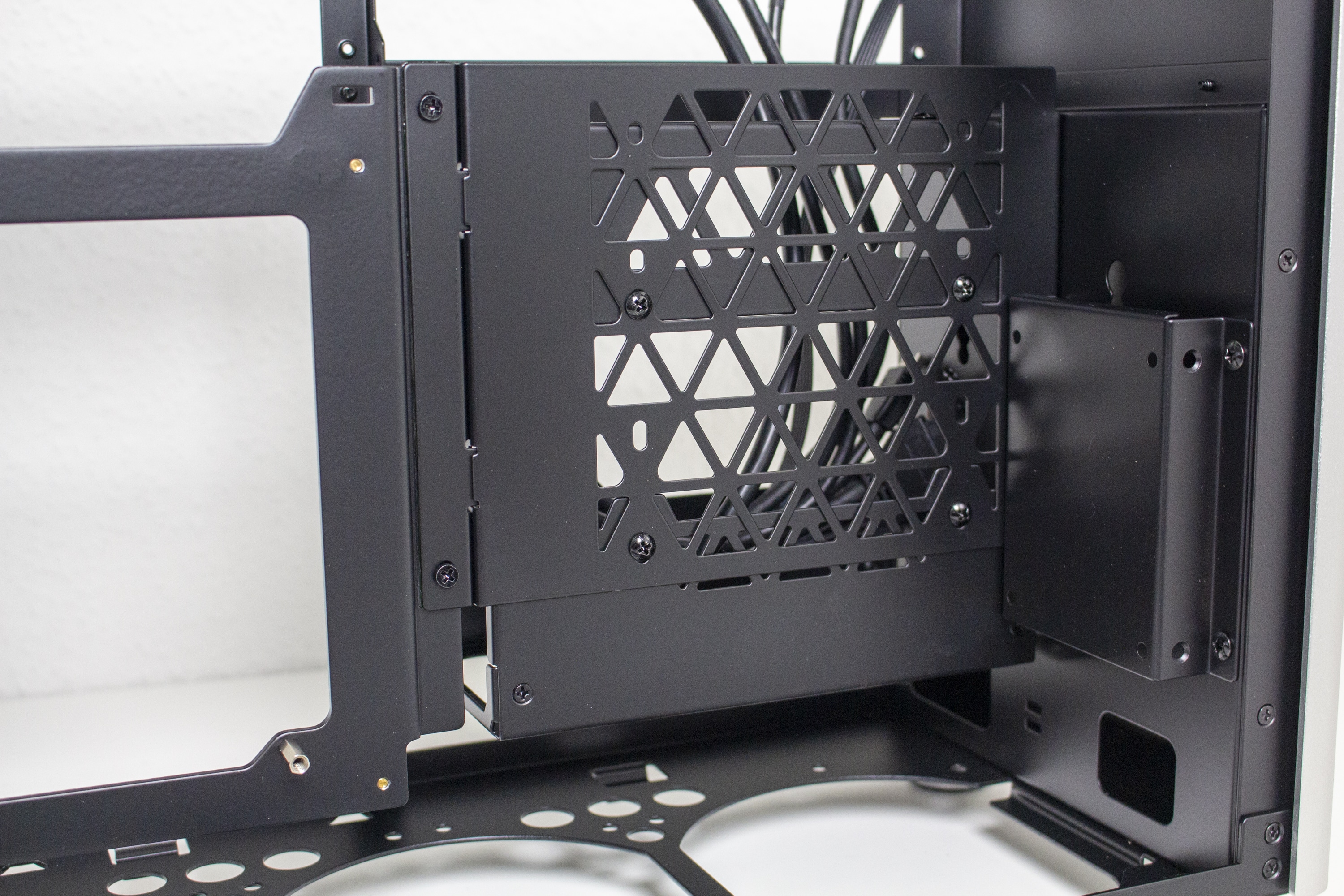 Für Datenträger gibt es innerhalb des Jonsplus i100 Pro insgesamt drei Montageplätze. Eine 3,5″- oder 2,5″-HDD lässt sich hinter dem Frontpanel platzieren. Die Montage erfolgt über vier spezielle Schrauben und Gummiringe, die dann in die dafür vorgesehenen Montagepunkte geschoben werden müssen. Zwei weitere 2,5″-SSDs können im Innenraum in einem Käfig untergebracht werden. Der Käfig ist mit zwei Schrauben befestigt und auch die Montage der 2,5″-SSD erfordert den Einsatz eines Schraubendrehers.