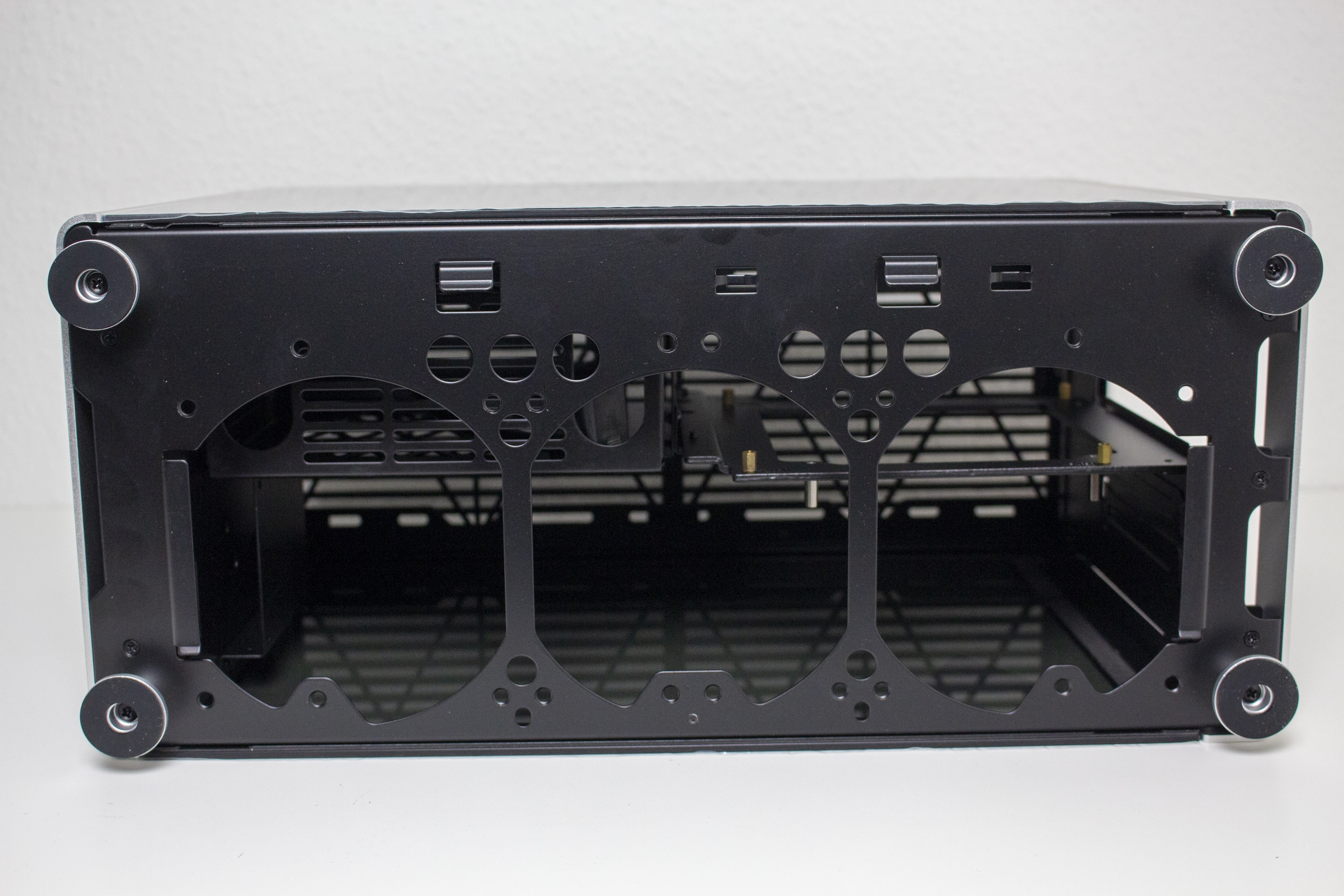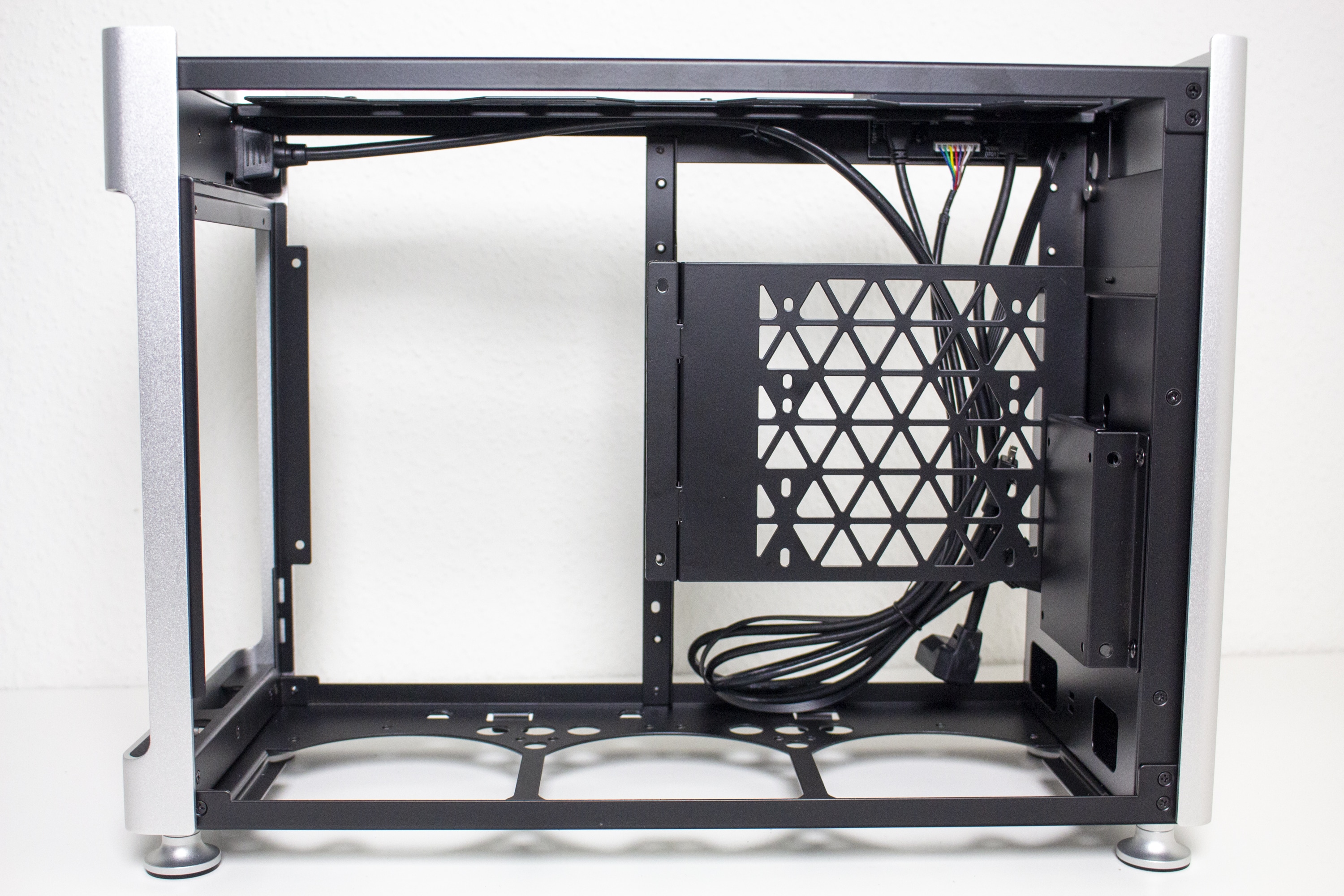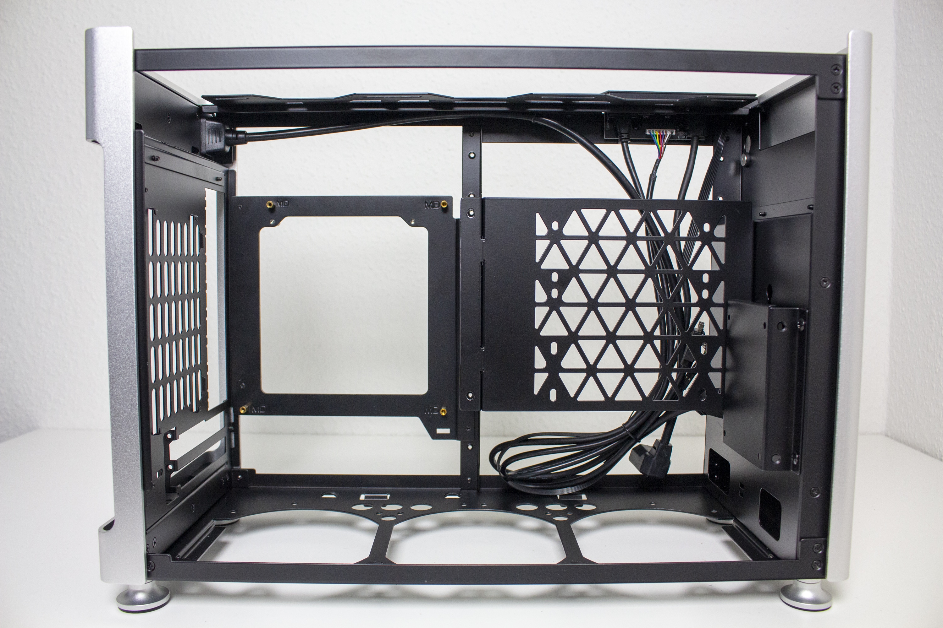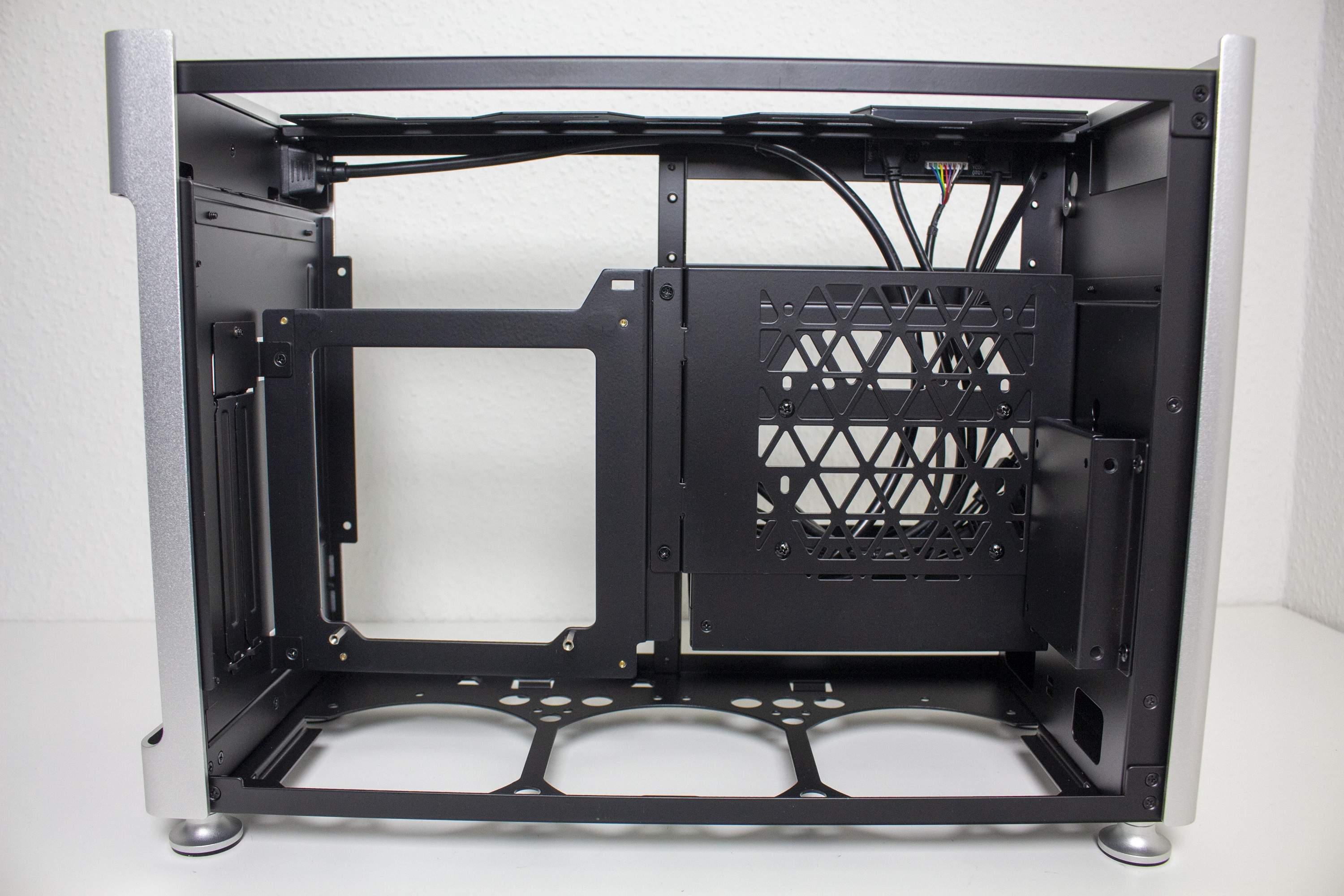 Der Innenraum des Jonsplus i100 Pro ist insgesamt sehr flexibel gestaltet und Bedarf einer genaueren Betrachtung. Der Korpus des SFF-Gehäuses besteht vollständig aus einem schwarz lackiertem Stahl und kann eine solide Stabilität vorweisen. Ab Werk wird das i100 Pro mit einem Sandwich-Layout ausgeliefert. Durch das Mainboard-Tray wird der Innenraum also in zwei Kammern unterteilt. In der linken Kammer wird die Grafikkarte untergebracht und die rechte Kammer bietet Platz für ein ITX-Mainboard sowie das Netzteil. Zur Montage des Netzteil müssen vorher zwei Rahmen vom Mainboard-Tray entfernt werden.