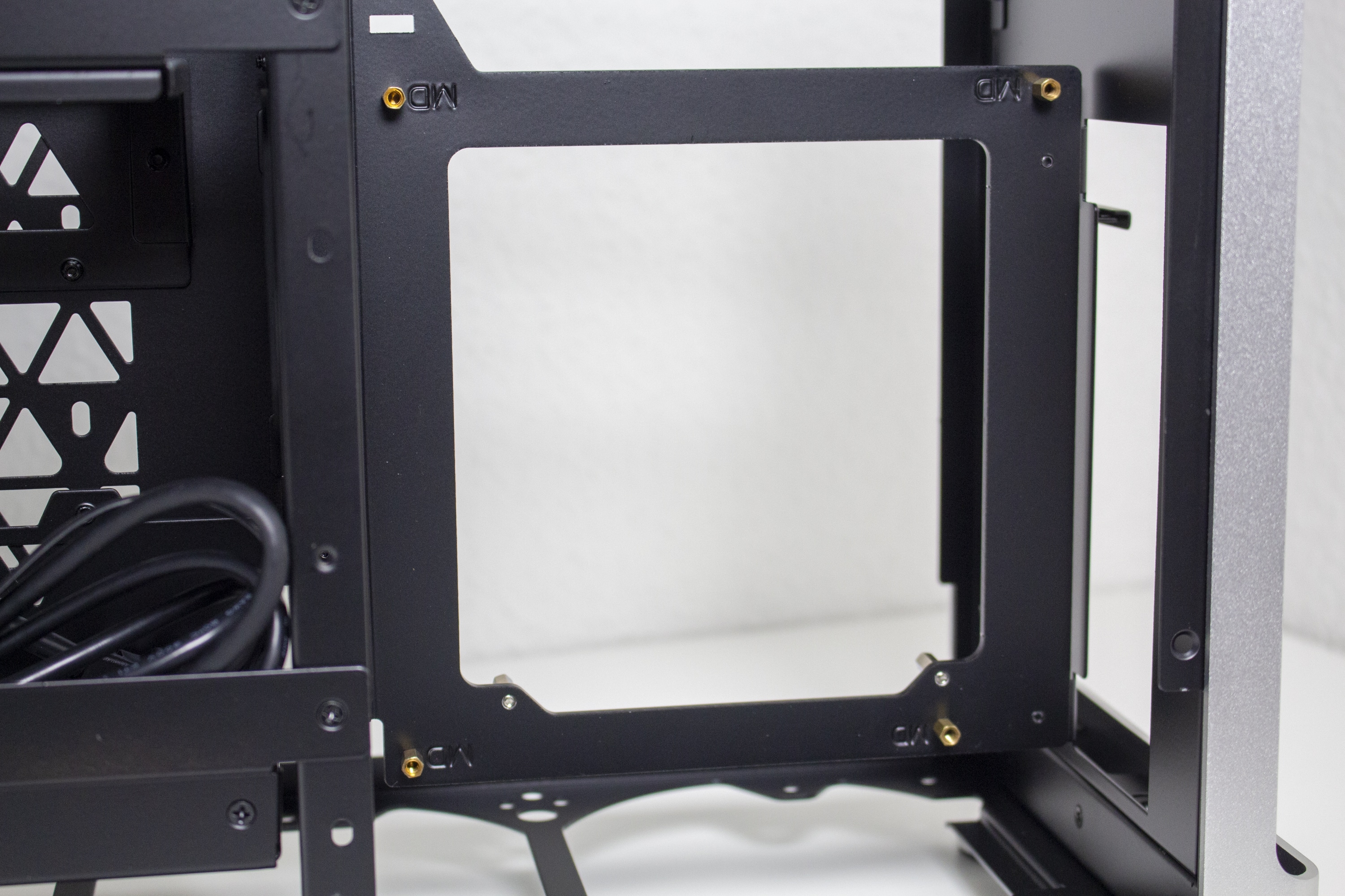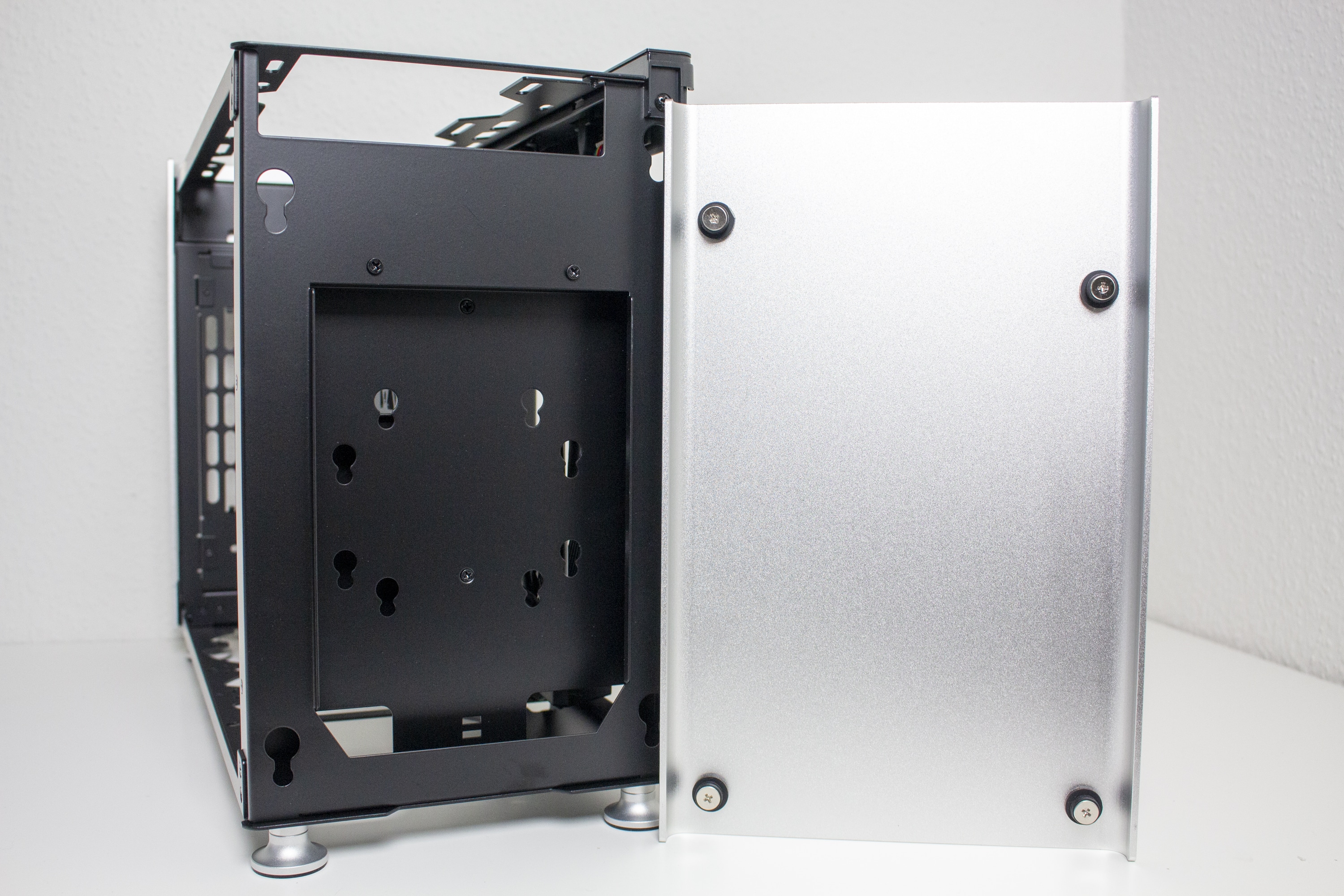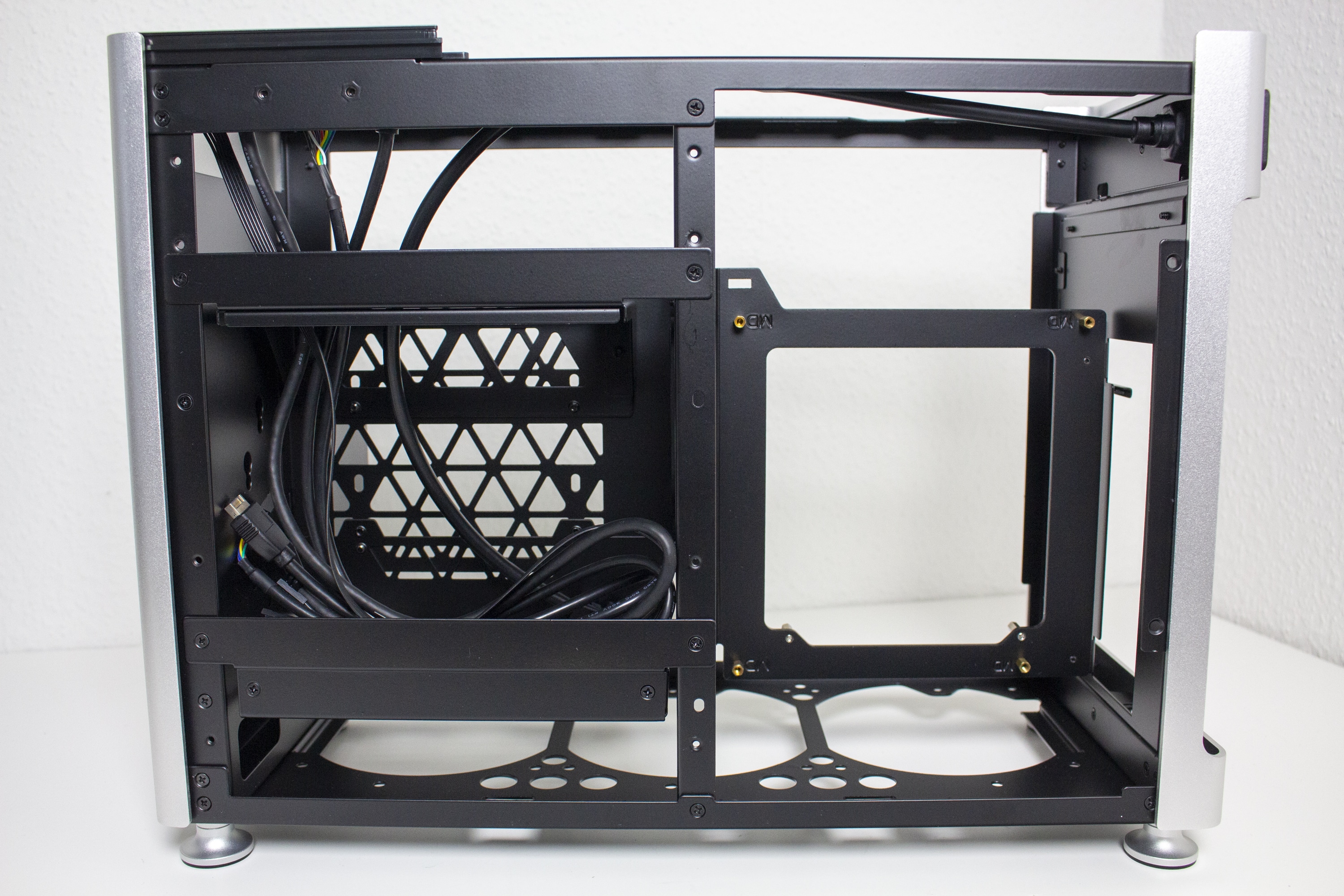 Der Innenraum des Jonsplus i100 Pro ist insgesamt sehr flexibel gestaltet und Bedarf einer genaueren Betrachtung. Der Korpus des SFF-Gehäuses besteht vollständig aus einem schwarz lackiertem Stahl und kann eine solide Stabilität vorweisen. Ab Werk wird das i100 Pro mit einem Sandwich-Layout ausgeliefert. Durch das Mainboard-Tray wird der Innenraum also in zwei Kammern unterteilt. In der linken Kammer wird die Grafikkarte untergebracht und die rechte Kammer bietet Platz für ein ITX-Mainboard sowie das Netzteil. Zur Montage des Netzteil müssen vorher zwei Rahmen vom Mainboard-Tray entfernt werden.