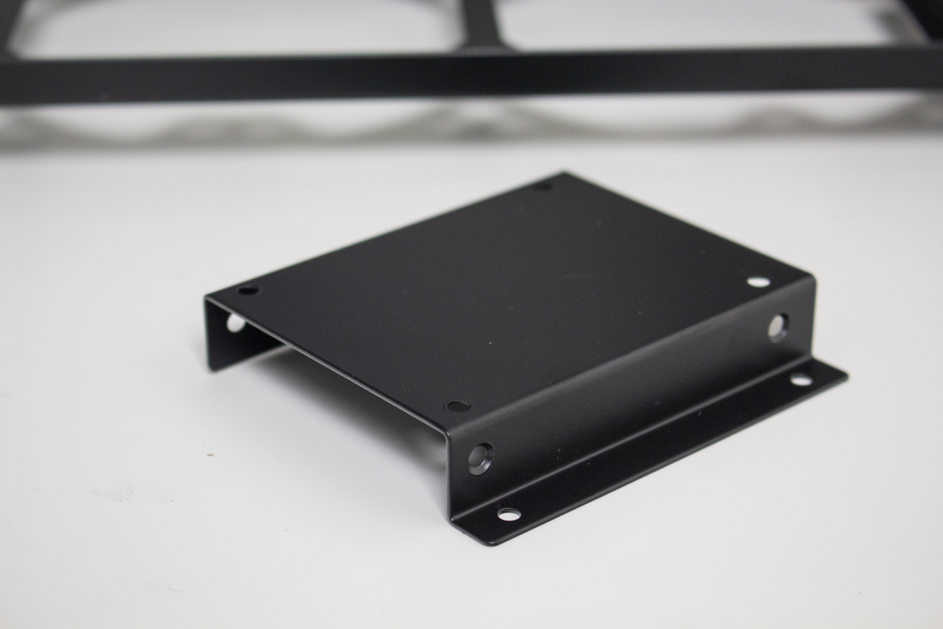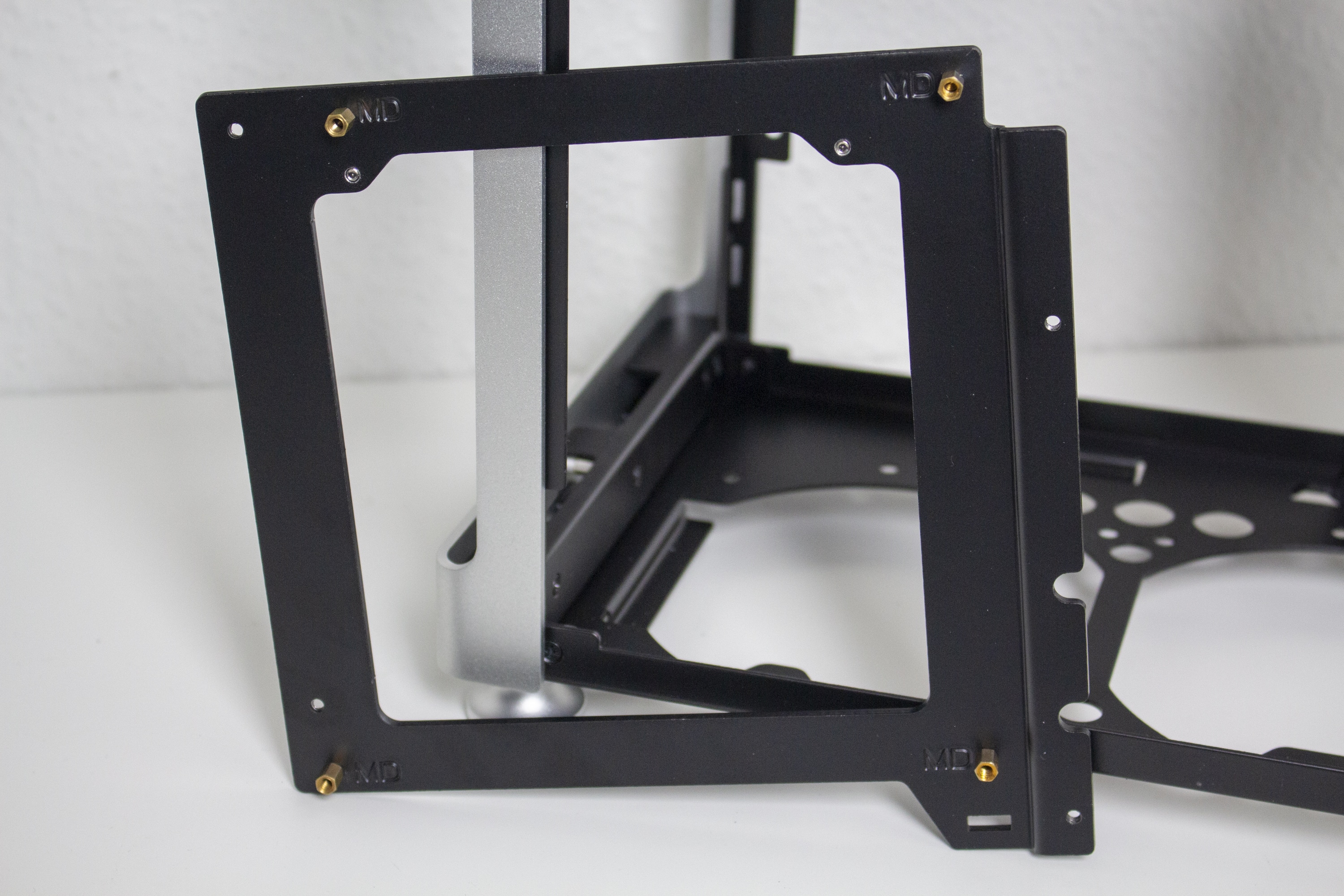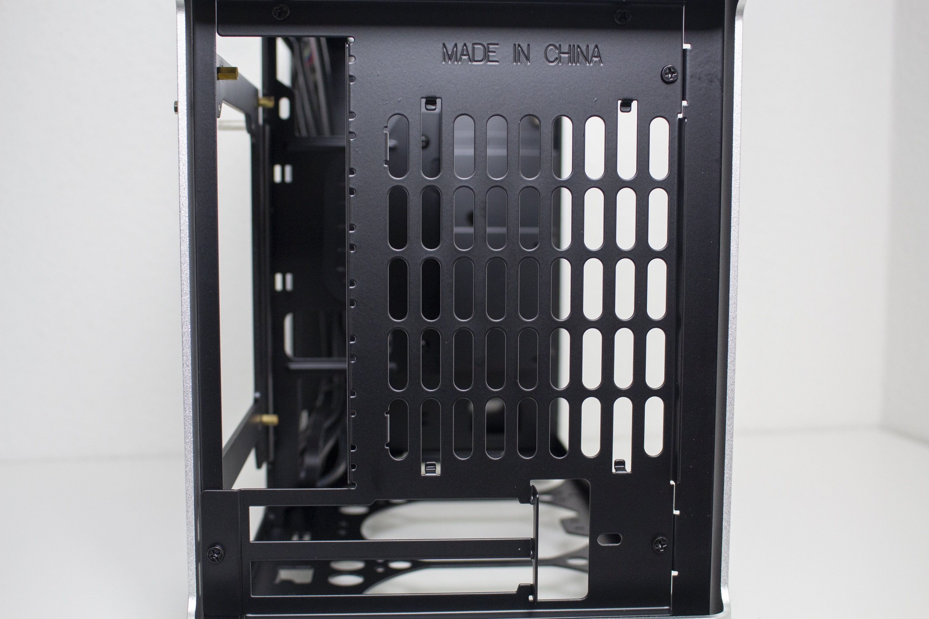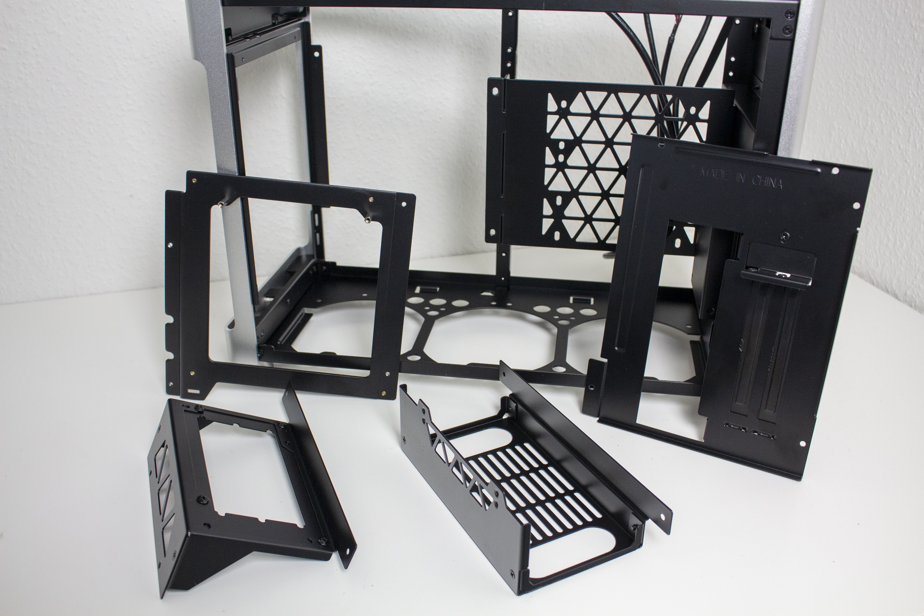 Der Innenraum des Jonsplus i100 Pro ist insgesamt sehr flexibel gestaltet und Bedarf einer genaueren Betrachtung. Der Korpus des SFF-Gehäuses besteht vollständig aus einem schwarz lackiertem Stahl und kann eine solide Stabilität vorweisen. Ab Werk wird das i100 Pro mit einem Sandwich-Layout ausgeliefert. Durch das Mainboard-Tray wird der Innenraum also in zwei Kammern unterteilt. In der linken Kammer wird die Grafikkarte untergebracht und die rechte Kammer bietet Platz für ein ITX-Mainboard sowie das Netzteil. Zur Montage des Netzteil müssen vorher zwei Rahmen vom Mainboard-Tray entfernt werden.