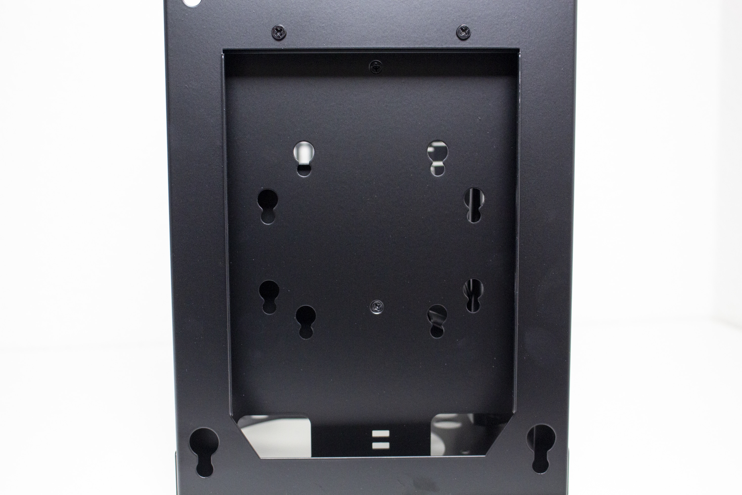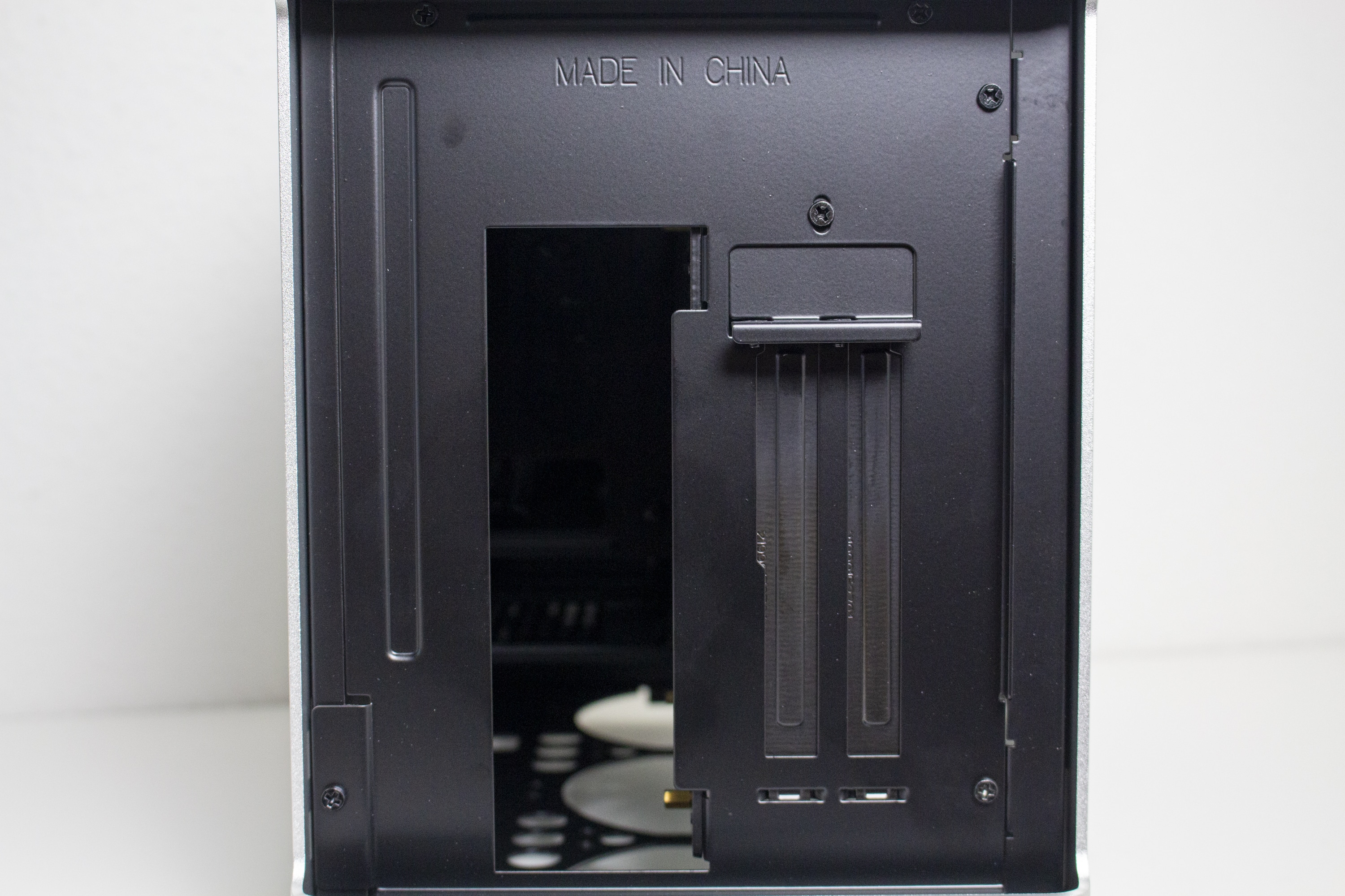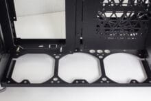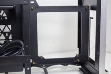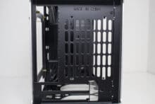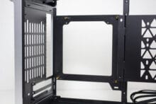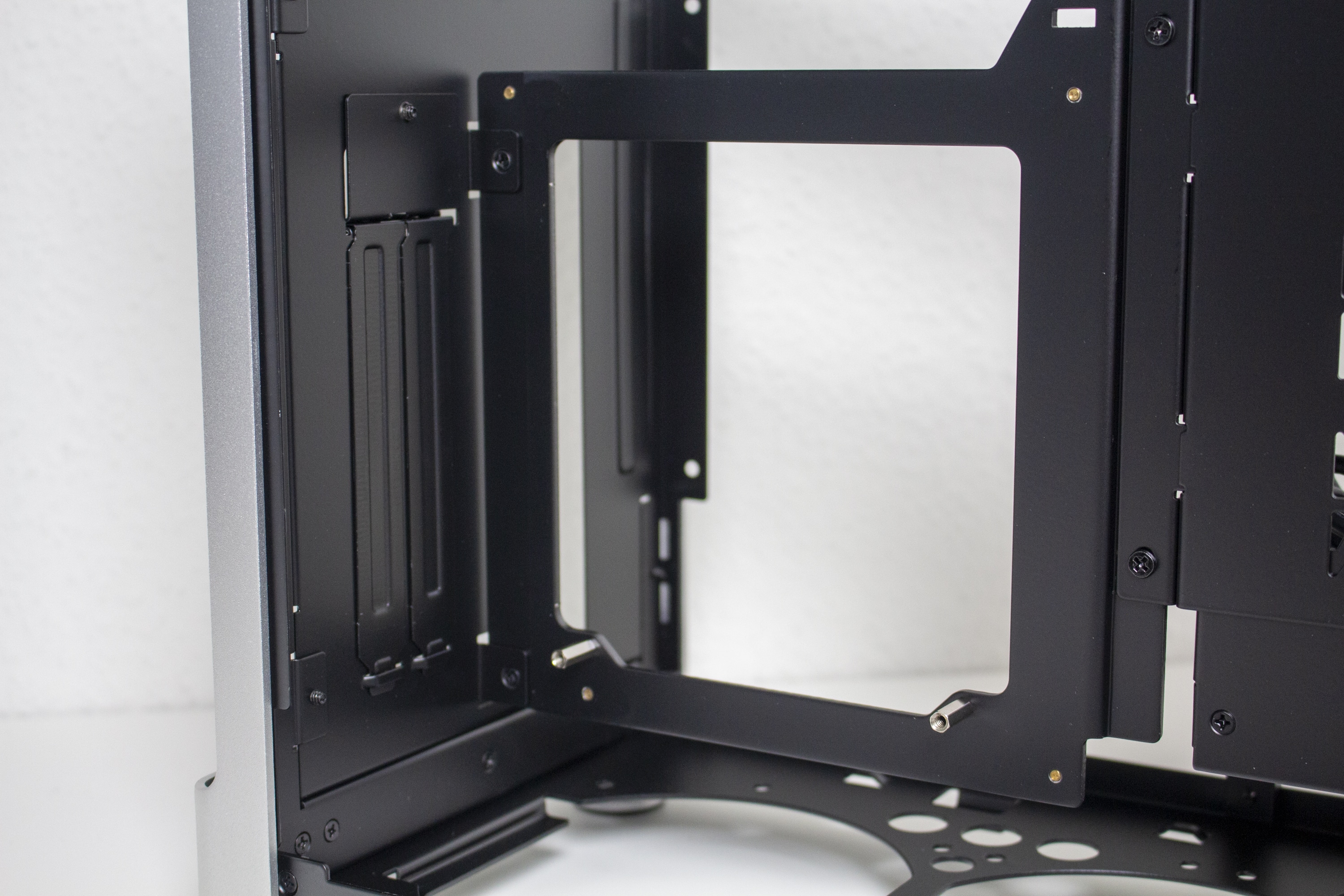 Der Einsatz von Aluminium wird, wenn auch nur in reduzierter Form, ebenfalls an der Rückseite fortgeführt. So gibt es hier ebenfalls ein, an den Ecken abgerundetes, Aluminiumpanel, welches aber mittig ausgeschnitten wurde. Im oberen Bereich findet sich der Stecker für das Netzkabel und mittig dann die Rückseite des Mainboard-Trays bzw. die PCI-Slotblenden. Das schwarz gehaltene Panel besteht aus Stahl und präsentiert sich ab Werk in einem Sandwich-Layout. Schaut man etwas genauer hin, kann man entdecken, dass das Panel mit Schrauben befestigt ist und vollständig entfernt werden kann. Damit ändert sich das komplette Layout im Inneren. Als Käufer hat man die Wahl zwischen dem Sandwich- und einem „normalen“ ATX-Layout mit der Grafikkarten im Boden.