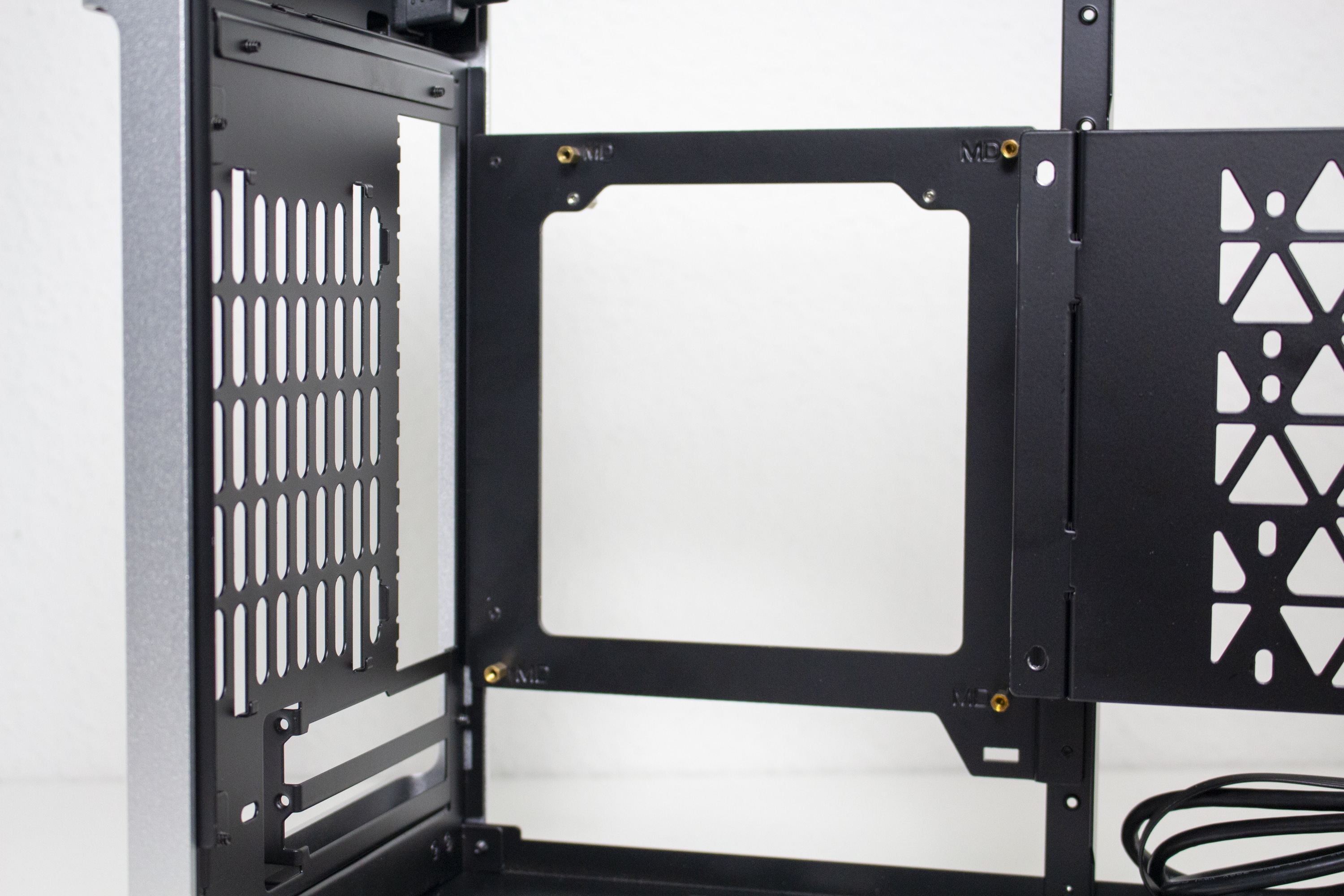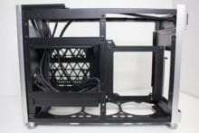 Mit Hilfe von zehn Schrauben lassen sich, bei Bedarf, das Mainboard-Tray und das Backpanel des i100 Pro entfernen bzw. versetzen. Dadurch wird aus dem Sandwich-Layout eine Art ATX-Layout mit GPU im Boden und mehr Platz für CPU-Kühler. An der Position des Netzteilkäfigs ändert sich grundsätzlich nichts. Analog zu den Montagemöglichkeiten für Lüfter im Deckel, können auch im Boden bis zu drei 120-Millimeter-Lüfter befestigt werden. Verbaute Lüfter schränken jedoch die Tiefe der Grafikkarte sowie die maximale Länge des Netzteils ein.