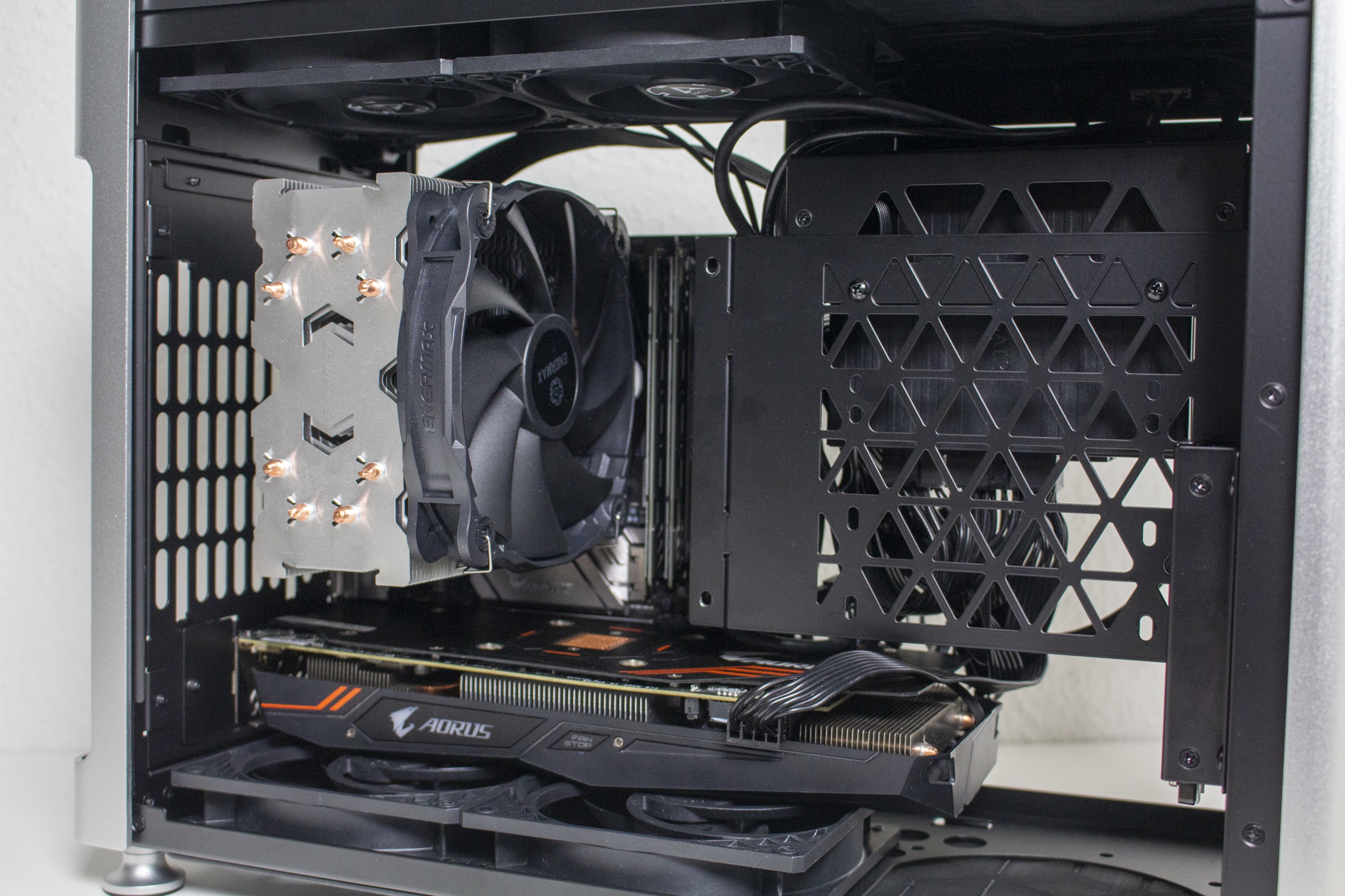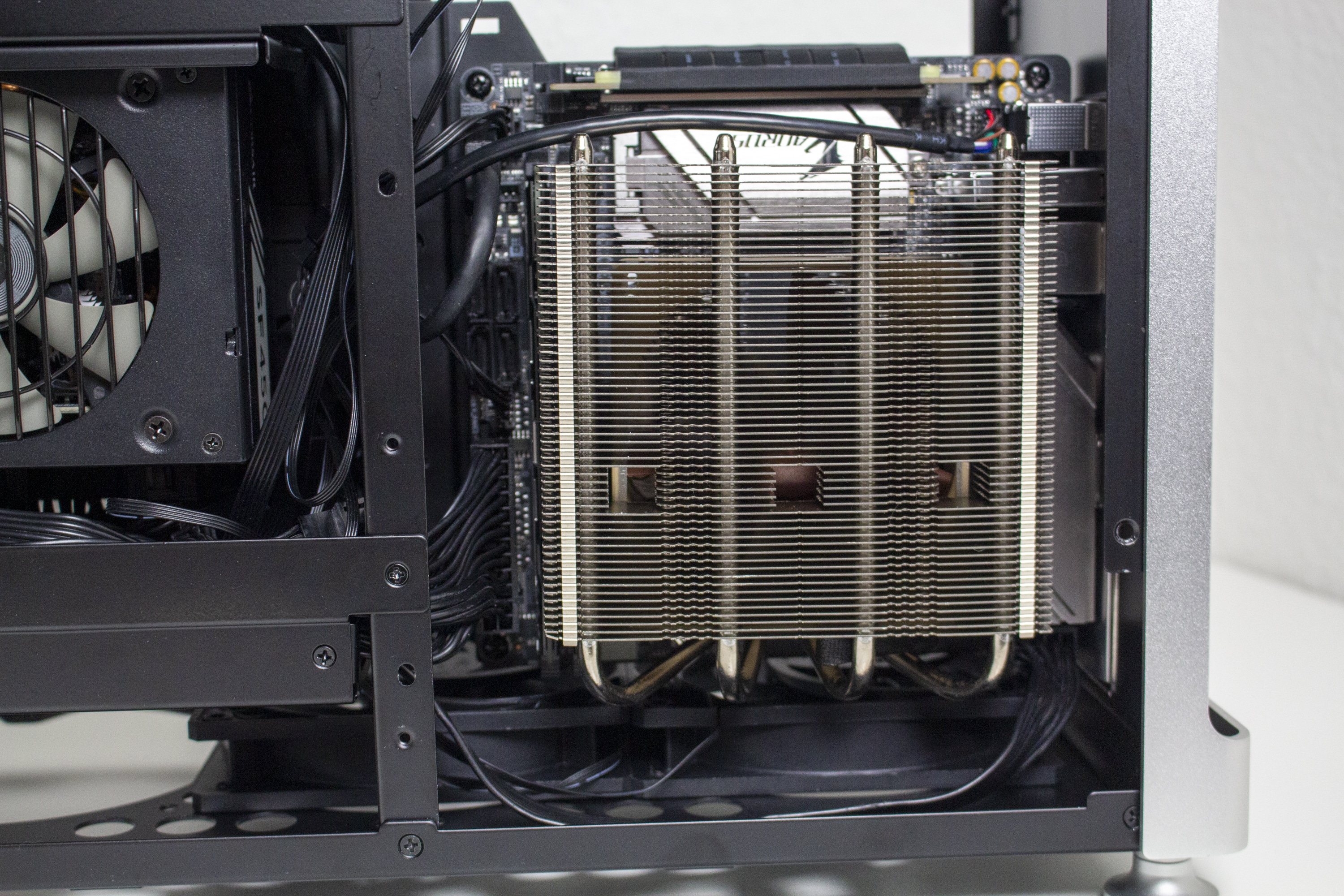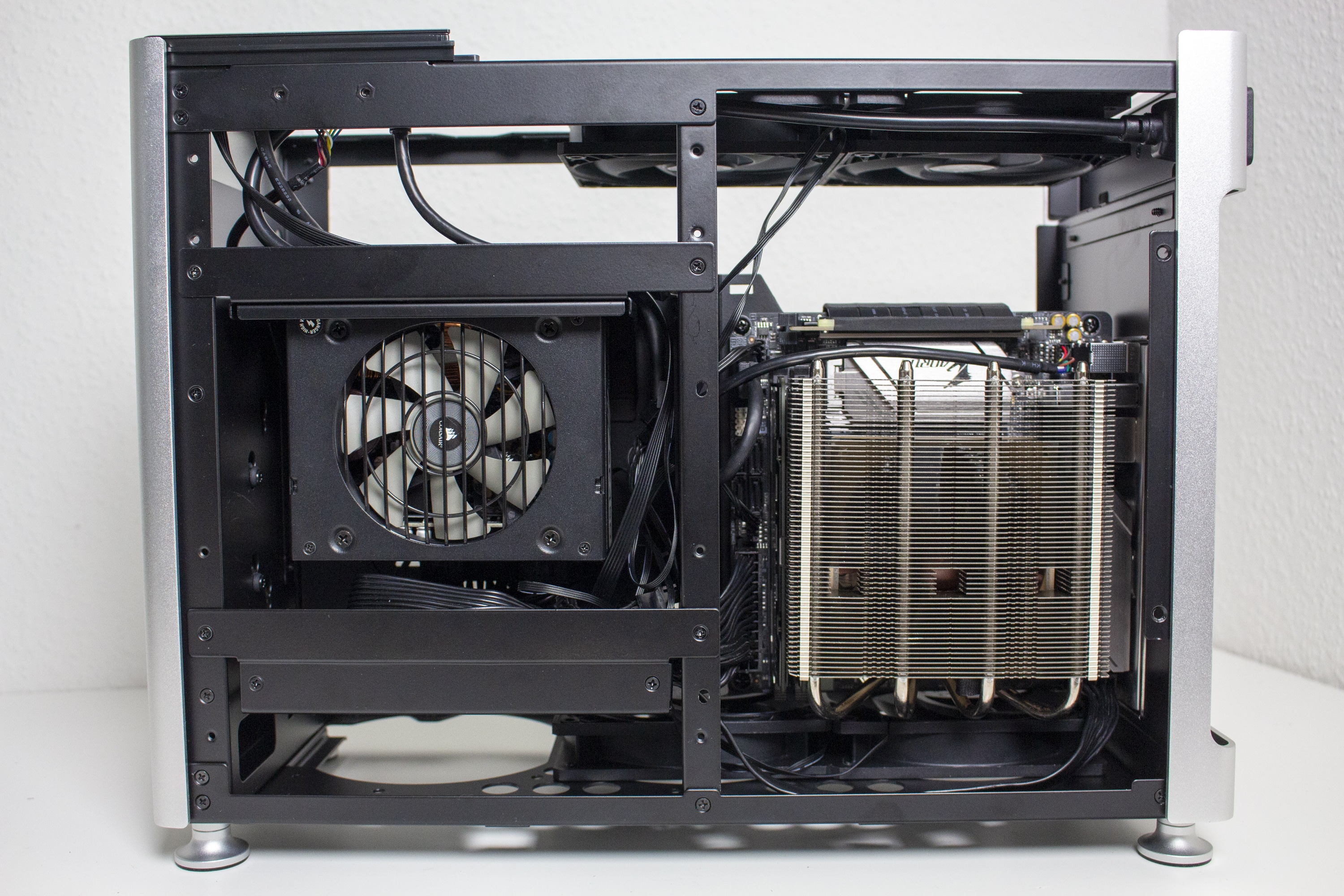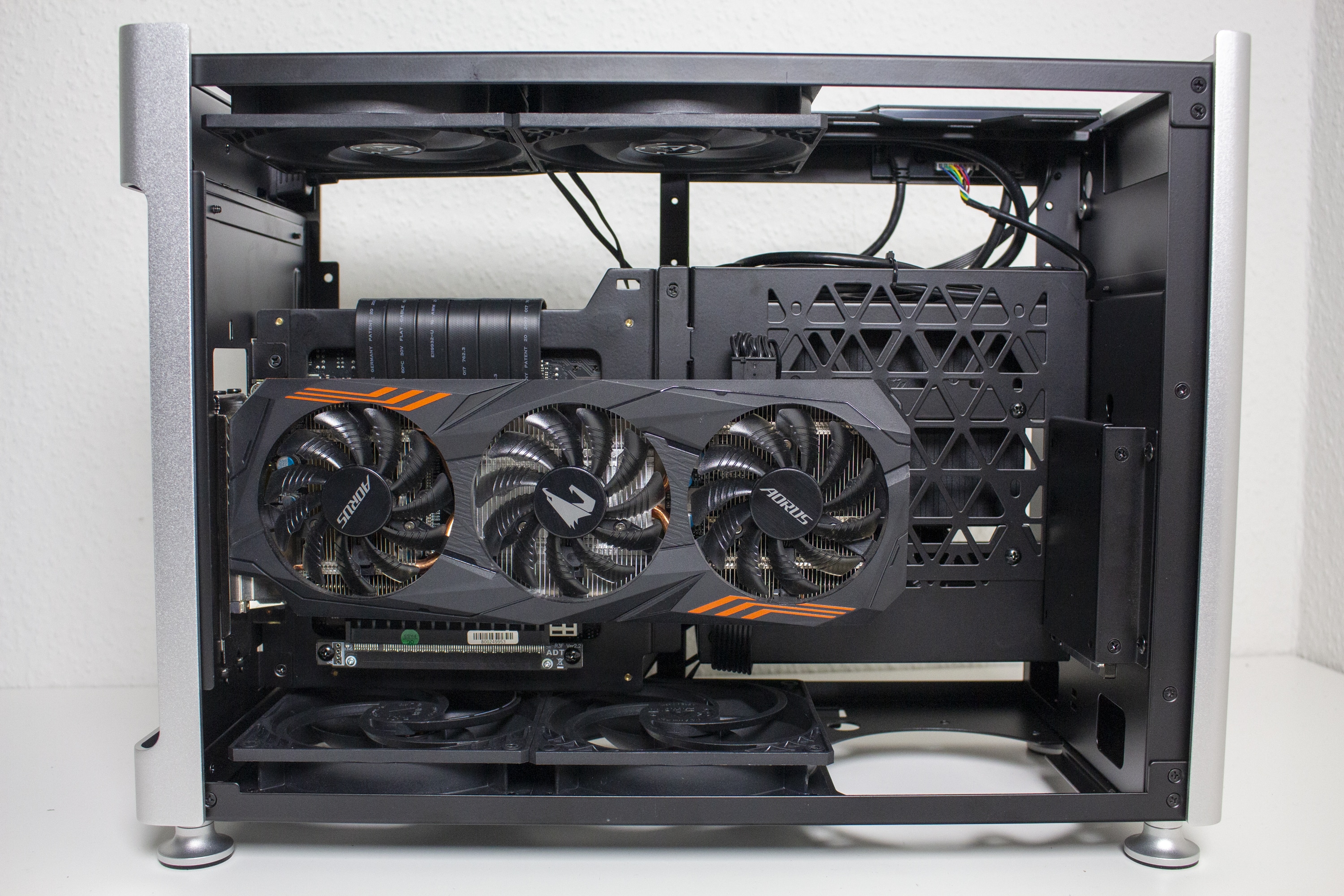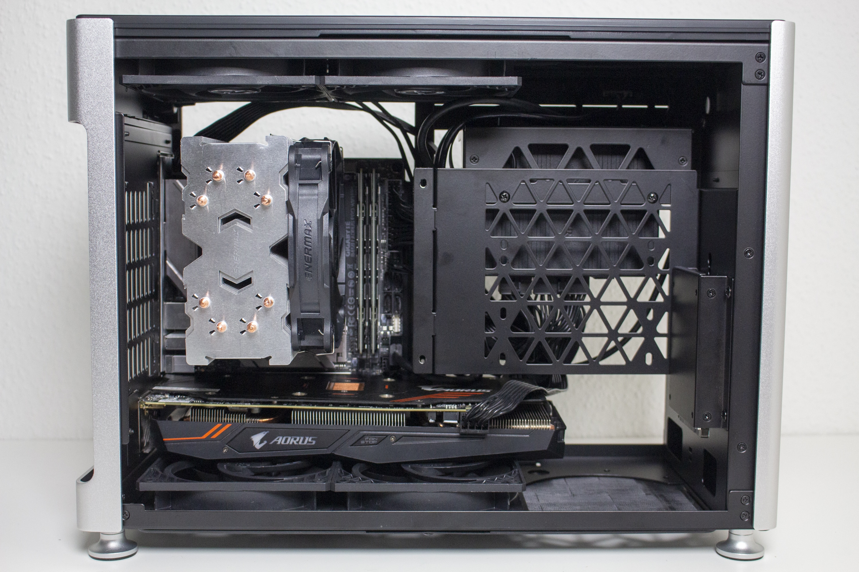 Nun kommen wir zum Systemeinbau. Als Hardware verwenden wir einen AMD Ryzen 7 3700X* auf einem Gigabyte B450I AORUS WIFI mit 32GB Crucial Ballistix Sport. Der Ryzen wird von einem Noctua NH-L12 S1 Ghost* gekühlt und ist nicht übertaktet. Für die Bildausgabe ist eine GTX 1060 6GB von Gigabyte AORUS zuständig. Die Stromversorgung erledigt das vollmodulare Corsair SF450 Gold mit einem Effizienzgrad von 80 Plus Gold.