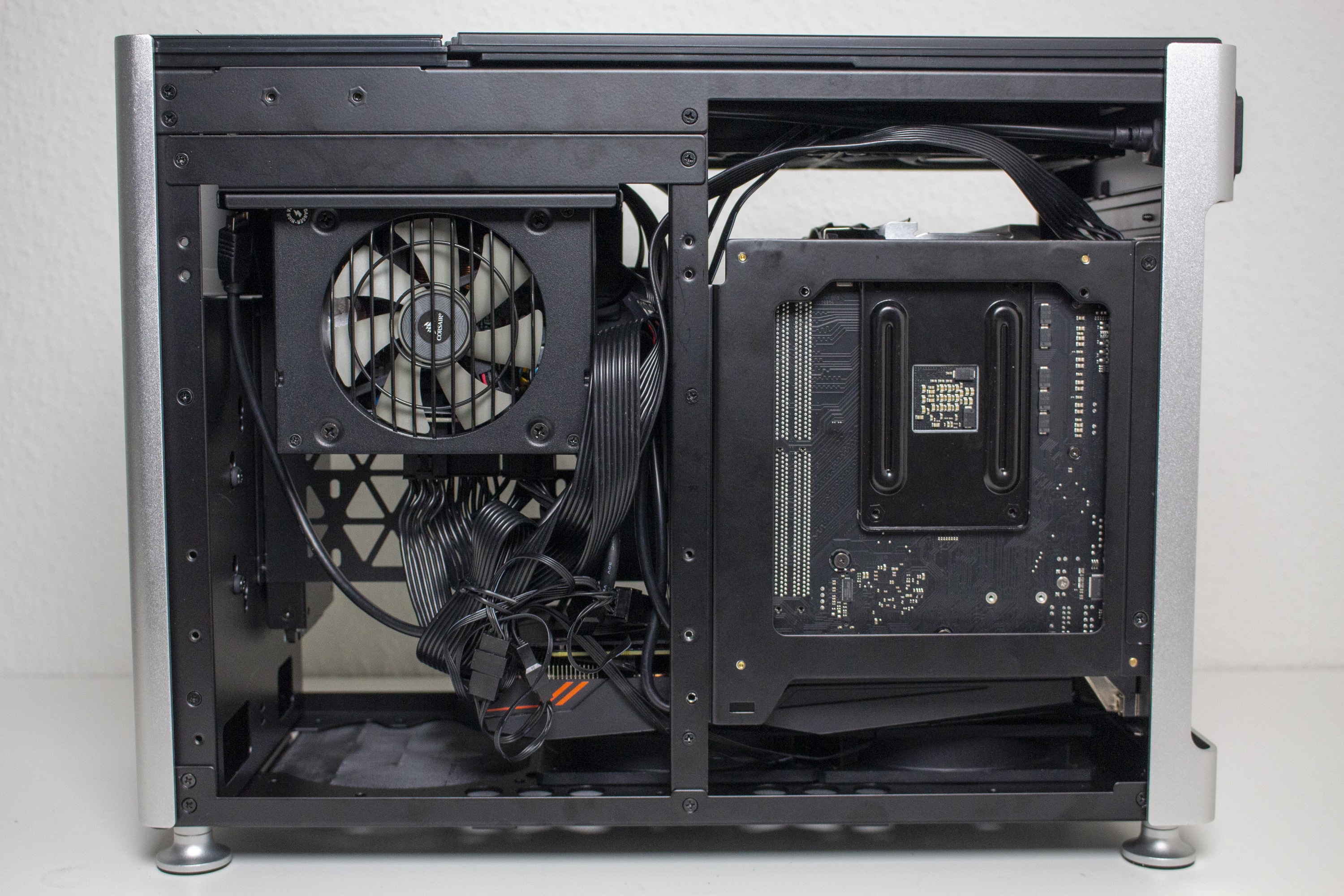 Natürlich haben wir auch einmal das zweite Layout getestet bzw. dort das Testsystem eingebaut. Auch bei der Verwendung des ATX-Layouts sind uns keine Designfehler aufgefallen. Je nach Grafikkartenlänge ist es aber wichtig, dass der Netzteilkäfig nach oben gesetzt wird. Ansonsten kollidiert die Grafikkarte mit der Kabelmanagementabdeckung. Das ATX-Layout erlaubt CPU-Kühler mit einer Höhe von maximal 166 und Grafikkarten mit einer Länge von höchstens 345 Millimetern, wenn ein HDD-Käfig verbaut ist. Verbaut man eine 2-Slot-GPU, passen in den Boden noch problemlos 25-Millimeter-Lüfter. Im ATX-Layout darf das Netzteil maximal 140 Millimeter lang sein.