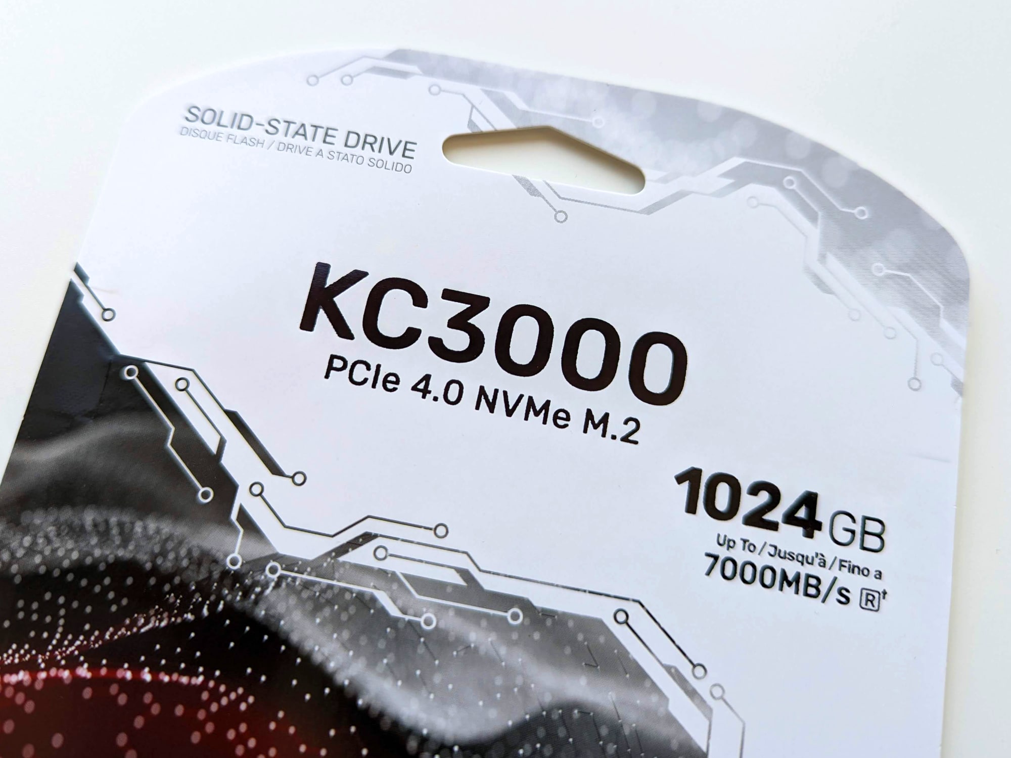 Die Verpackung der M.2-SSD ist sehr kompakt, zur einen Hälfte weiß, zur anderen schwarz und rot. Sie lässt den direkten Blick auf die SSD zu. Auf der Vorderseite finden wir neben der Bezeichnung Informationen zu Kapazität, maximaler Übertragungsrate und Dauer der Garantie.