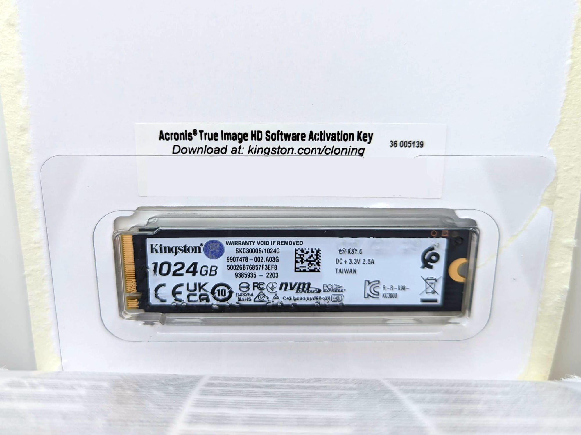 Weiterhin befindet sich ein Key für Acronis True Image HD im Lieferumfang. Mit Hilfe dieser Software können unter anderem Laufwerke oder Partitionen gesichert, oder auch die Daten von der alten auf die neue SSD geklont werden. Der Key befindet sich direkt oberhalb der M.2-SSD auf der Innenseite der Verpackung, wodurch er leider schnell übersehen werden kann.
