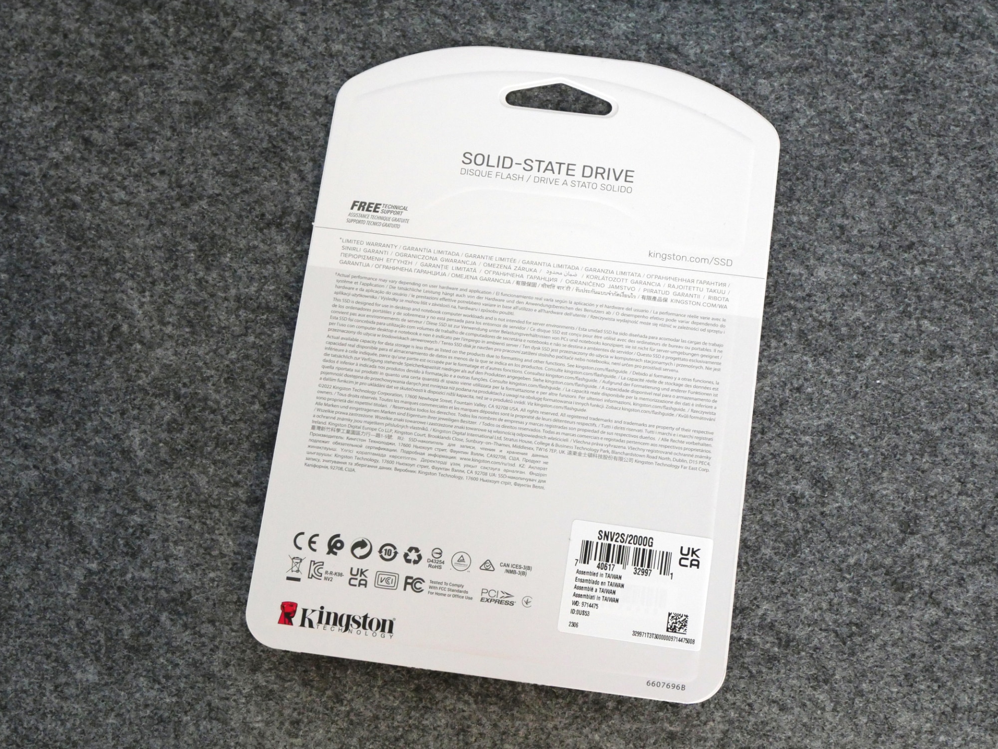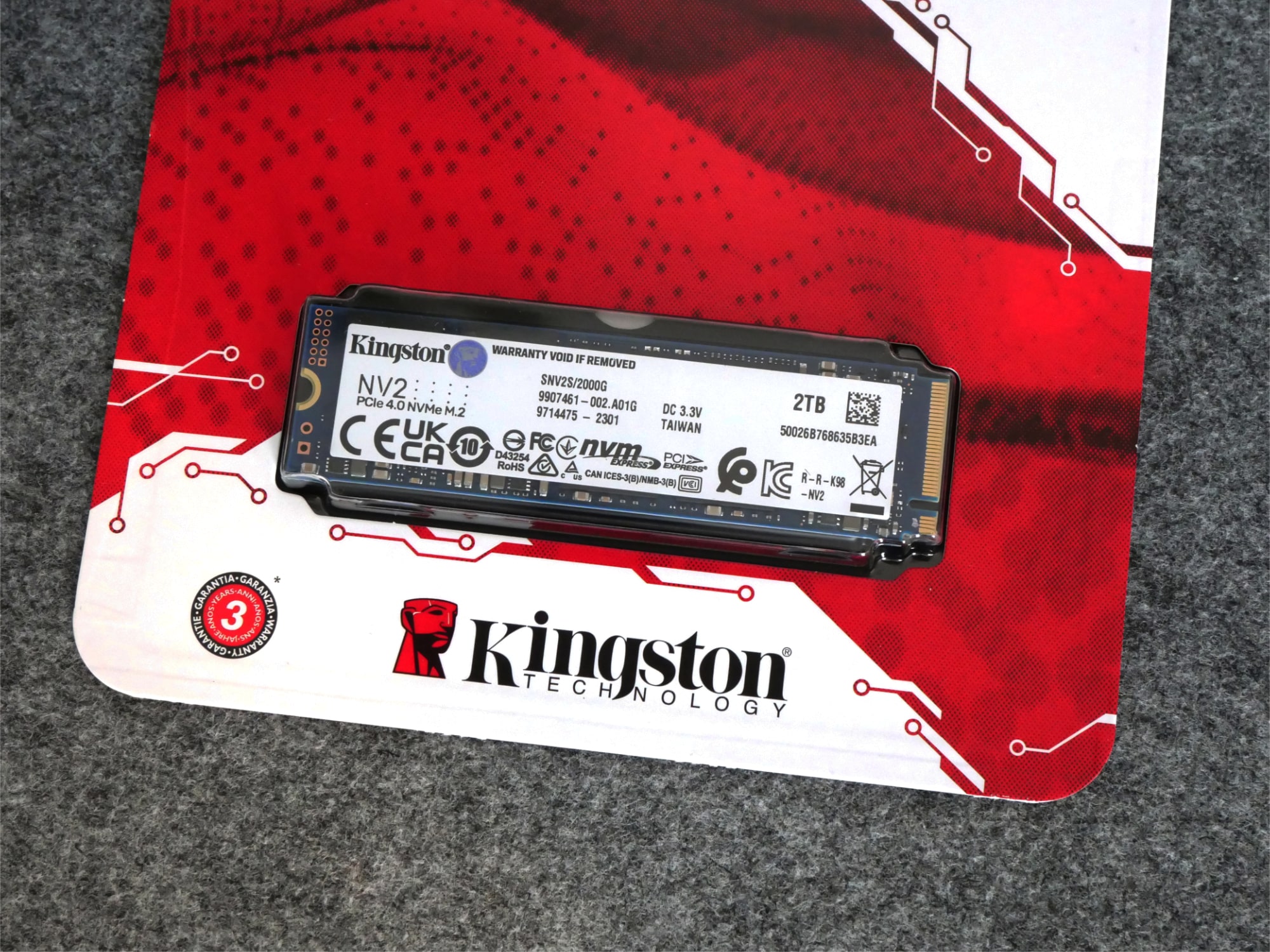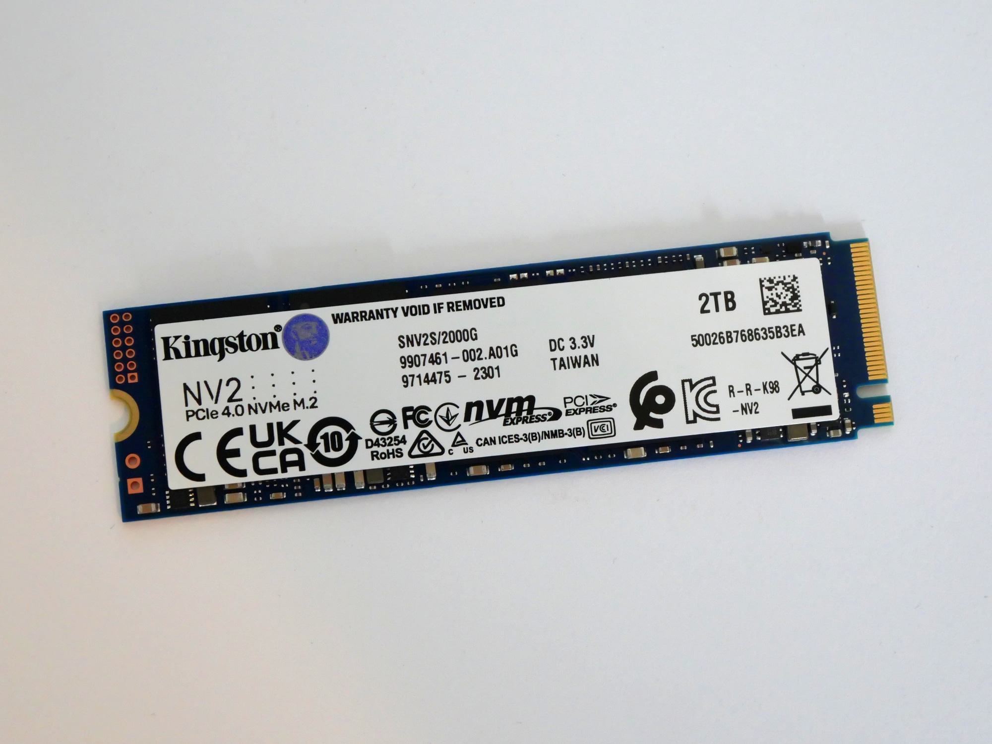 Kingston setzt bei der NV2 nicht auf bestimmte Komponenten. Je nach Verfügbarkeit und Preis können der verbaute Controller oder auch der Speicher variieren, jedoch werden die angegebenen sequenziellen Übertragungsraten garantiert. In unserem Fall handelt es sich beim verbauten Controller um den Phison PS5021-E21T und beim Speicher um Kioxia BiCS5 (TLC NAND), es sind jedoch auch SSDs mit Controllern von Silicon Motion (SM2267XT) und/oder Speicher von Intel (QLC NAND) im Umlauf. Einen Überblick zu den sich bisher im Umlauf befindlichen Varianten findet man bspw. in der SSD Datenbank von TechPowerUp. Wie bei günstigen SSDs meist üblich verzichtet Kingston zudem auf einen DRAM-Cache. Alle Varianten der SSD verzichten auf einen Kühlkörper, die Garantiedauer beträgt bei einer Kapazität von 2 TB 3 Jahre bzw. gilt bis zu einer Schreibleistung von 640 TB.