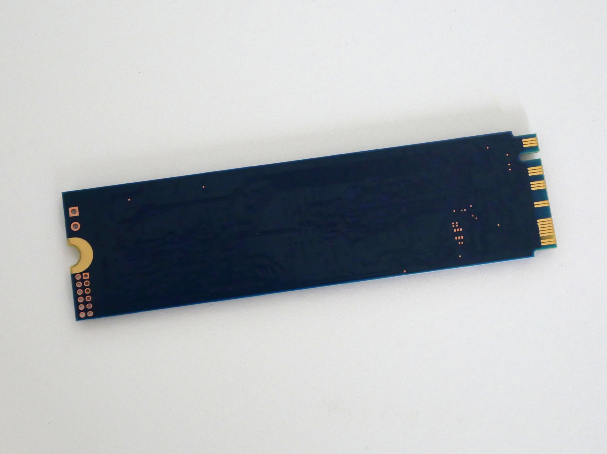 Das PCB der M.2-SSD ist dunkelblau und nur auf der Oberseite mit Komponenten bestückt. Diese werden vollständig von einem weißen Aufkleber mit Informationen und Details zur SSD verdeckt.