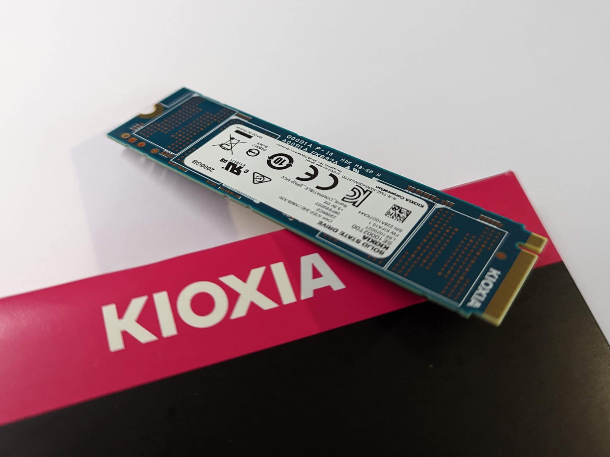 Das PCB ist, wie auch schon bei den PCIe-Gen-3-Modellen, blau. Auf der Oberseite finden wir sowohl den Flash-Speicher als auch den bereits erwähnten Phison-Controller und den 2 GB großen DDR4-Cache von SK Hynix. Die Unterseite ist nicht mit Chips bestückt. Die meisten Bauteile werden durch den schwarzen Kioxia-Aufkleber verdeckt, auf der Unterseite befindet sich ein weißer Aufkleber mit Angaben zu Modell, Kapazität und mehr.