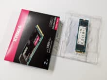 Die SSD kommt in einem schwarzen Karton mit roten Akzenten in der Größe einer 2,5″-SSD. Neben der M.2-SSD selbst ist nur eine Anleitung enthalten. Ein Kühlkörper liegt der SSD nicht bei.