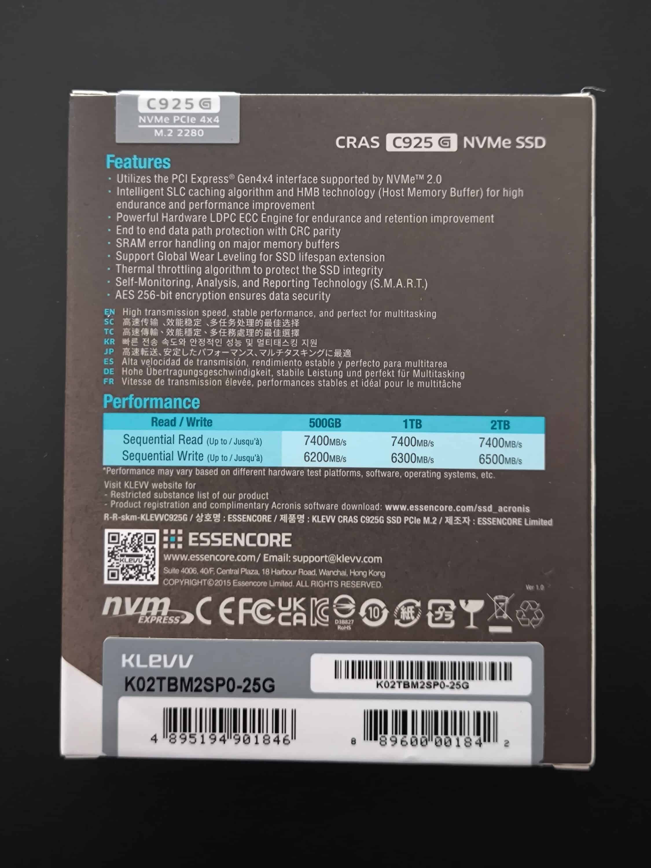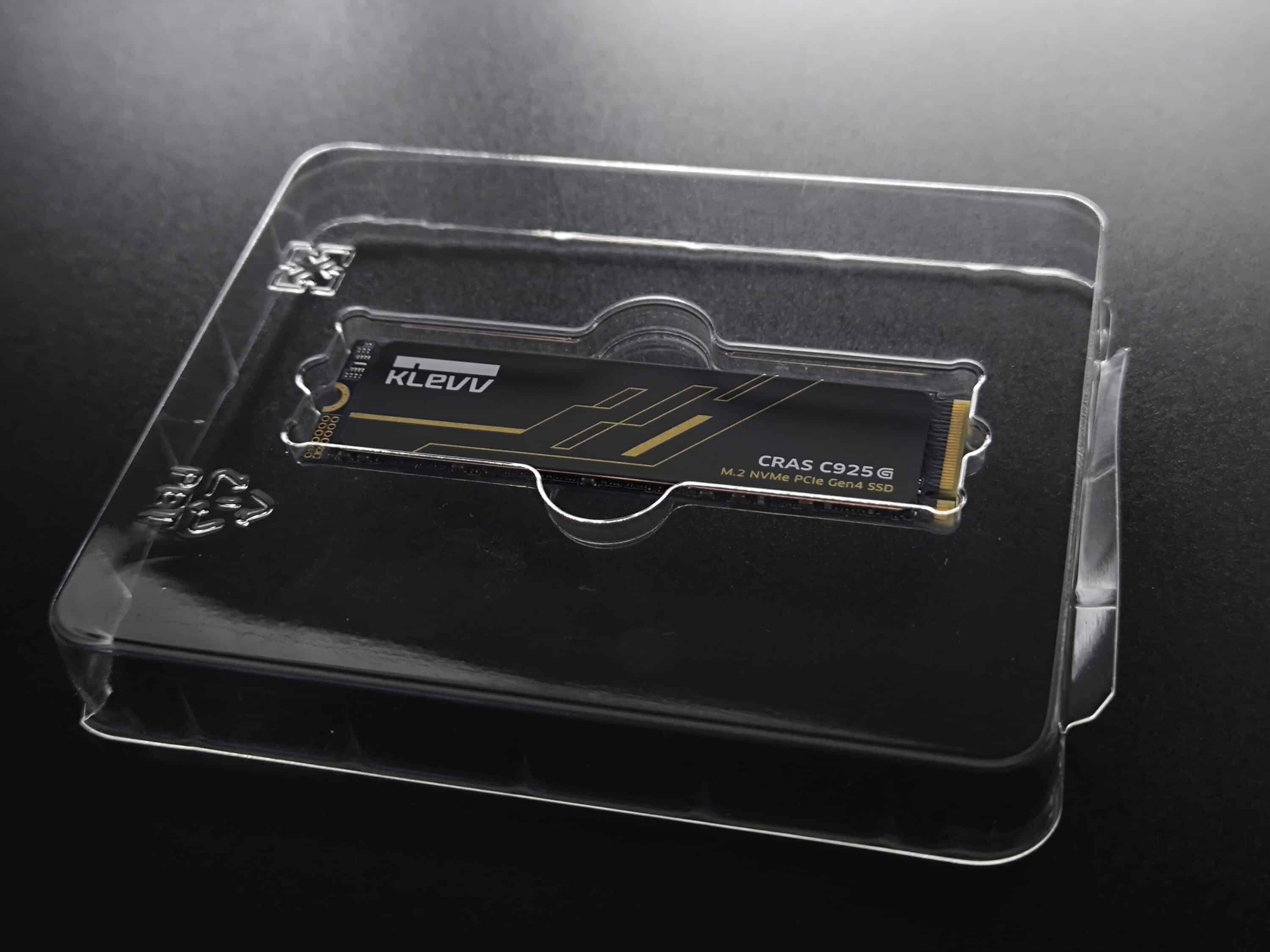 Die KLEVV CRAS C925G kommt mit 2 TB Speicherplatz in einer auffälligen Verpackung im Farbmix aus Weiß, Hell- und Dunkelbraun daher. Eine durchsichtige Plastikhülle dient zum Schutz vor eventuellen Transportschäden. Sonstiges Zubehör bzw. schriftliche Unterlagen finden sich nicht im Verpackungsinhalt.